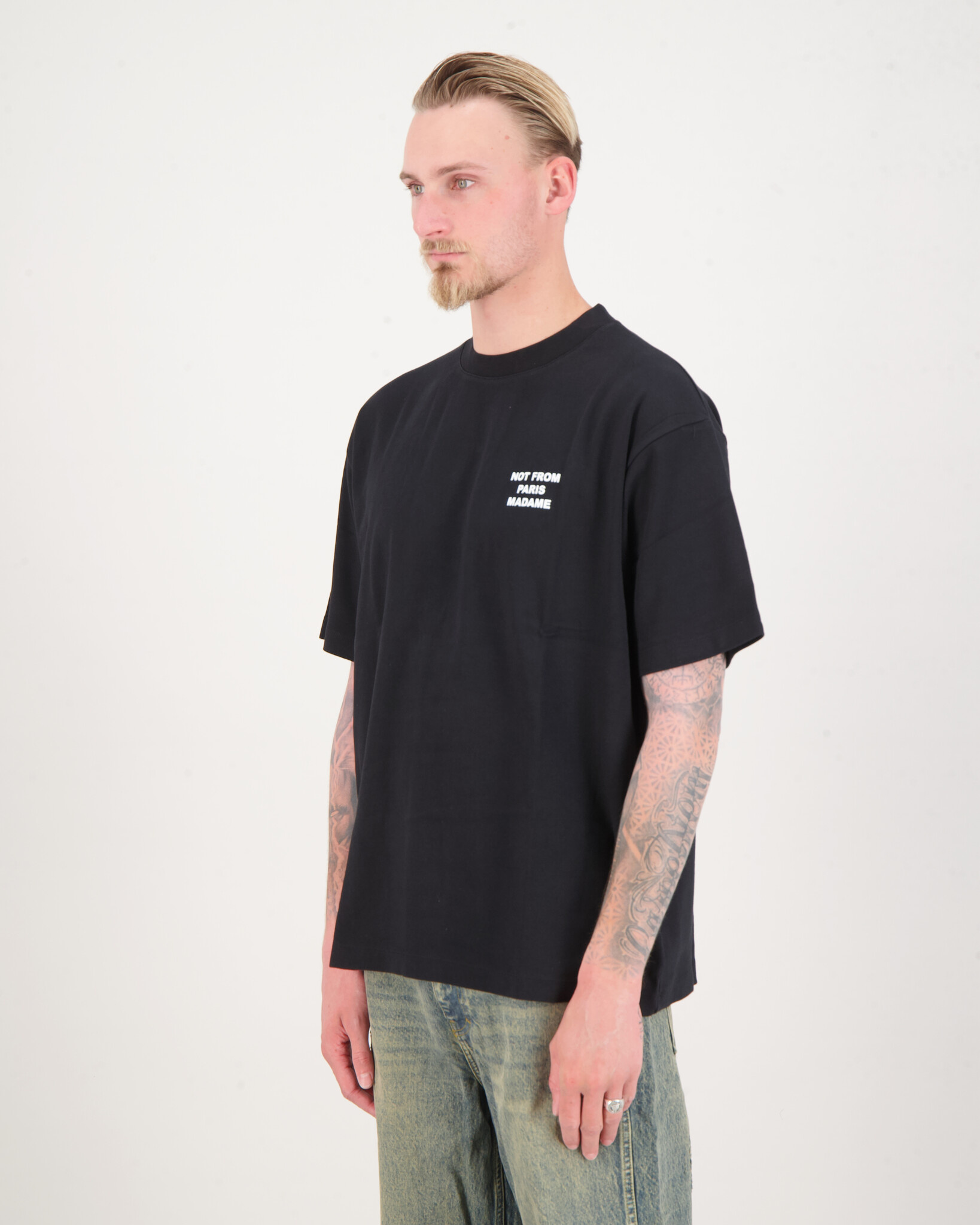 Zwarte 'Le T-Shirt Slogan' van het merk Drôle de Monsieur. Het t-shirt met een geribde halslijn is bedrukt met de 'Not From Paris Madame' slogan.
