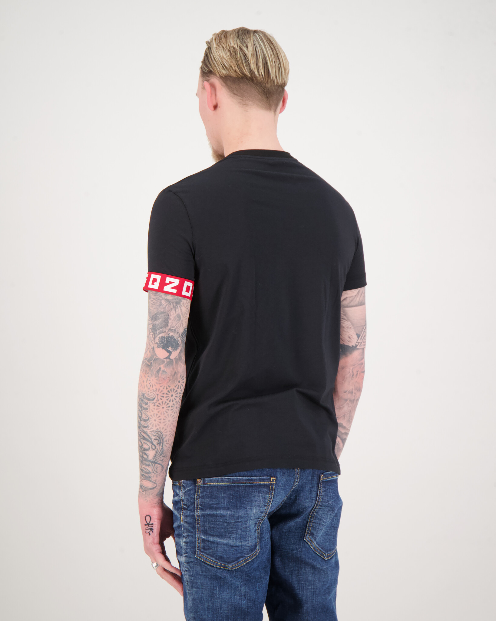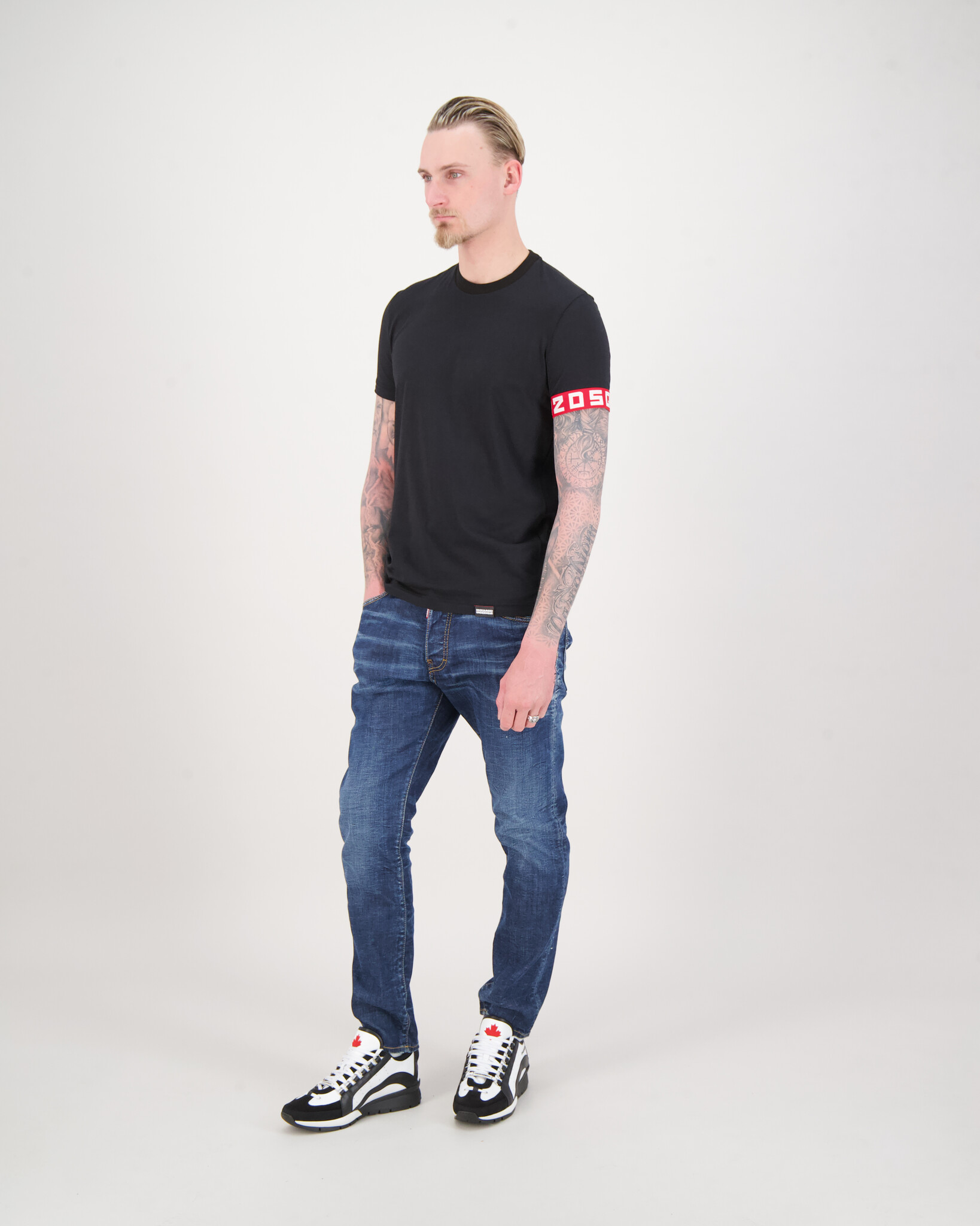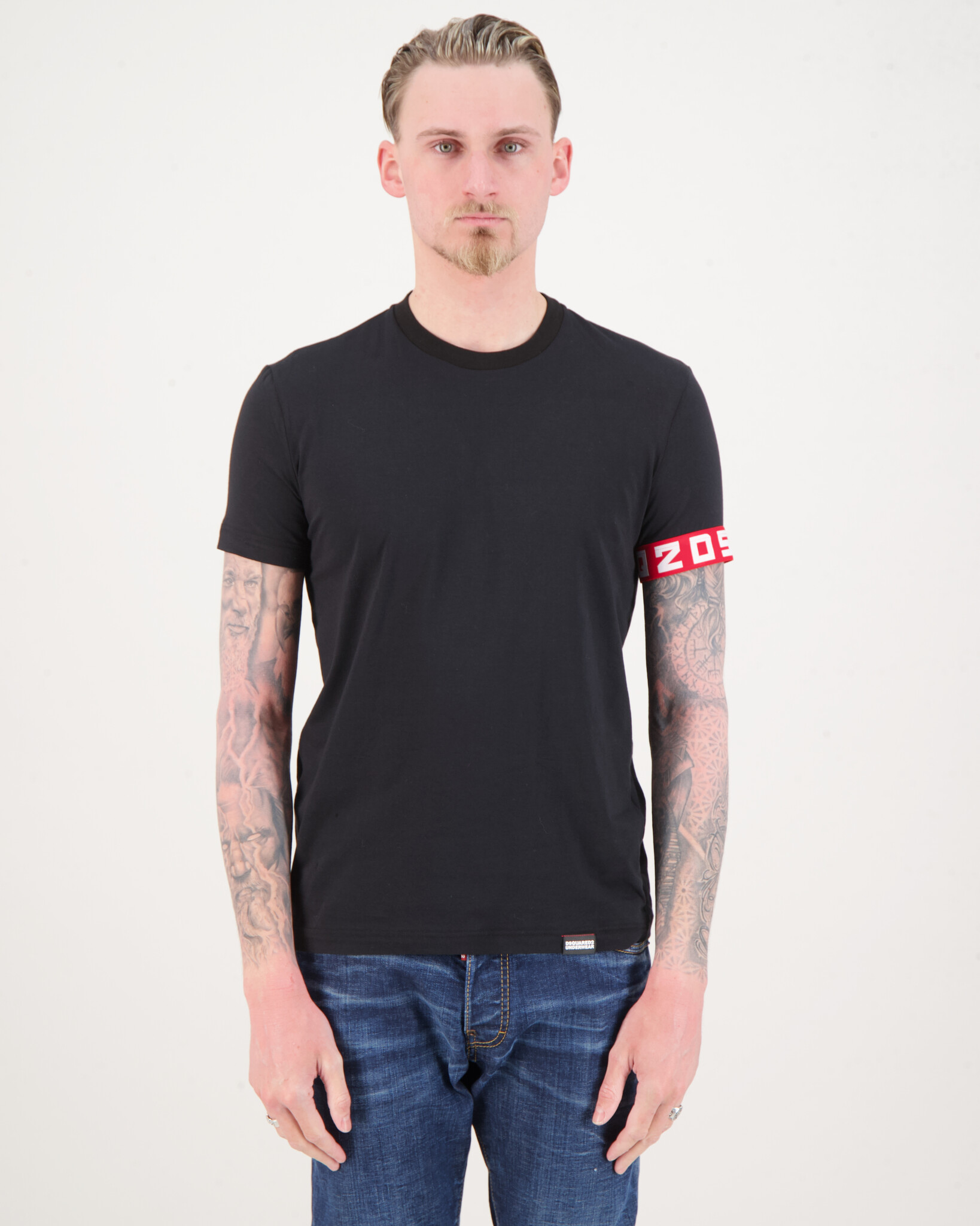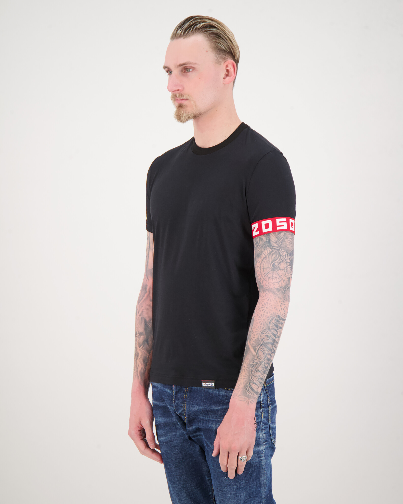 Zwarte Round Neck Logo T-shirt van het merk Dsquared2. Rode band om de linkerarm met 'DSQ2'.
