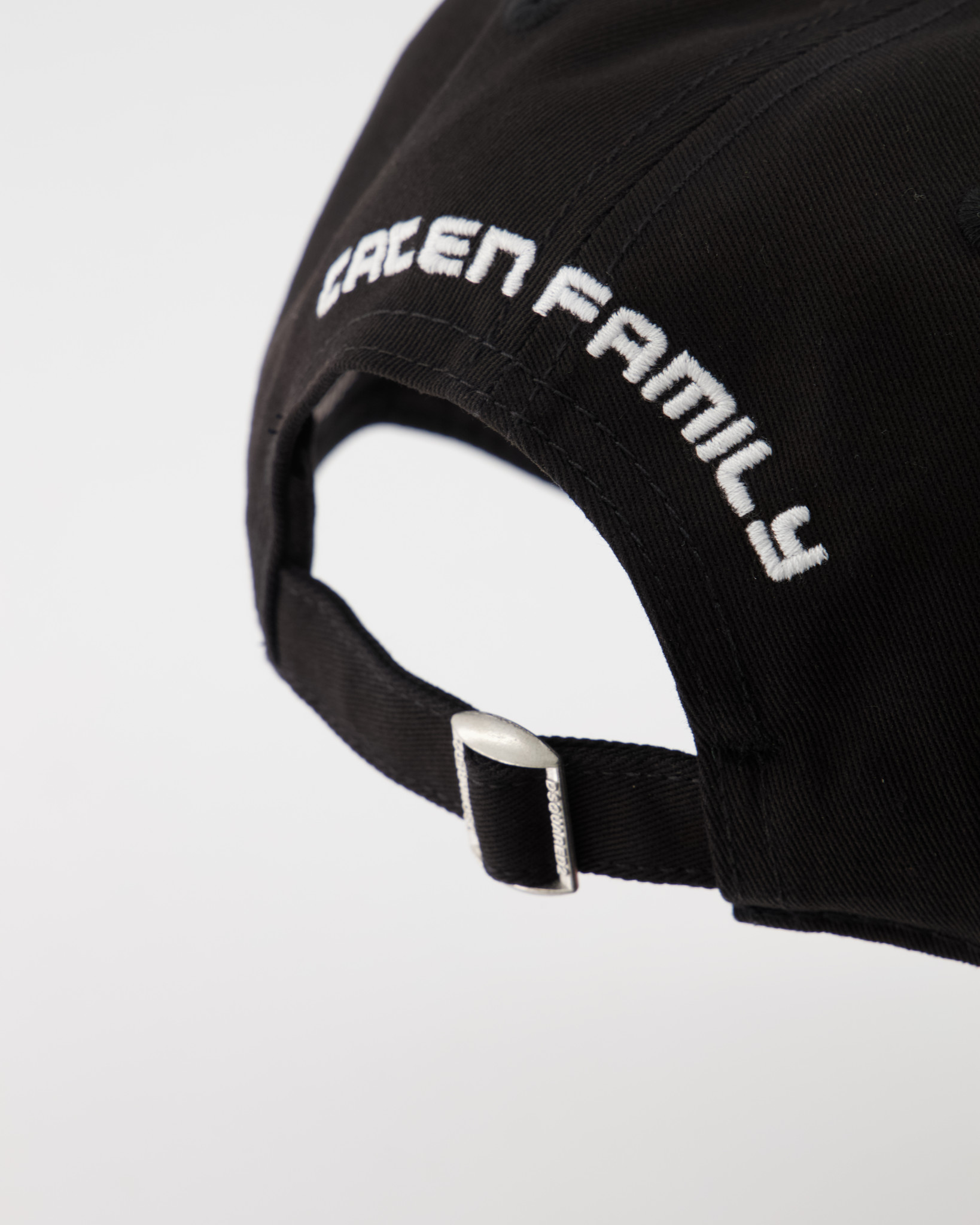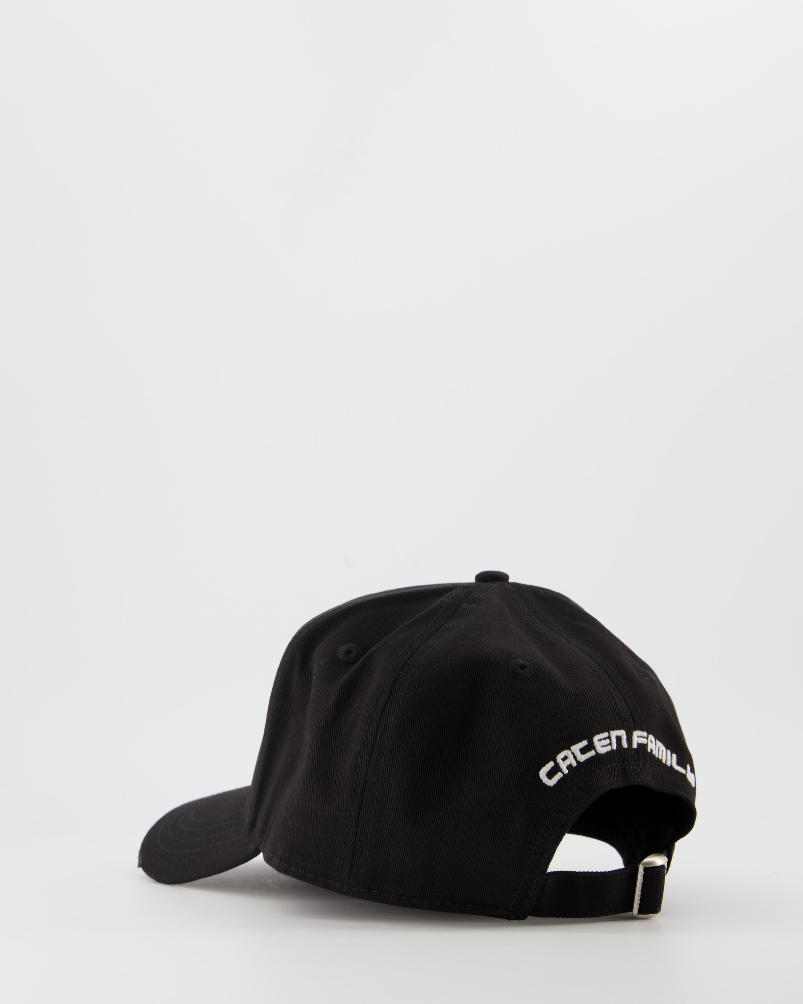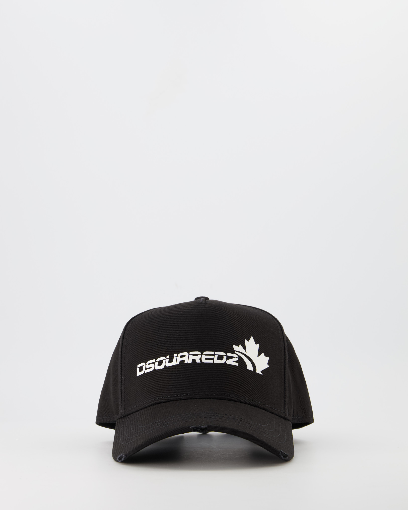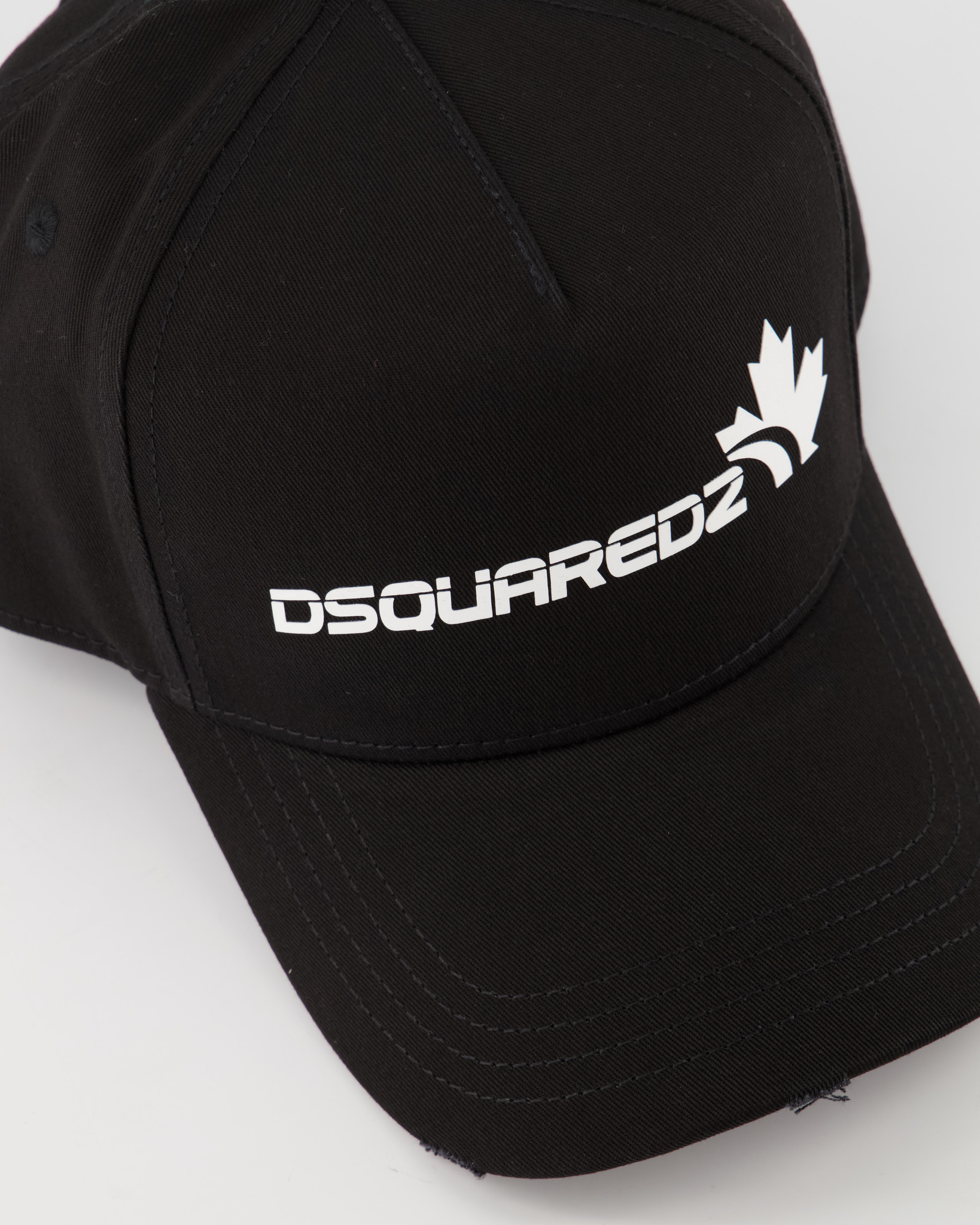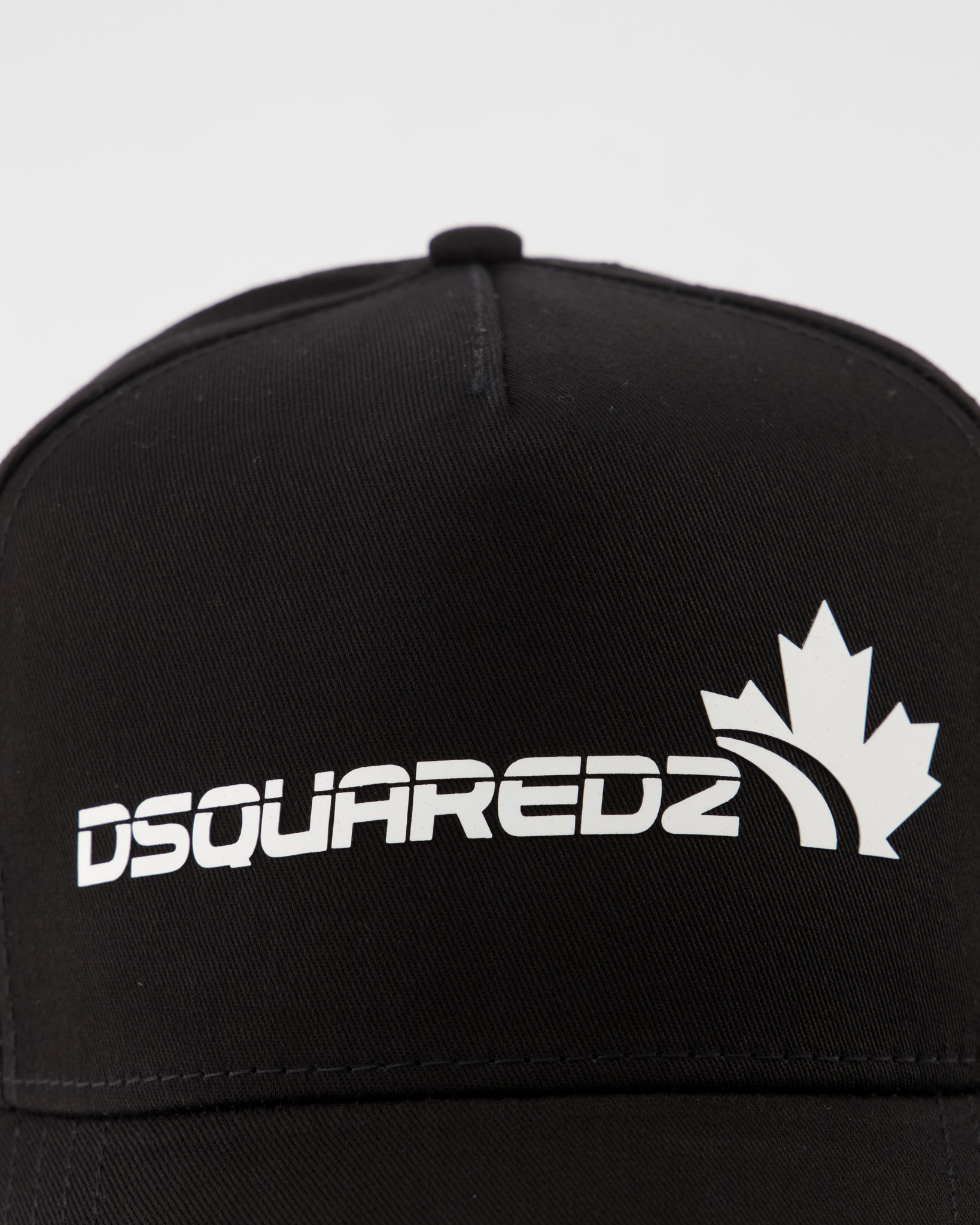 Zwarte Leaf Logo Baseball Caps van het merk Dsquared2. De pet heeft op de voorzijde een logo met witte letters en het bekende Leaf-logo, een verstelbare sluiting en op de achterzijde de tekst "DEAN & DAN CATEN" met witte letters.