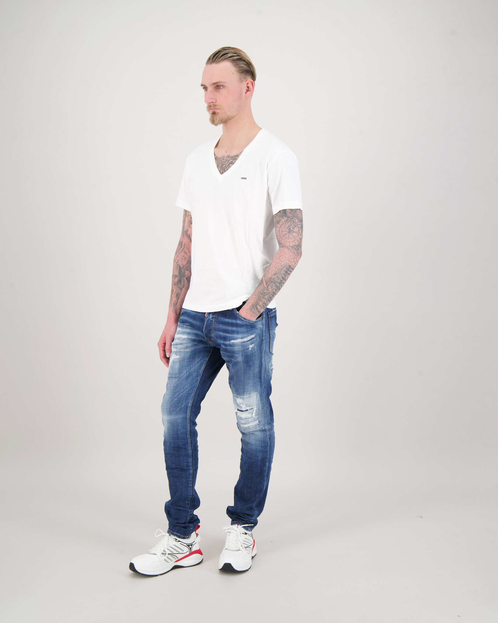 Witte ' Metallic Logo V-Hals T-Shirt ' van het merk Dsquared2. Het T-shirt heeft een V hals, korte mouwen en in matellic dsquared2 op de borst.