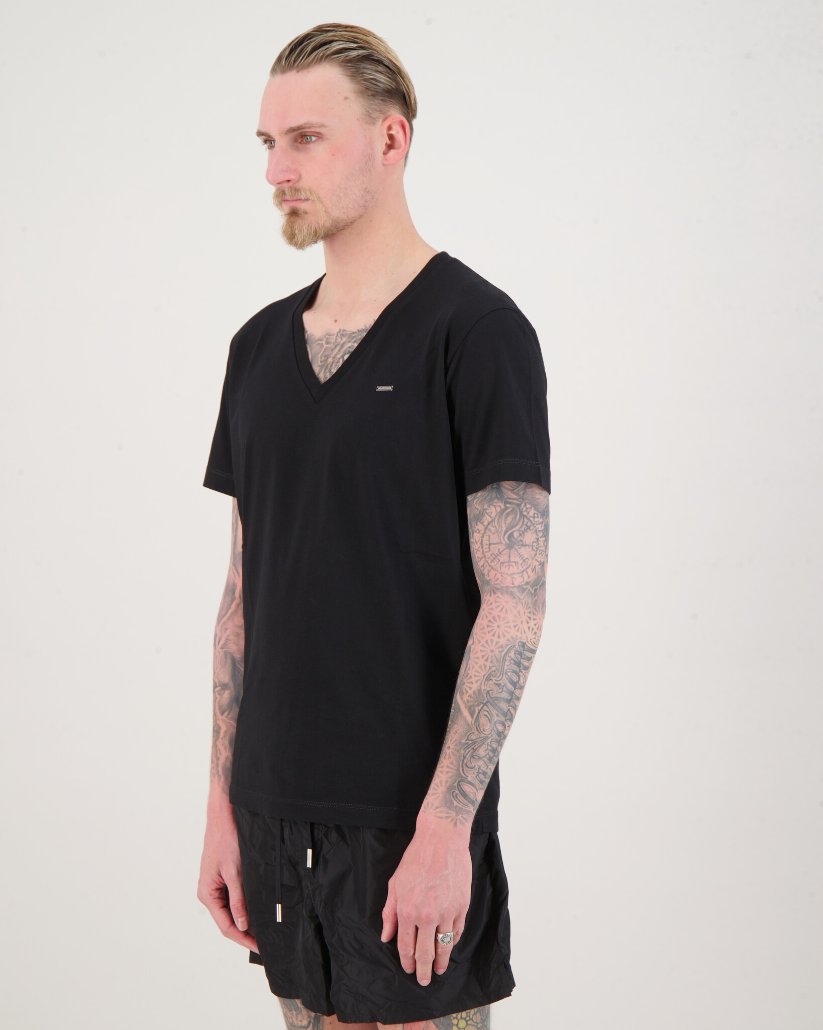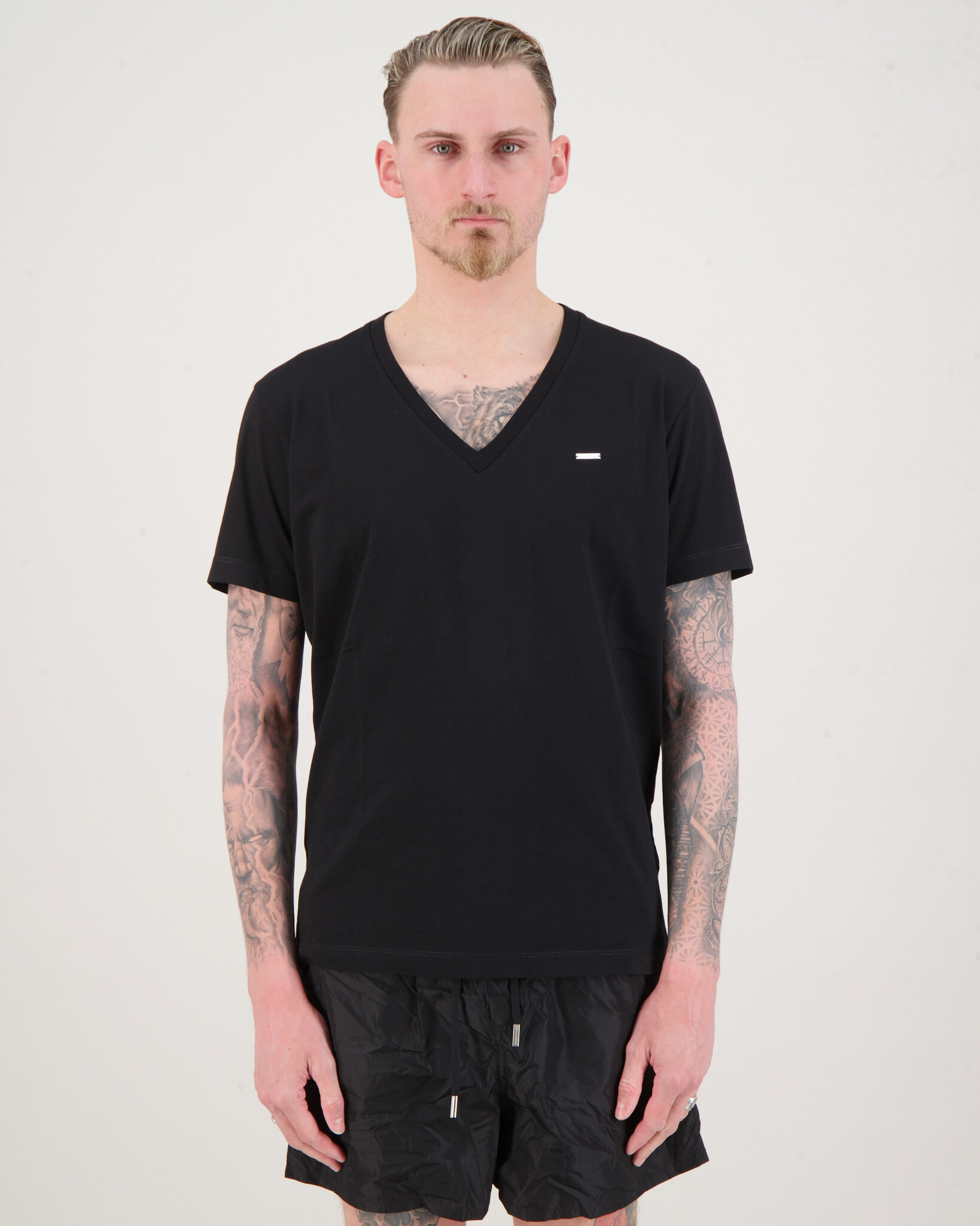 Zwarte ' Metallic Logo V-Hals T-Shirt ' van het merk Dsquared2. Het T-shirt heeft een V hals, korte mouwen en in matellic dsquared2 op de borst.