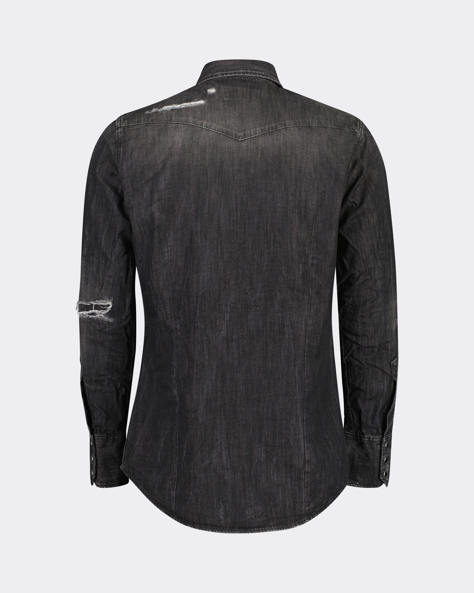 Zwarte New Western Jeans Shirt van het merk Dsquared2. Dit spijkeroverhemd heeft een nauwsluitende fit en een damaged look. Bij de knoopjes zit het bekende grijze logo.