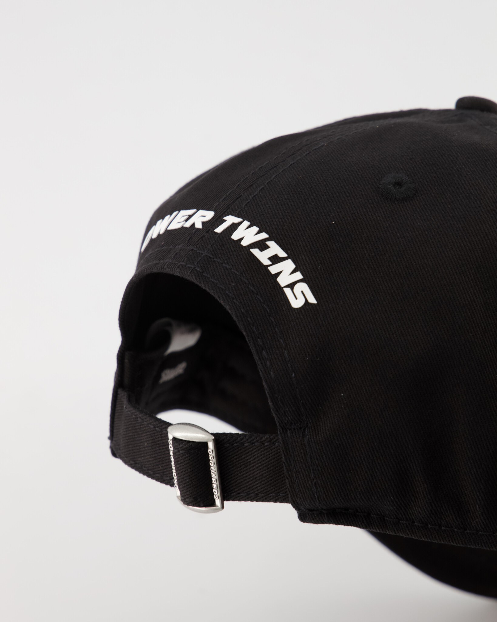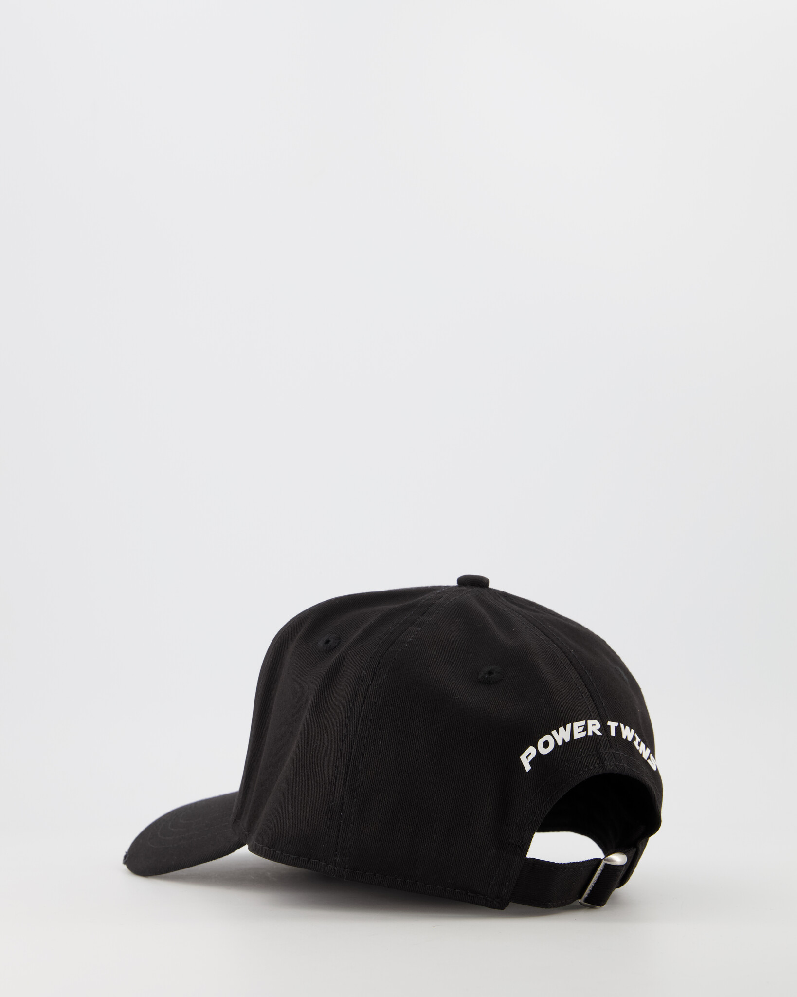 Zwarte Other Baseball Caps van het merk Dsquared2. De pet heeft op de voorzijde de tekst DSQUARED2 in het Wit, licht versleten details op de klep, een verstelbare sluiting en op de achterzijde de tekst "POWER TWINS" gedrukt in witte letters.