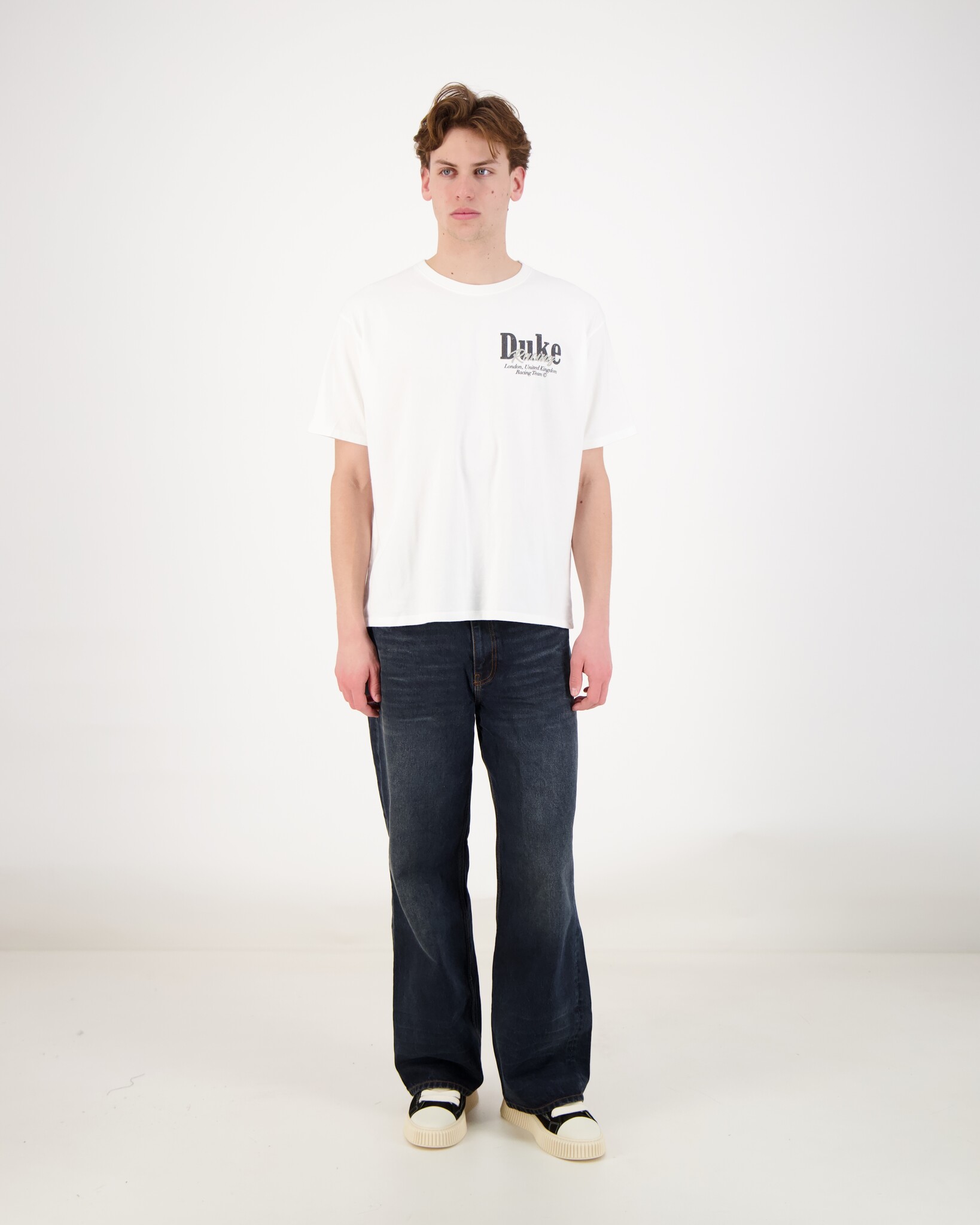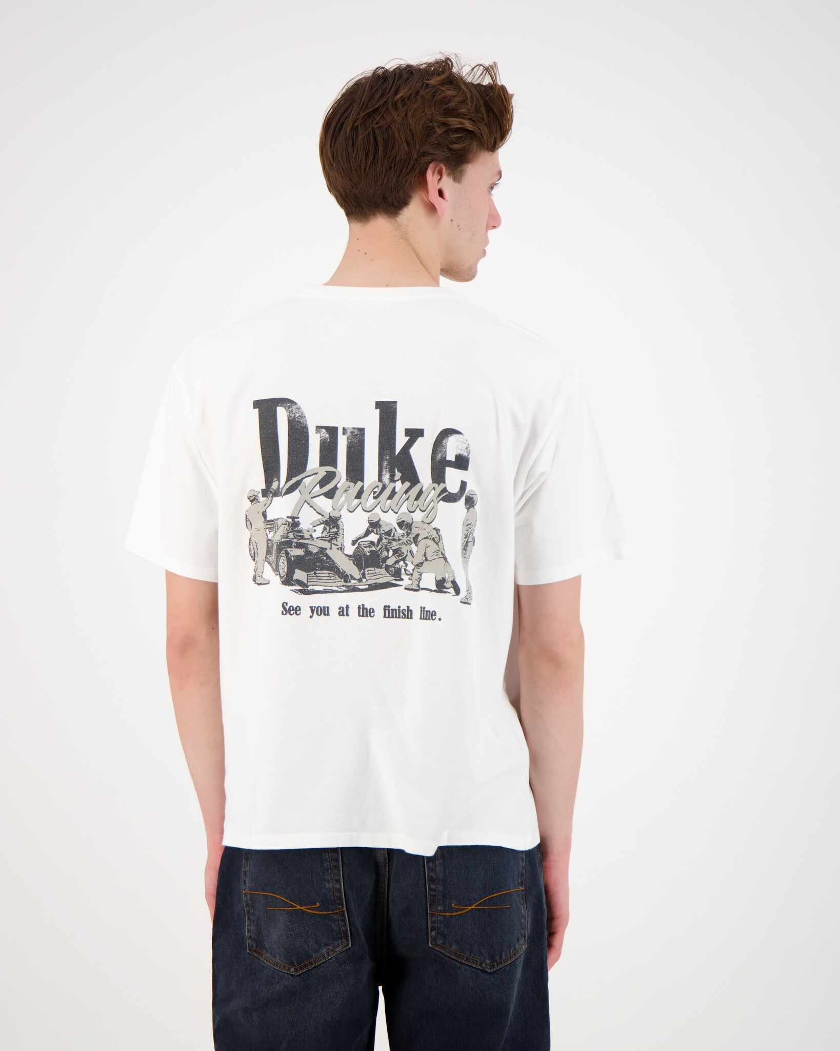 Witte DR Grey Pit Stop Vintage T-Shirt van het merk Duke + Dexter. T-shirtje gemaakt van 220 grams katoen waardoor hij lekker stevig is en comfortabel zit. Grijze grafische print voor en achter met een vintage effect.