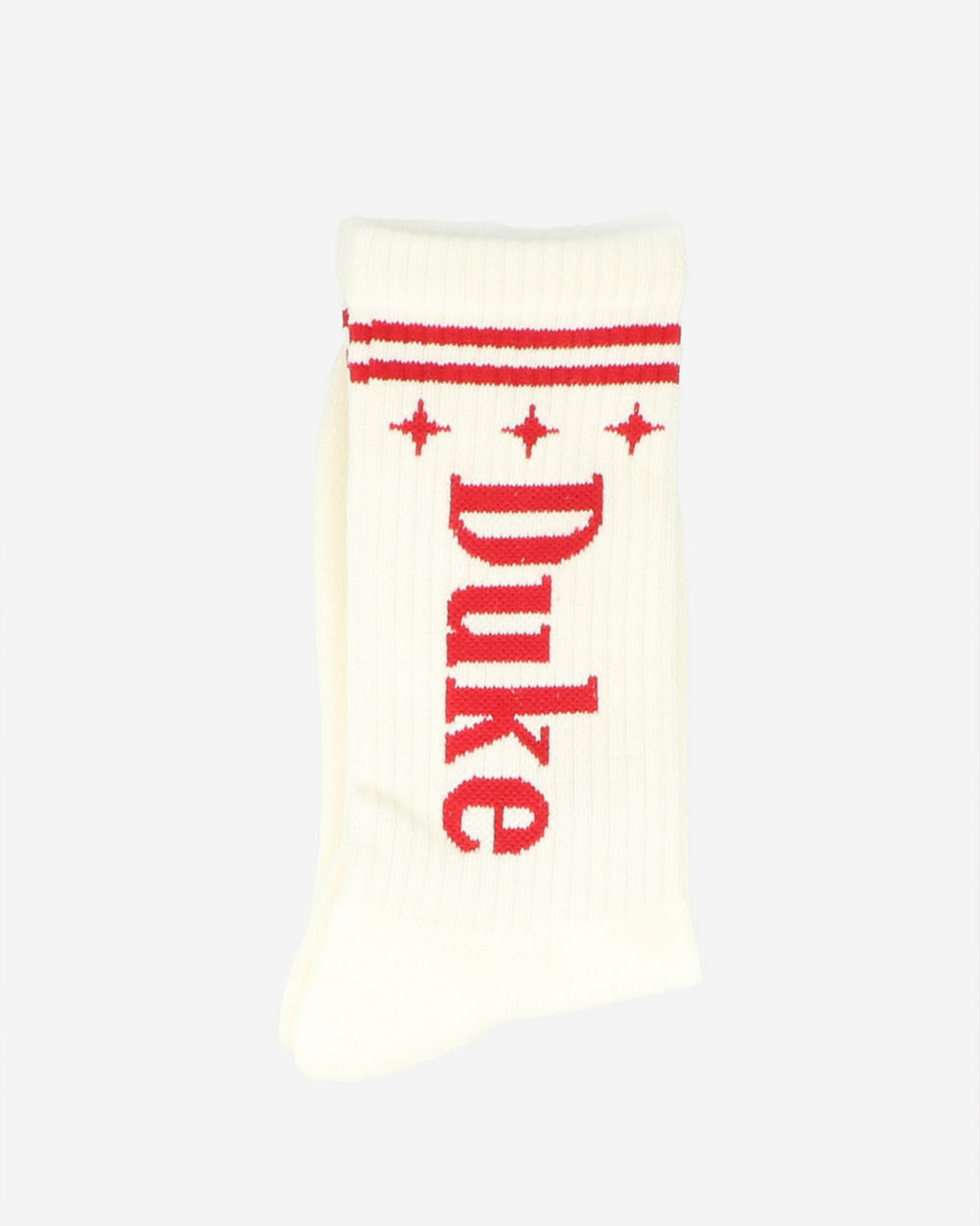 Wit/Rode DWR Sokken van het merk Duke + Dexter. Deze sokken hebben horizontaal "Duke" staan en onderop de sok staat uitgeschreven Duke+Dexter. Ideale sokken voor een festival of vakantie voor onder een korte broek in combinatie met een leuk t-shirtje van Duke + Dexter!