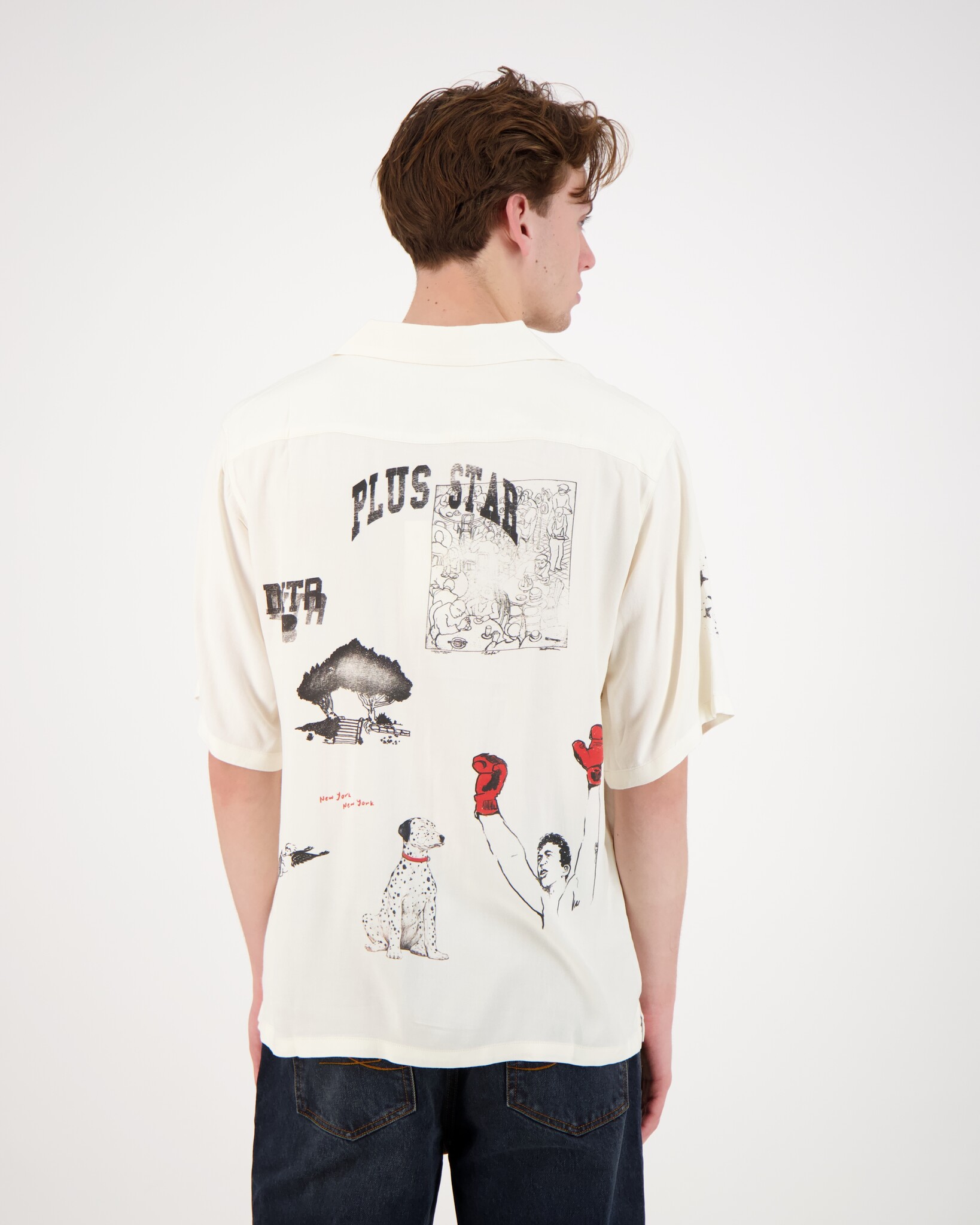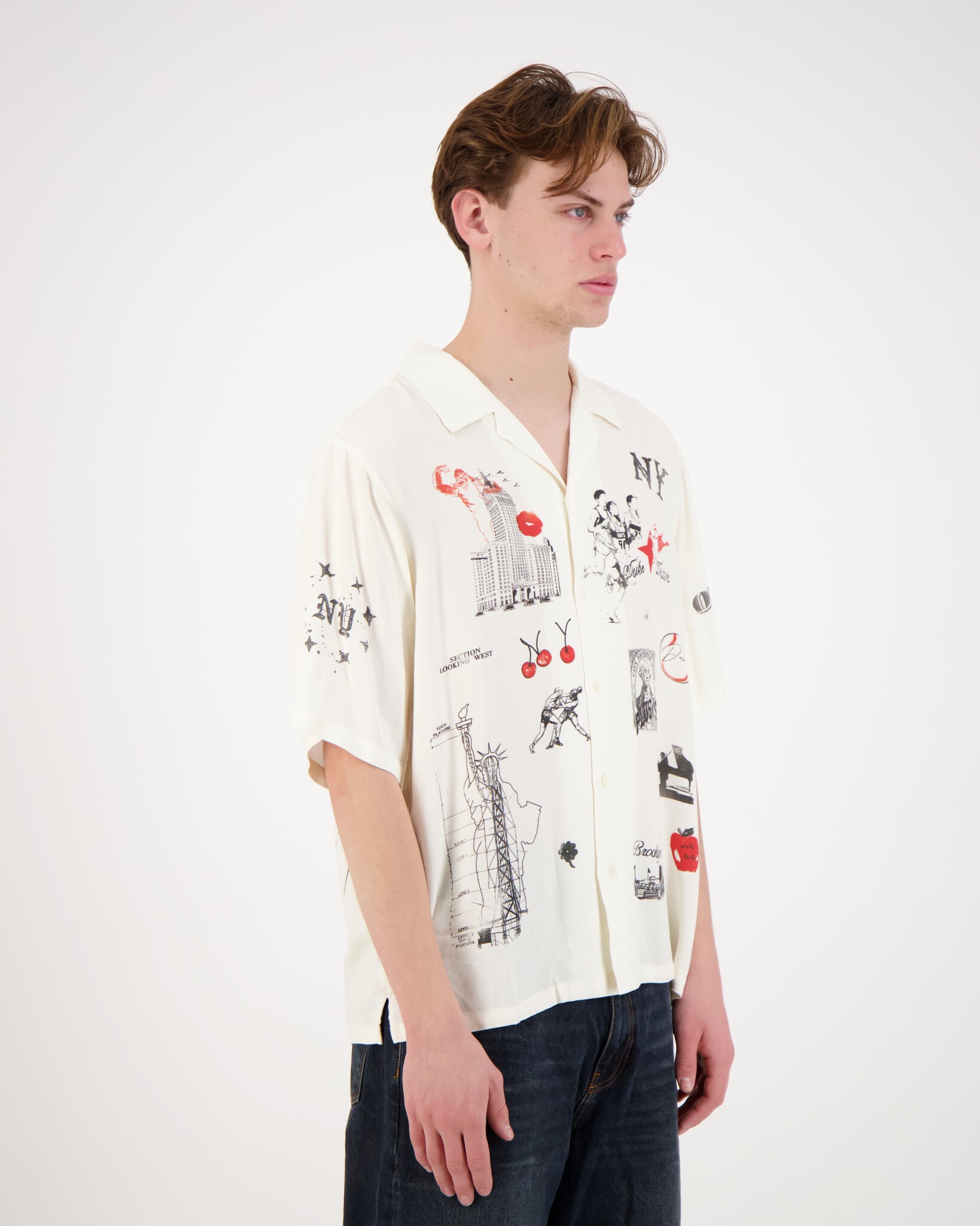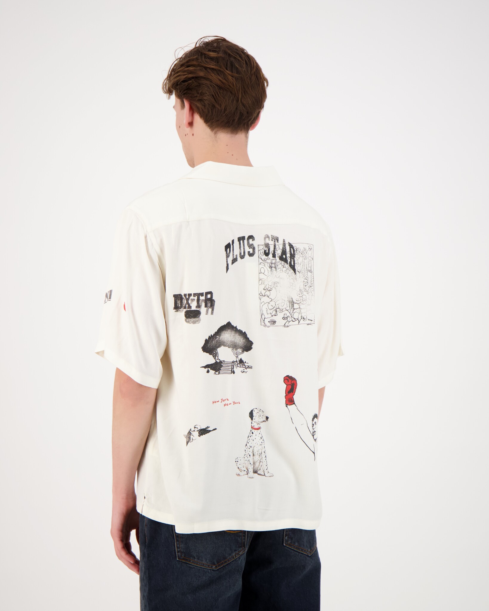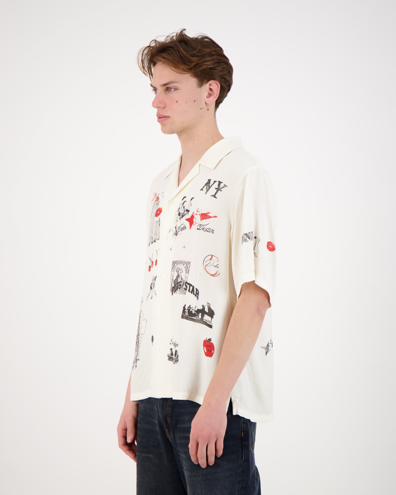 Witte NY Sketch Vintage Shirt van het merk Duke + Dexter. Dit Vintage shirt heeft verschillende prints. Gemaakt van 100% Rayon en dat staat bekend als een soepele, ademende en zachte stof met een zijdeachtige glans. Rayon wordt vaak gebruikt voor comfortabele zomerkleding vanwege het verkoelende effect op de huid.