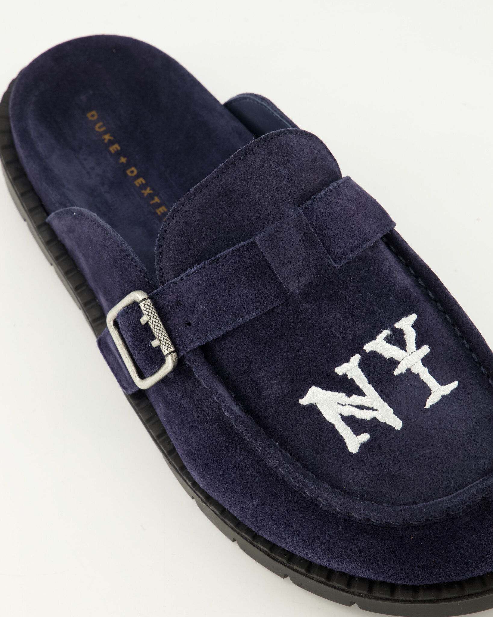 Marine Winston NY Navy Suede Mule van het merk Duke + Dexter. Deze Winston-mules zijn geborduurd met de initialen van een van onze favoriete steden ter wereld: New York. Dit paar is perfect om overal mee naartoe te dragen. Ze zijn handgemaakt in Portugal van zacht, marineblauw suède en hebben een binnenzool die zich naar je voeten vormt. Tot de details behoren stalen gespen, rubberen zolen en een verborgen Plus-logo.