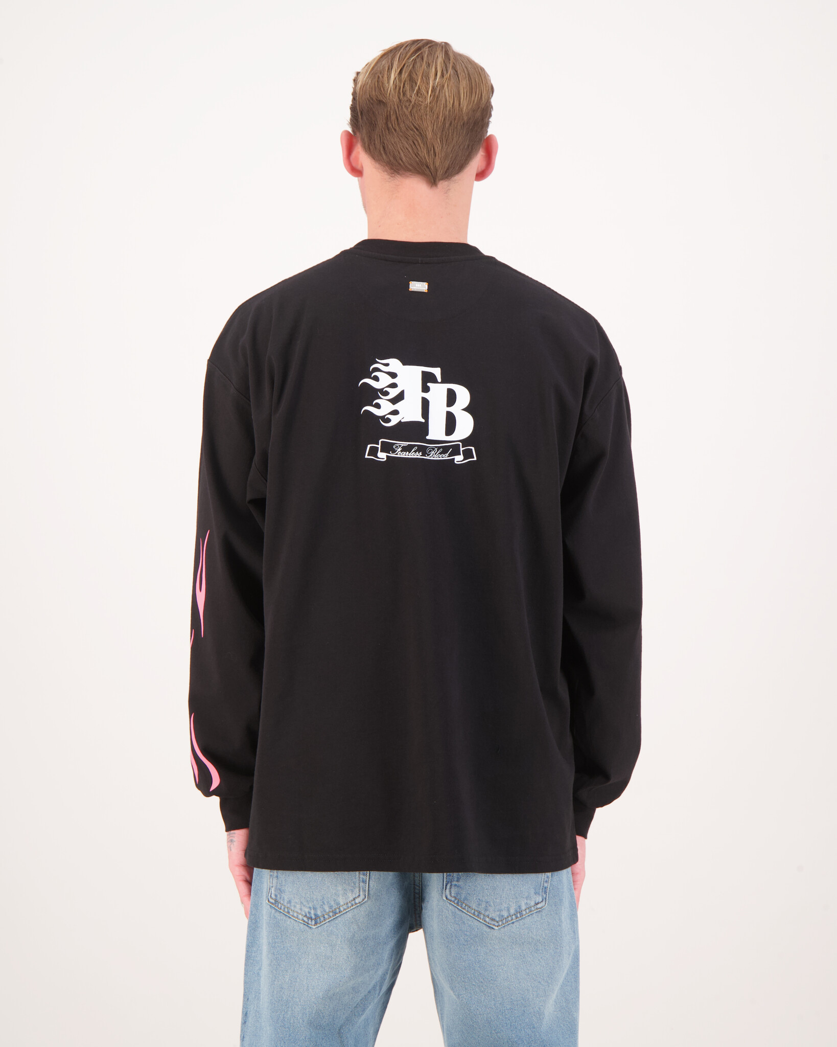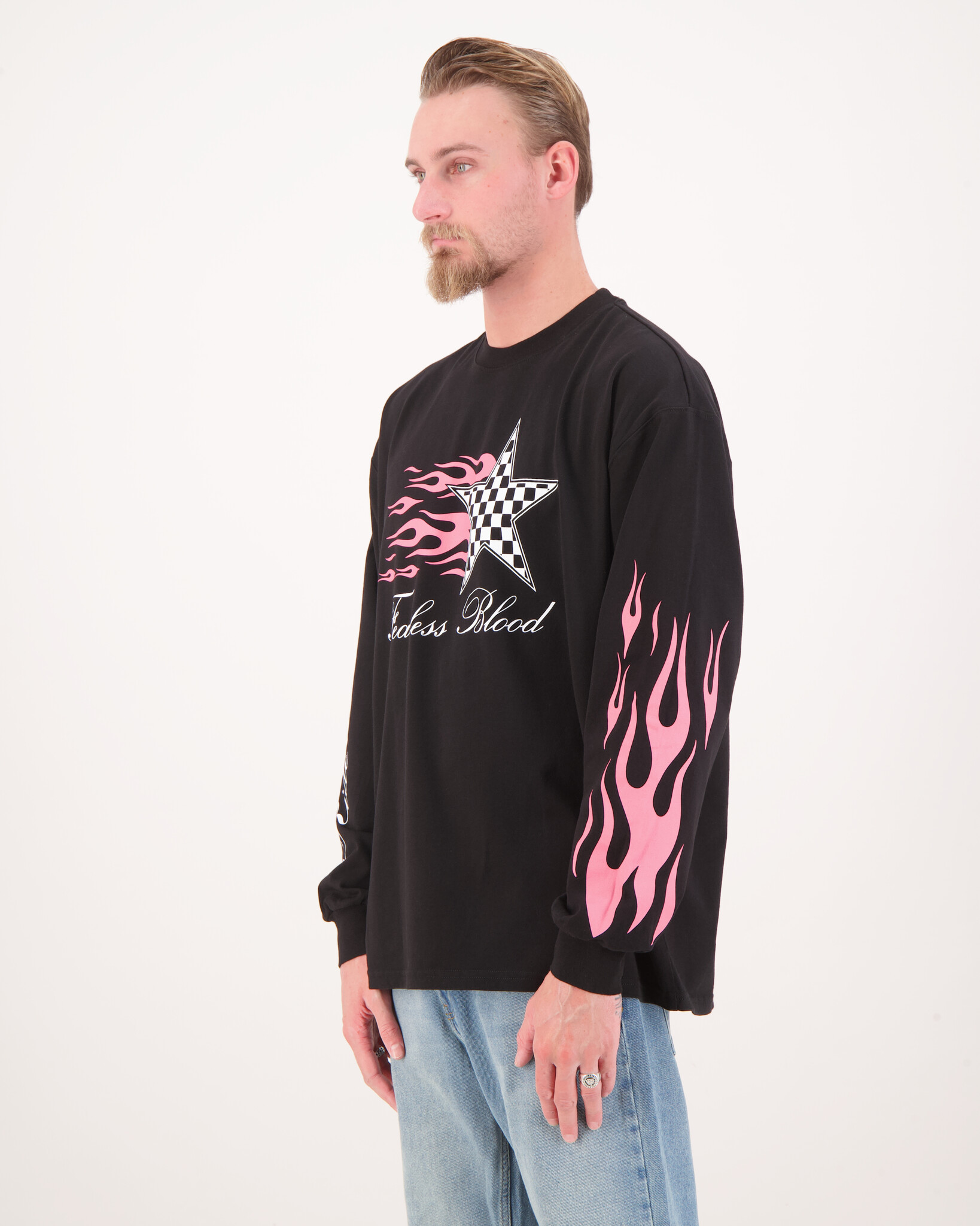 De Zwarte Gino Longsleeve van Fearless Blood combineert een stoere streetwear-look met hoogwaardige kwaliteit. De oversized fit van Kartoen zorgt voor comfort en een modern silhouet. Opvallende graphics zoals roze vlammen, racetrack-details en de kenmerkende “Ride or Die”-prints op de mouwen geven het shirt een gedurfde uitstraling. Een perfecte statement piece voor elke outfit.