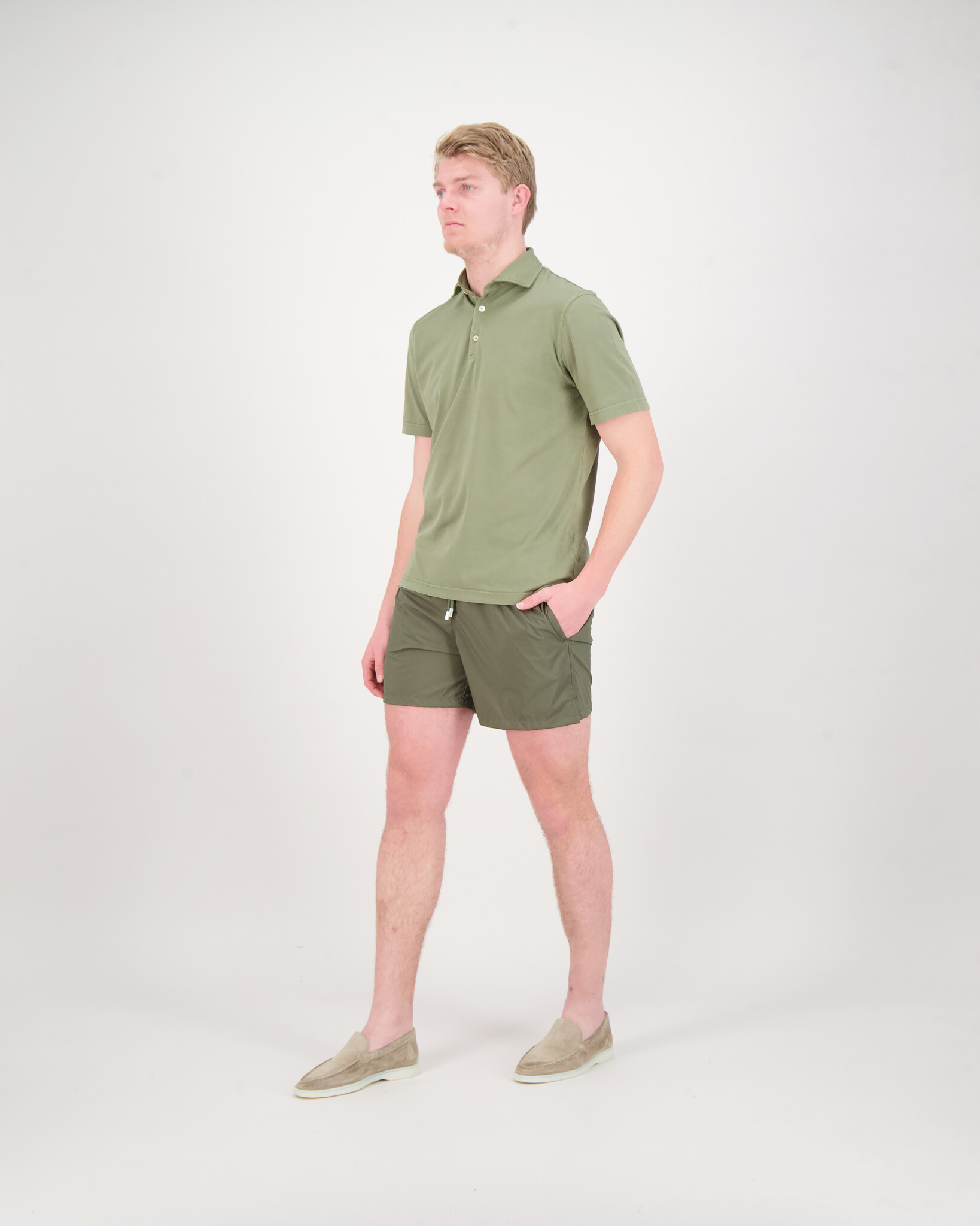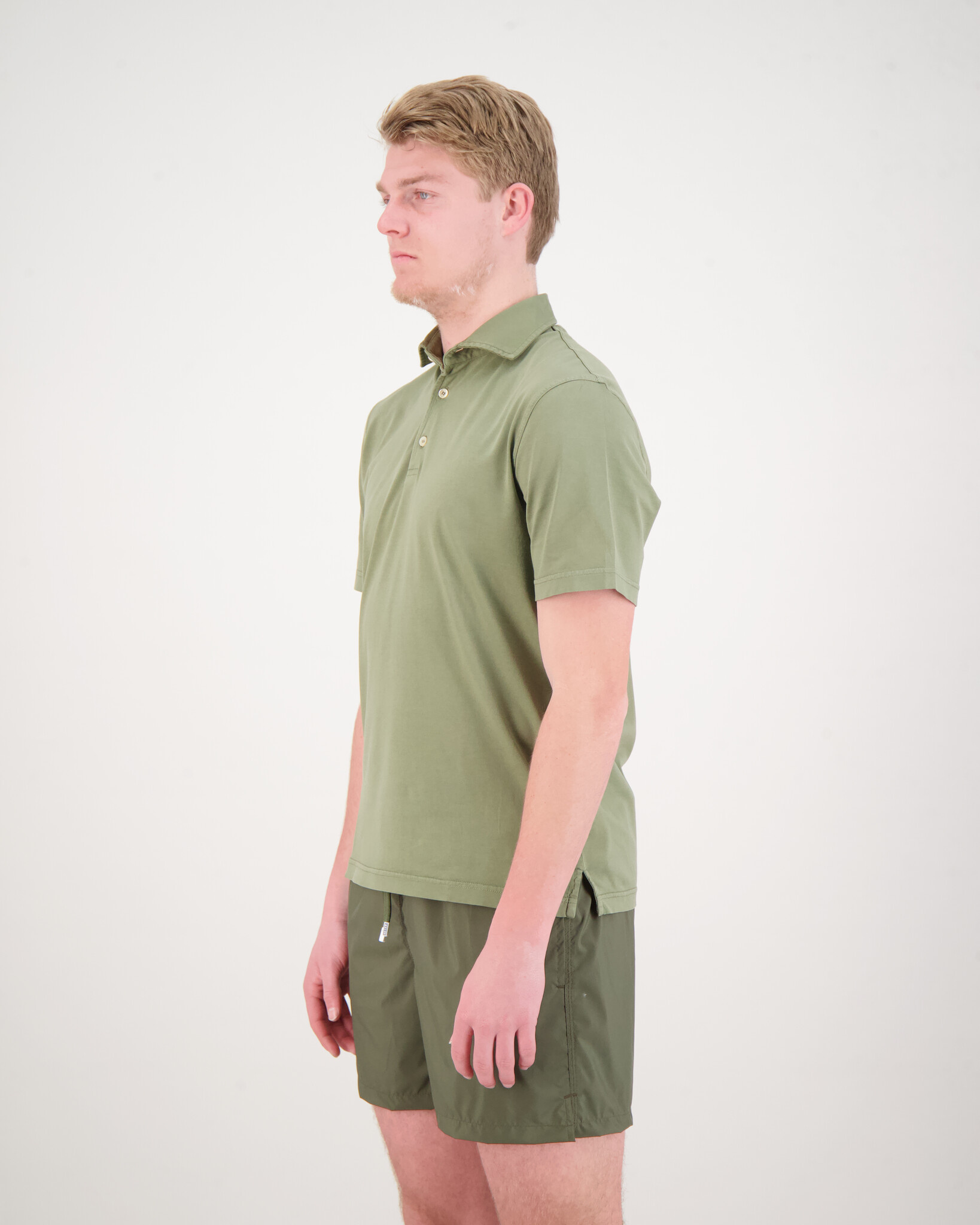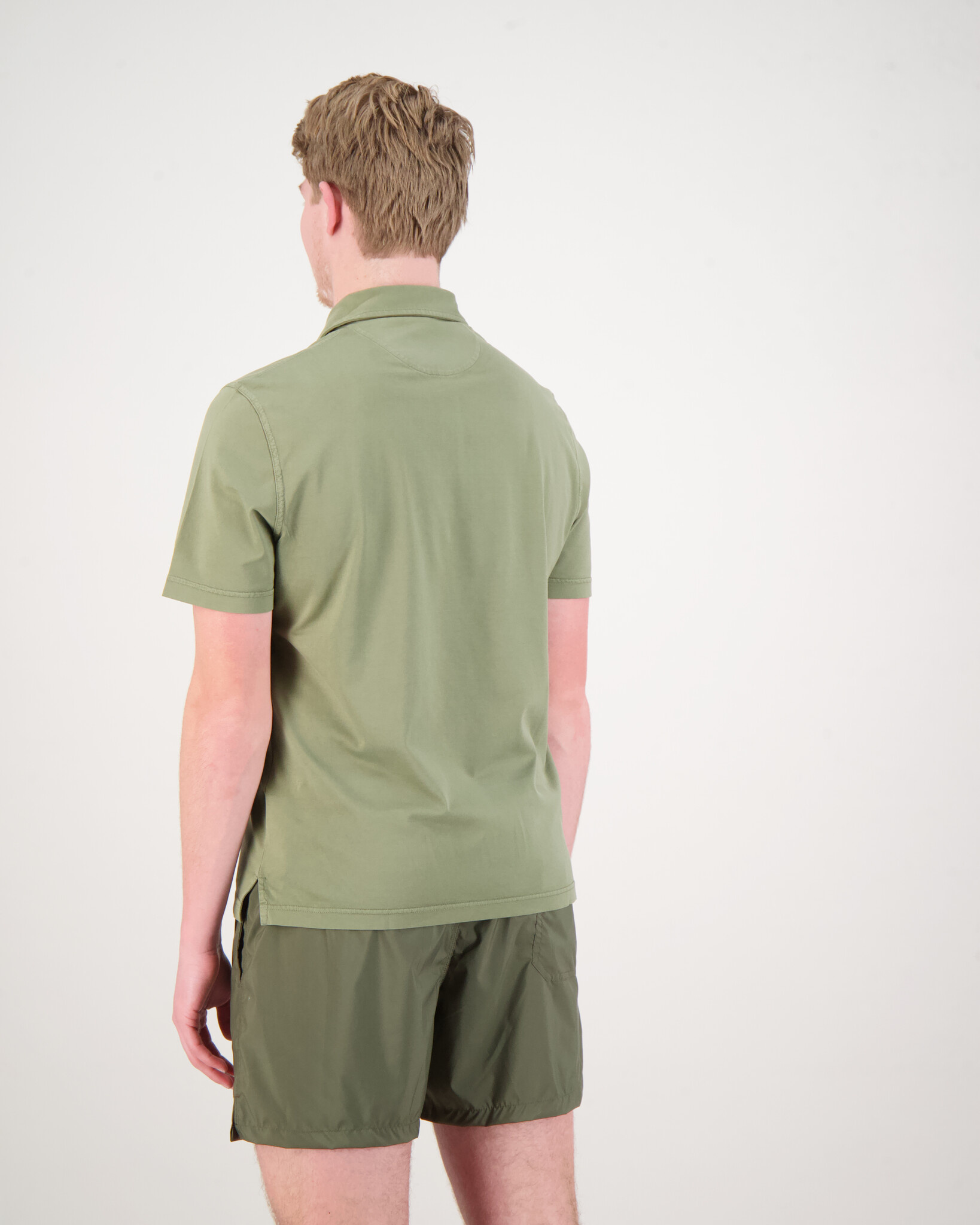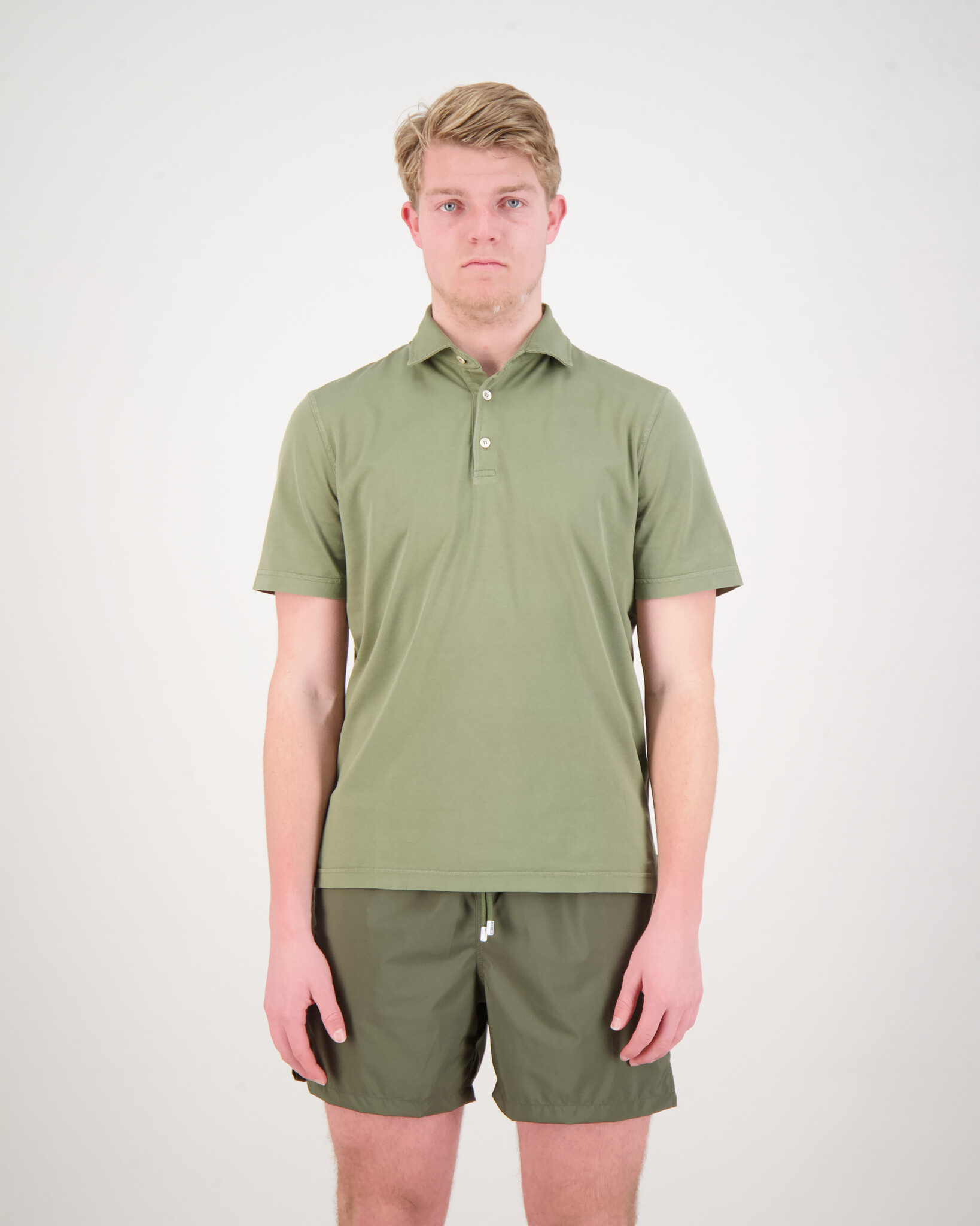 Olive Polo Shirt Knitted van het merk Fedeli. De polo heeft korte mouwen en 3 knoopjes.