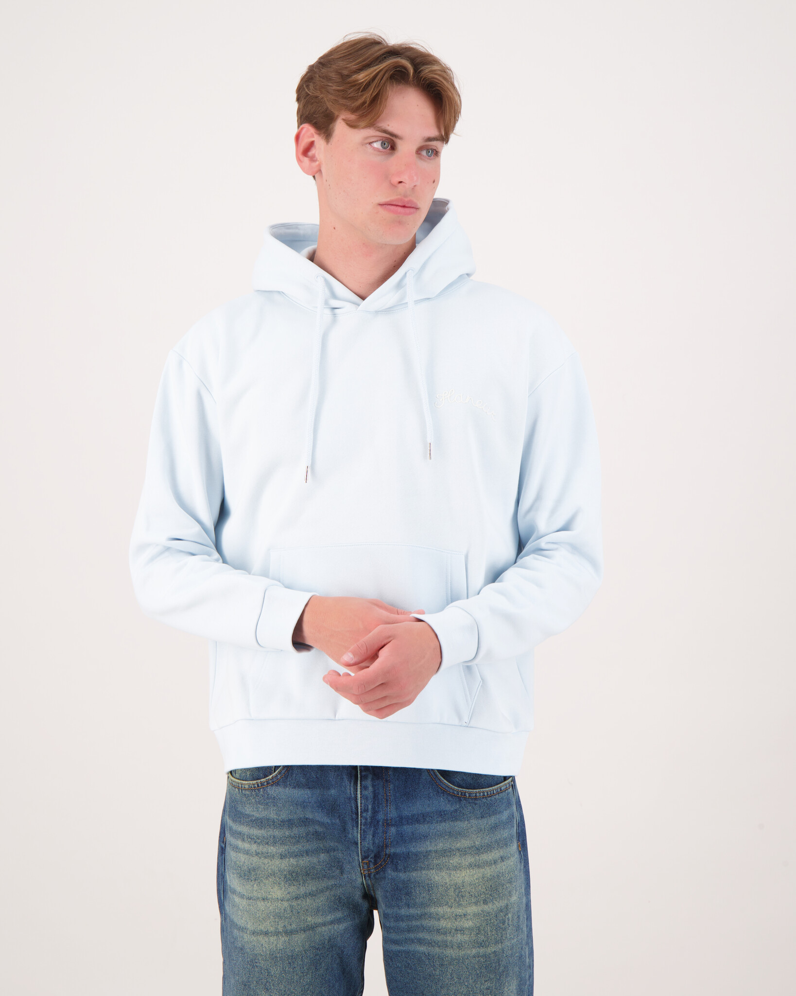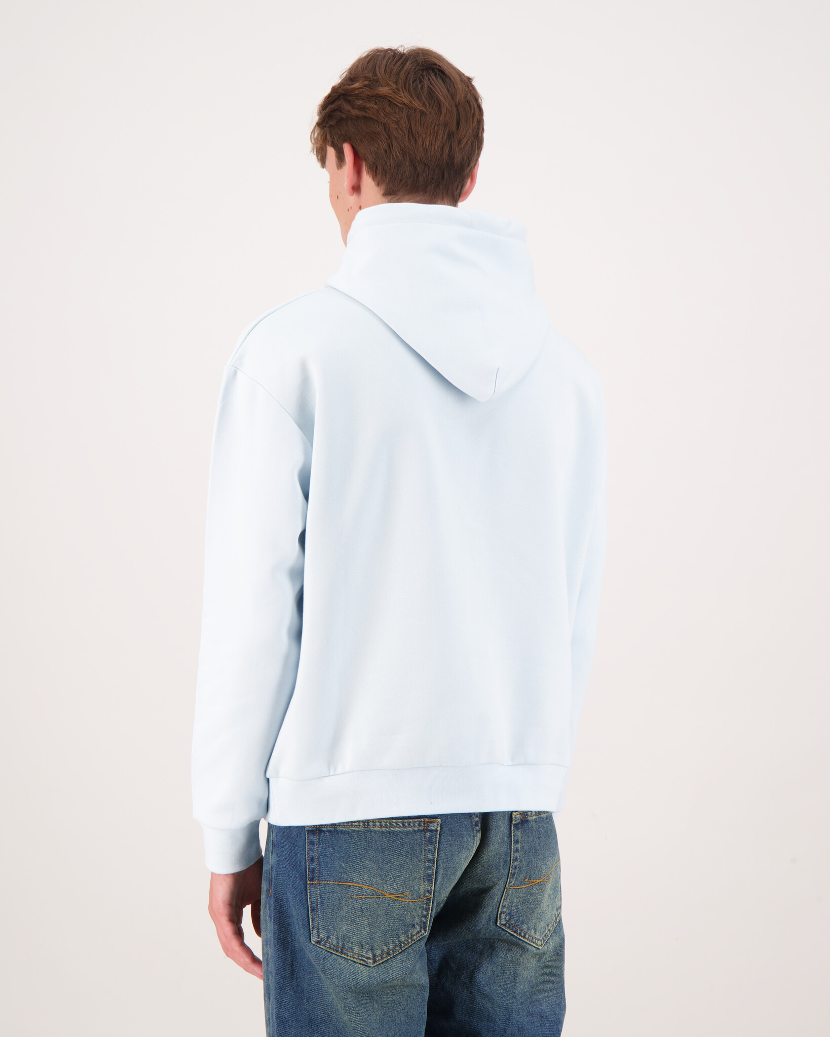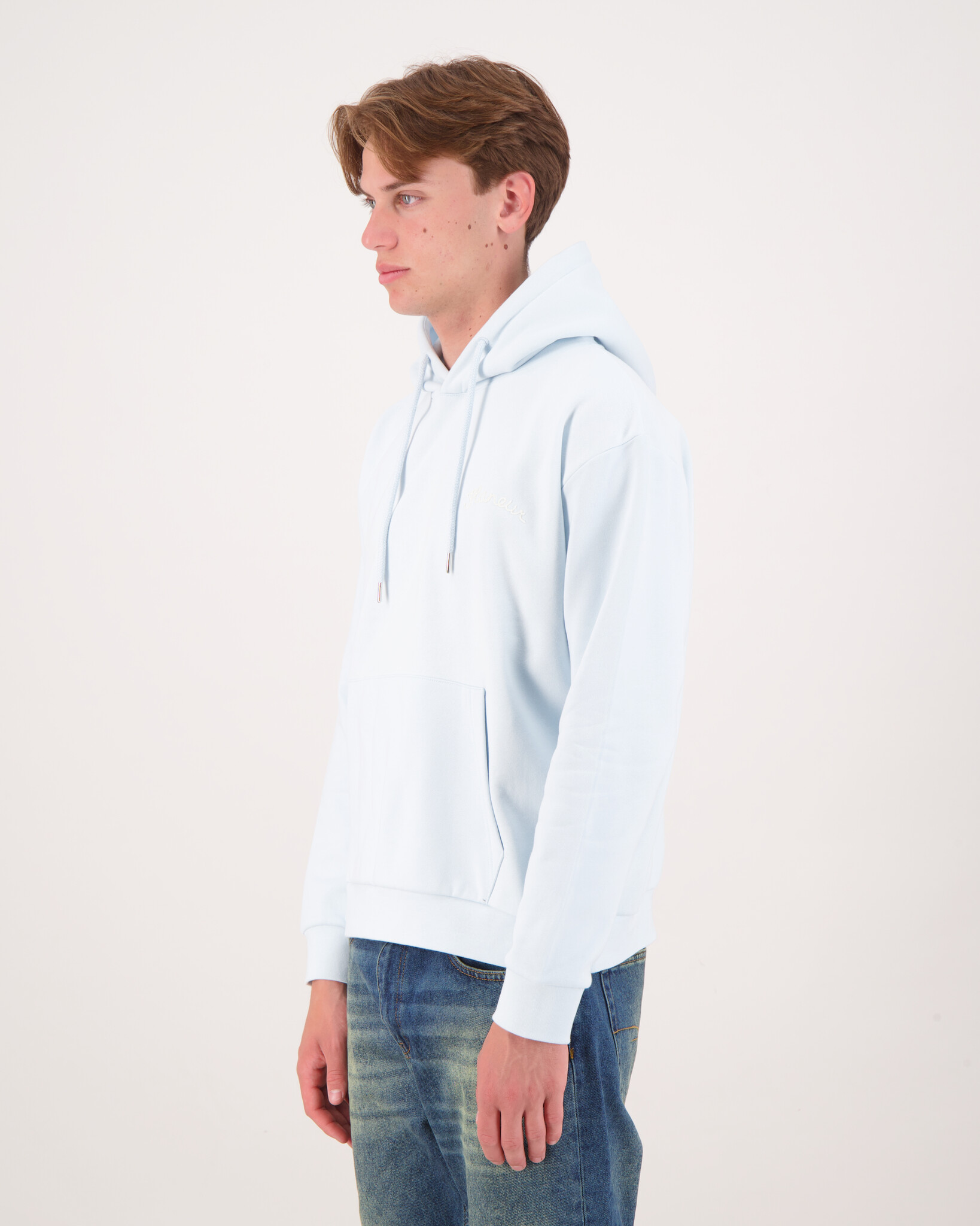 Lichtblauwe Signature Hoodie van het merk Flaneur. s een premium, stijlvol en duurzaam basic-item met verfijnde details. met een subtiel geborduurd ‘Flâneur’ Signature-logo op de linkerborst in elegante witte cursieve letters. capuchon met trekkoord en een ruime kangoeroezak (of verdeelde variant bij de zip‑versie) voor maximaal draaggemak.