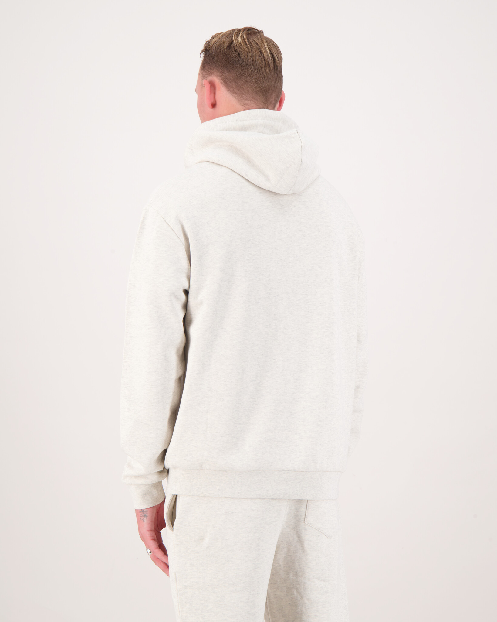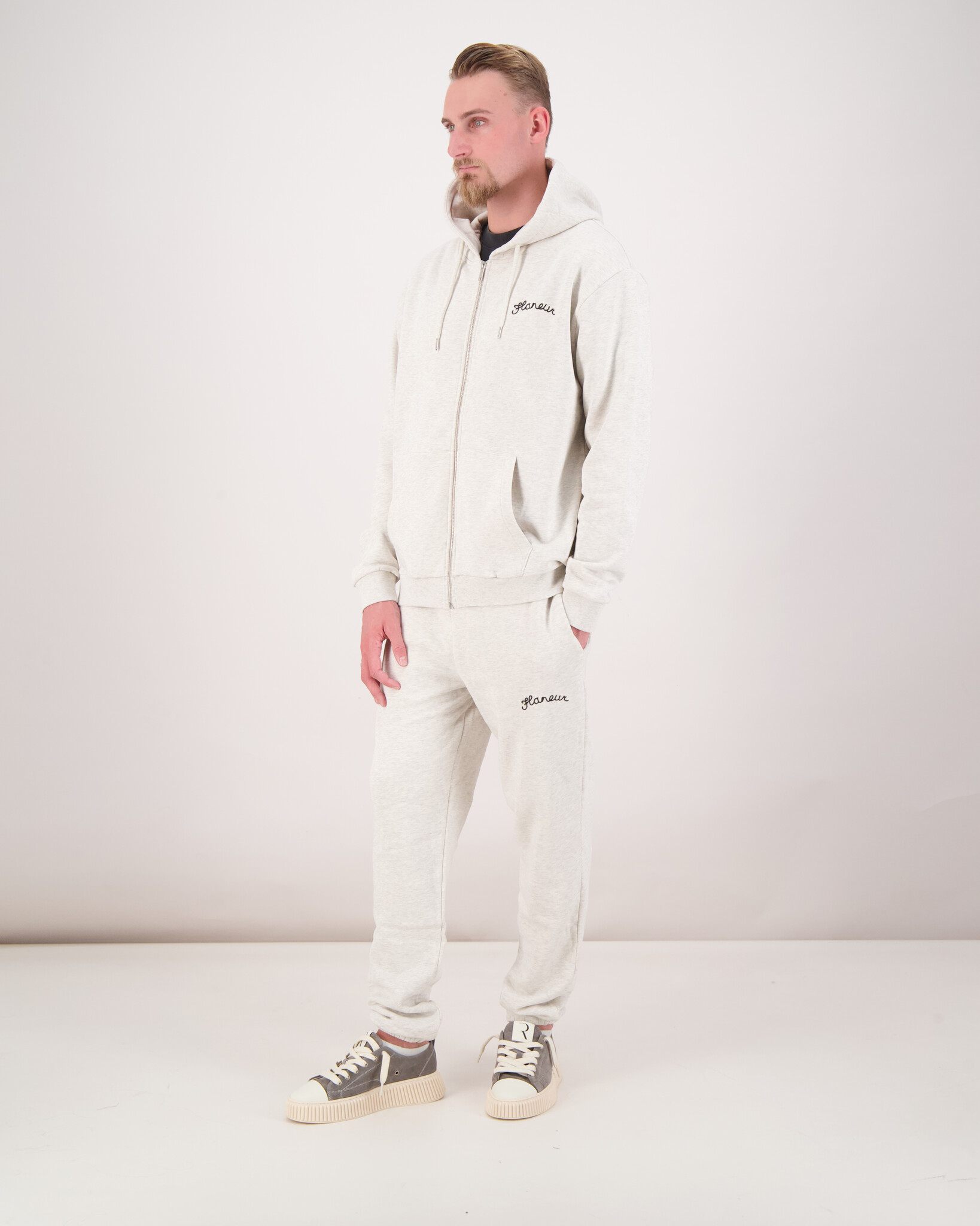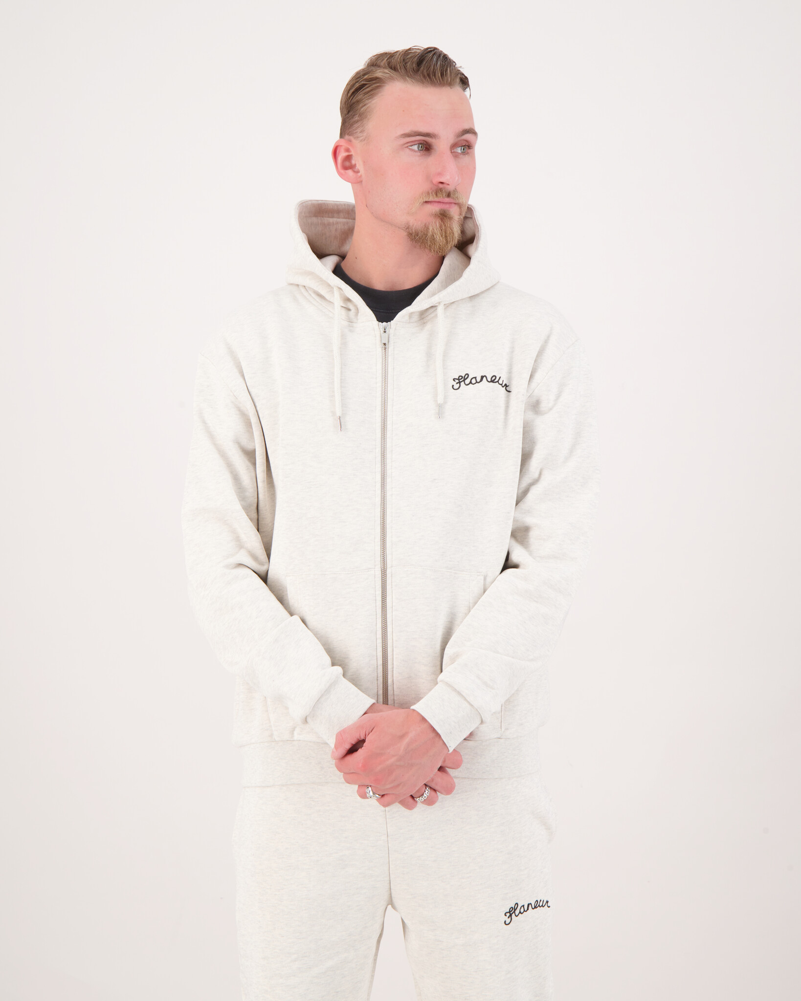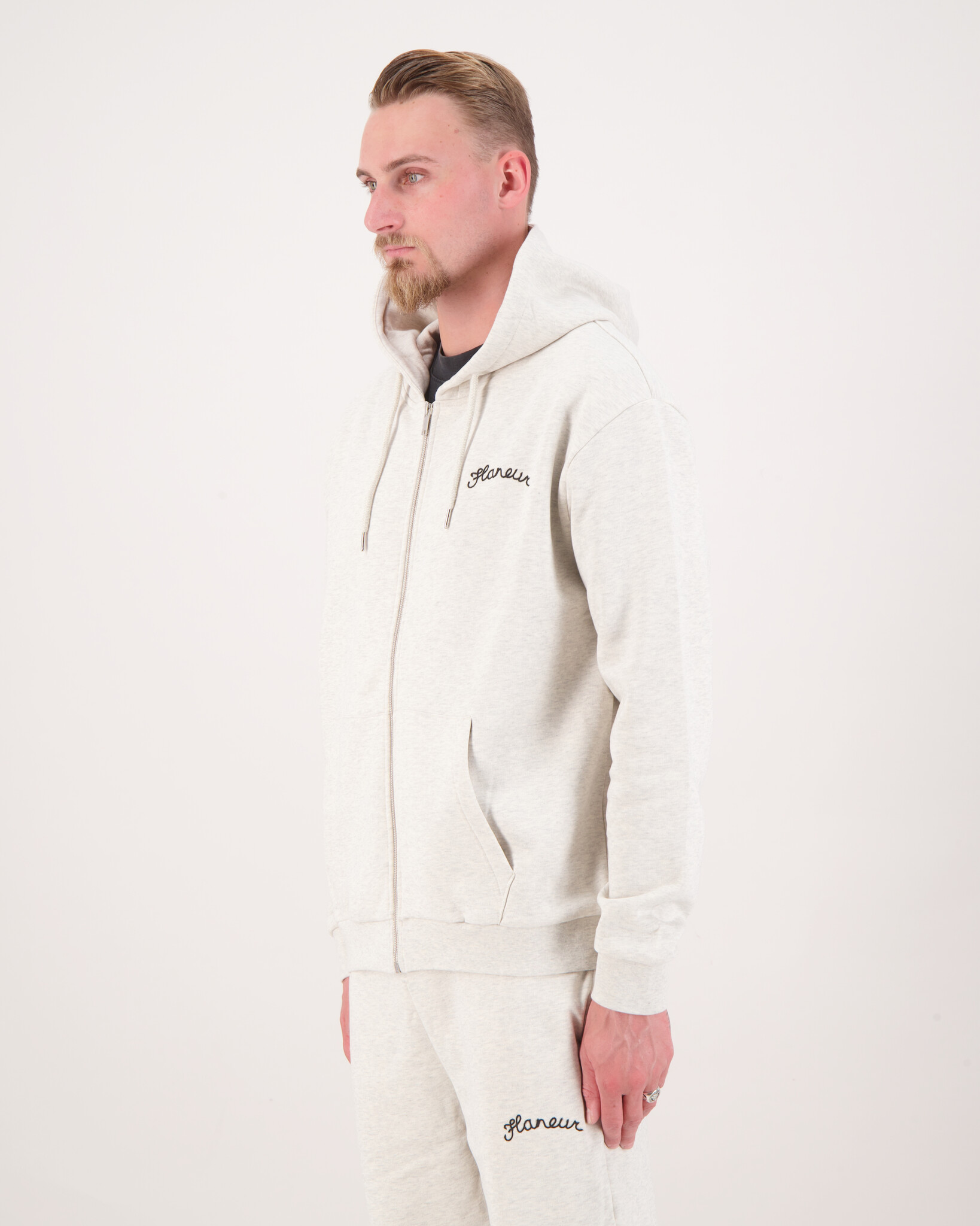 Grijze Signature Zip-Up Hoodie van het merk Flaneur. de zip up hoodie is een minimalistische, kwalitatief hoogstaande hoodie met tijdloze uitstraling. Op de borst pronkt subtiel een geborduurd 'Flâneur' Signature-logo in witte cursieve letters, dat zorg draagt voor herkenbaarheid zonder overdaad. De hoodie heeft een relaxed fit met elastische boordjes aan mouwen en taille, ideaal voor dagelijks comfort en laagjesgebruik.