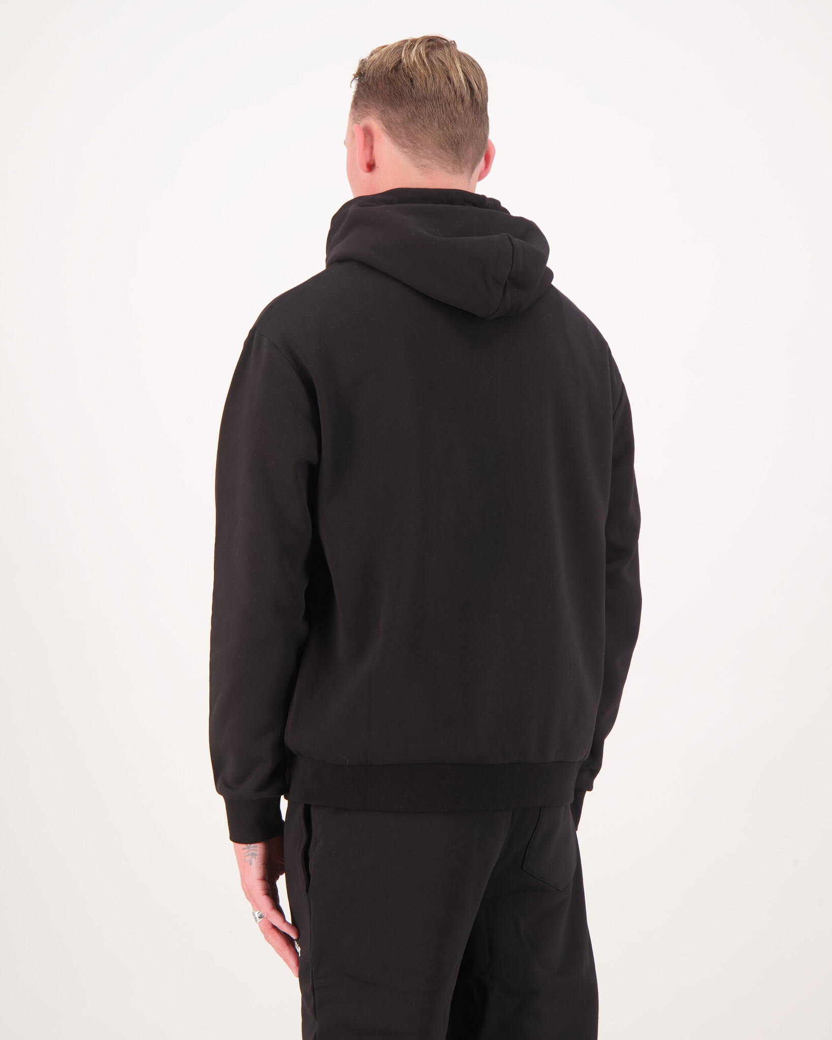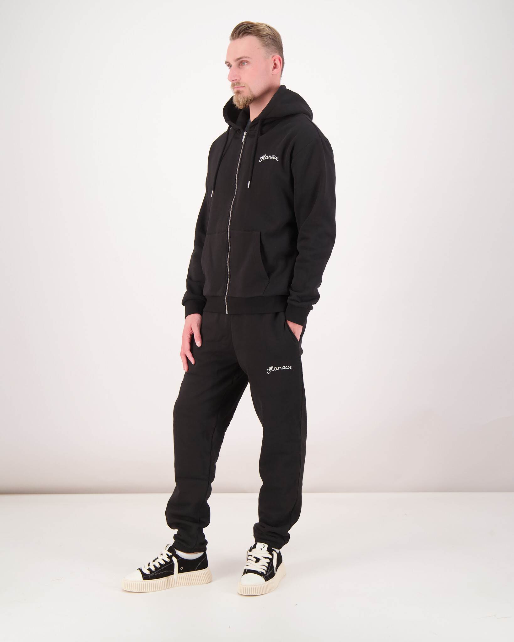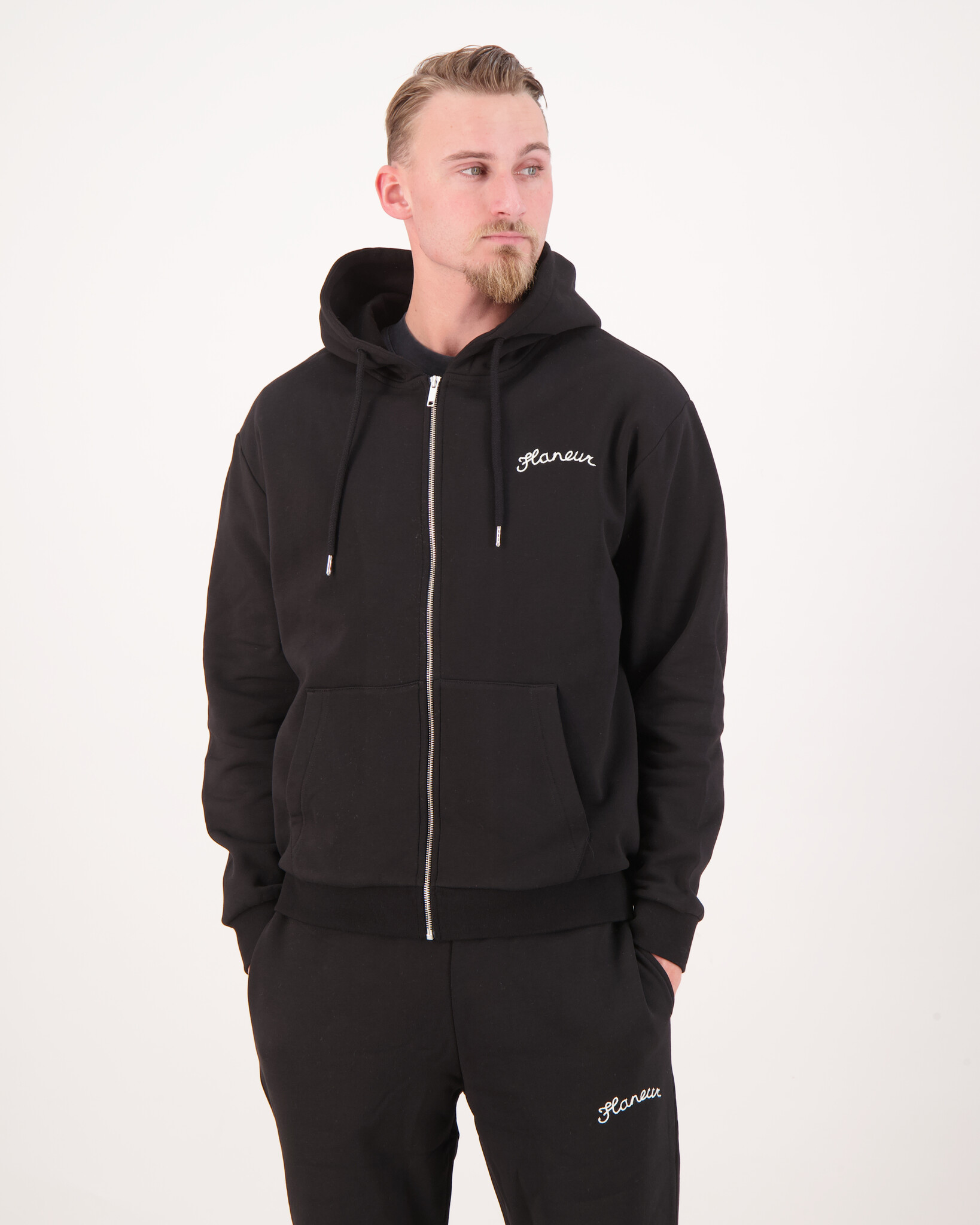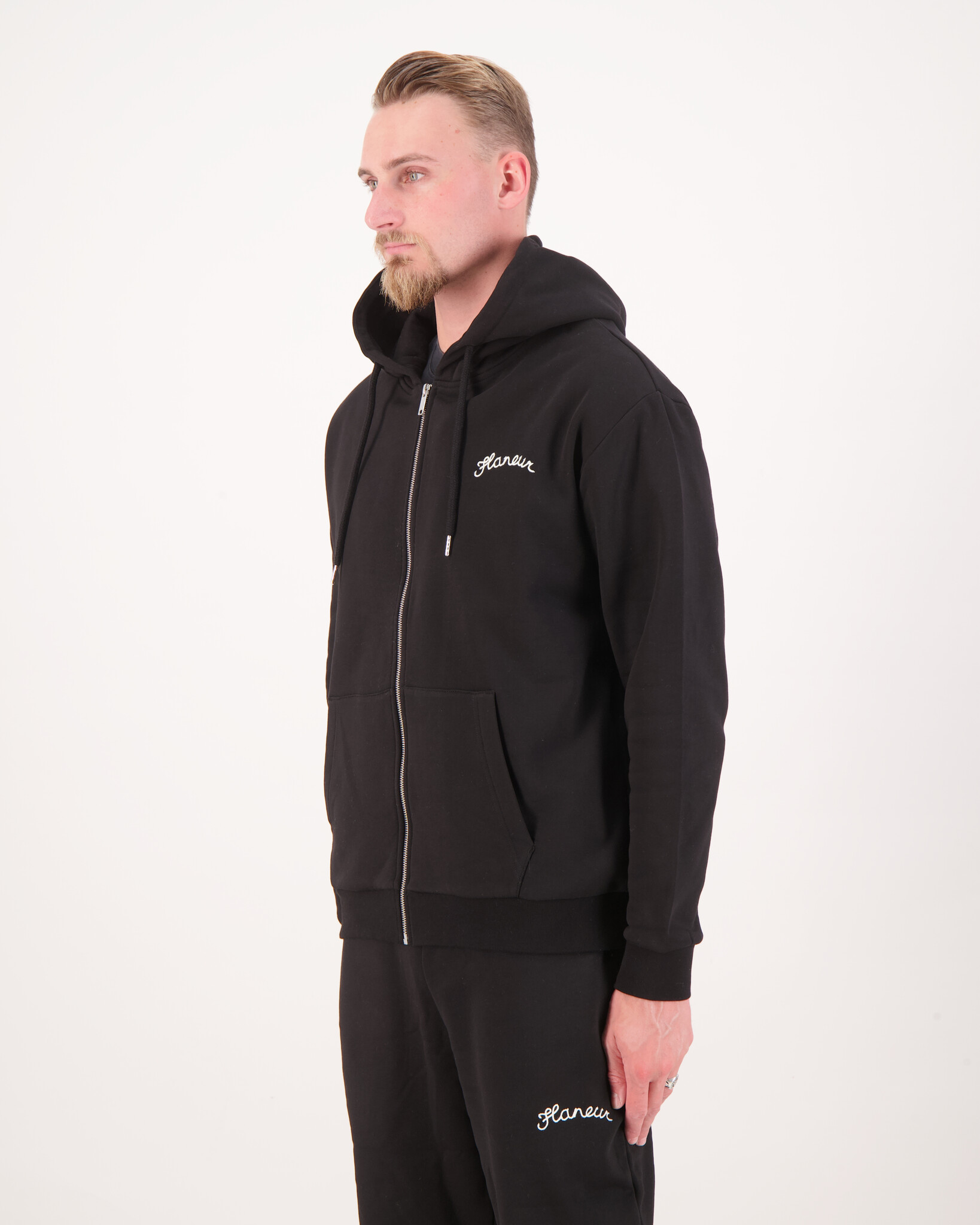 Zwarte Signature Zip-Up Hoodie van het merk Flaneur. de zip up hoodie is een minimalistische, kwalitatief hoogstaande hoodie met tijdloze uitstraling. Op de borst pronkt subtiel een geborduurd 'Flâneur' Signature-logo in witte cursieve letters, dat zorg draagt voor herkenbaarheid zonder overdaad. De hoodie heeft een relaxed fit met elastische boordjes aan mouwen en taille, ideaal voor dagelijks comfort en laagjesgebruik.