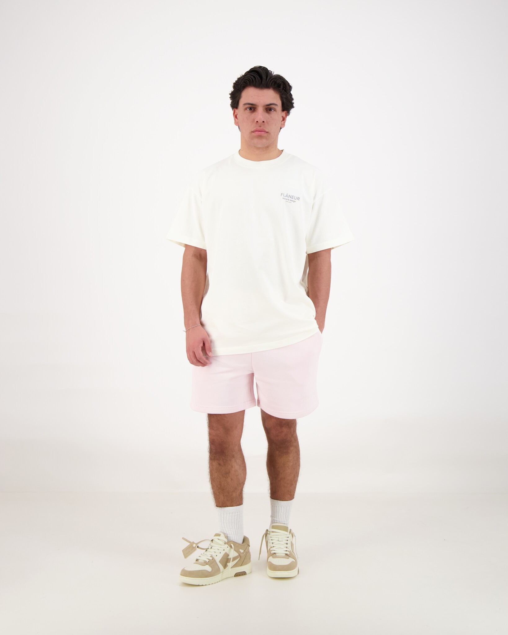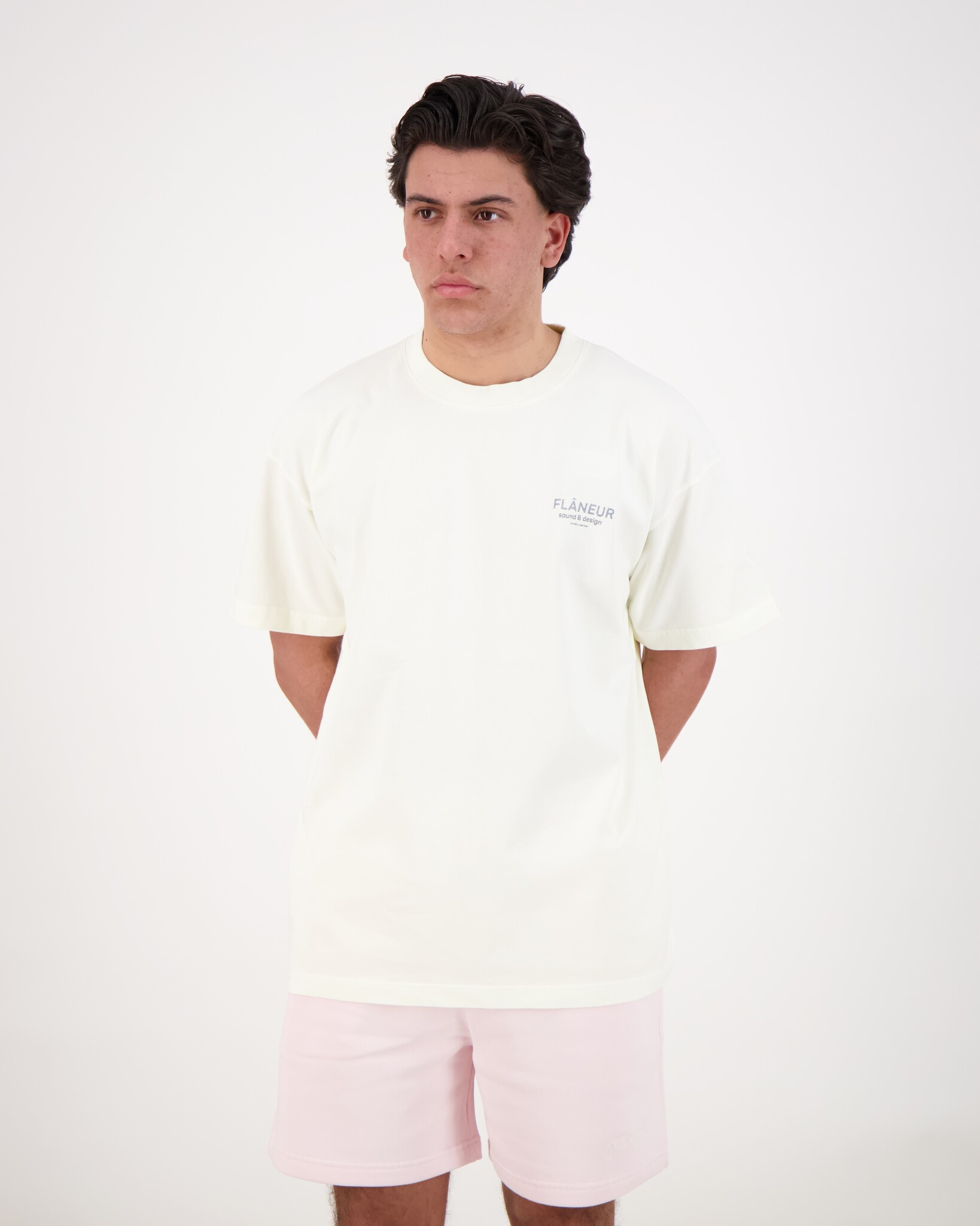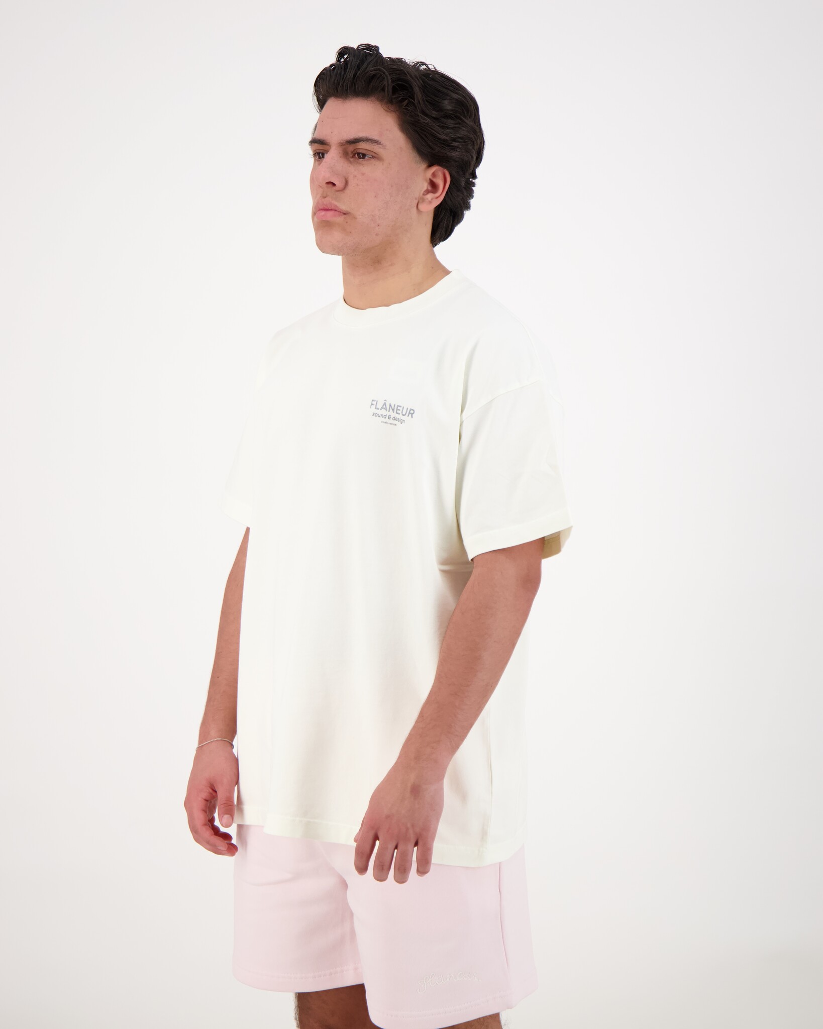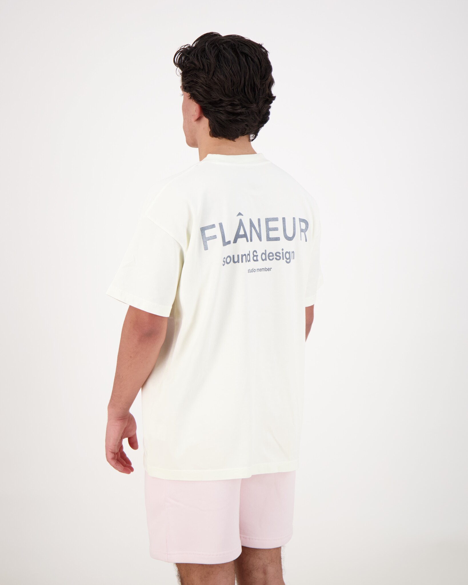 Witte Sound & Design T-Shirtje van het merk Flaneur. Het shirt heeft een washed finish — dit geeft een subtiel gedragen, vintage-achtig effect in de kleur Washed White, waardoor het een moderne en non-chalante uitstraling krijgt. Gemaakt van 100% katoen, wat zorgt voor ademend draagcomfort en een zachte feel op de huid. Op de voorkant en achterkant zie je een grafische print of tekstueel element.