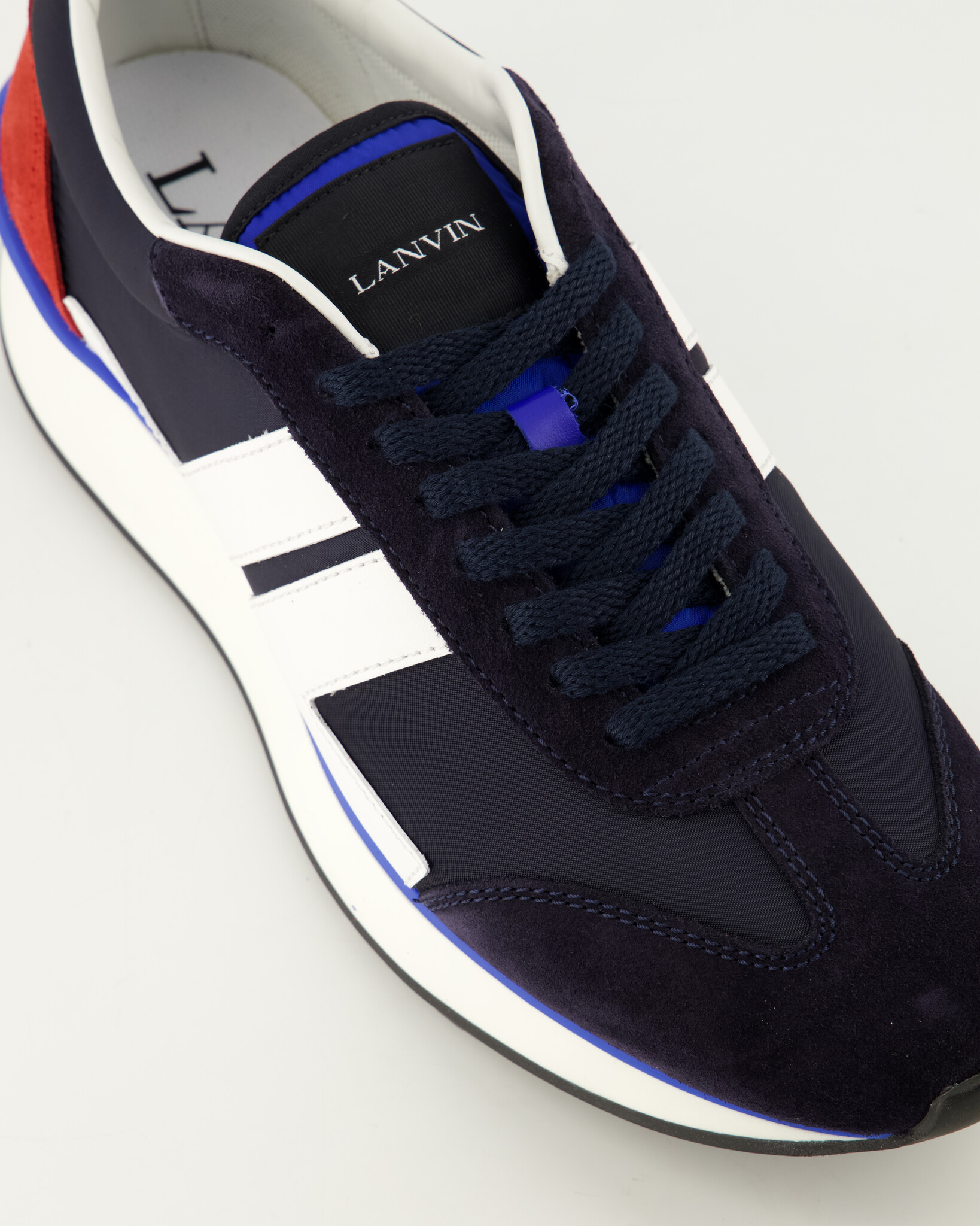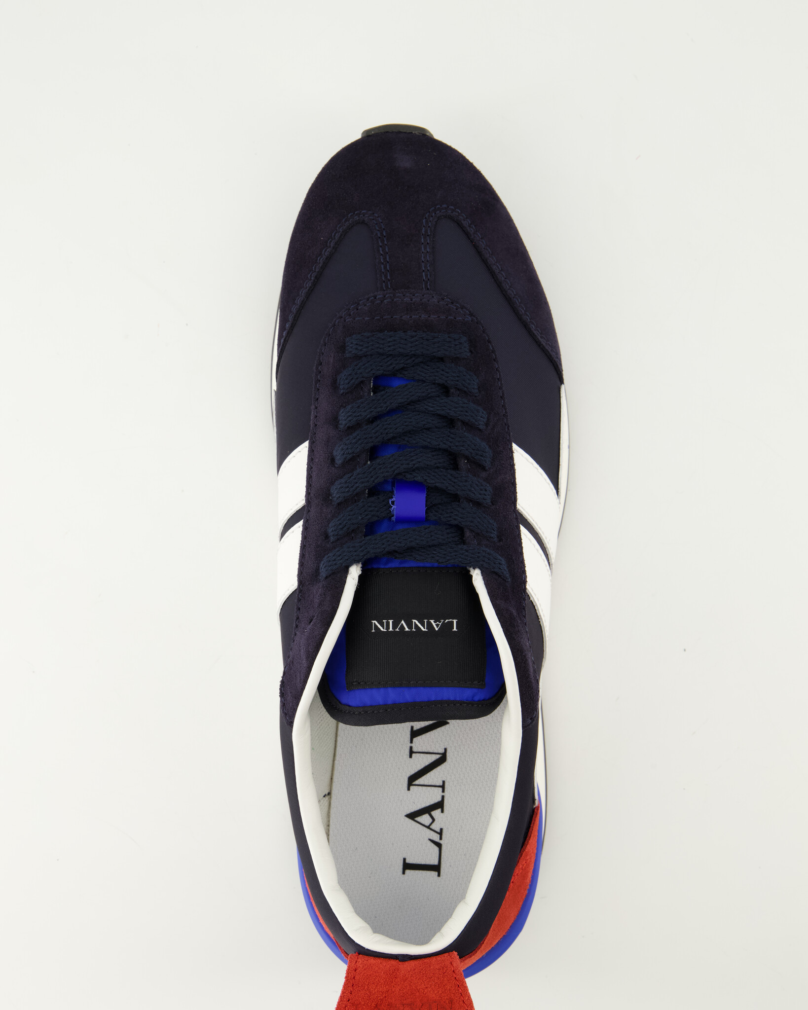 De Witte Bumpr Nylo Sneaker is een luxe sportschoen van het Franse modemerk Lanvin Paris. De sneaker heeft een moderne, sportieve uitstraling en is ontworpen om comfort en stijl te combineren. Het bovenwerk is gemaakt van nylon en kalfsleer, wat zorgt voor een lichte maar stevige schoen.De rode achterkant, Marine lijn en zwarte bovenkant maakt het een