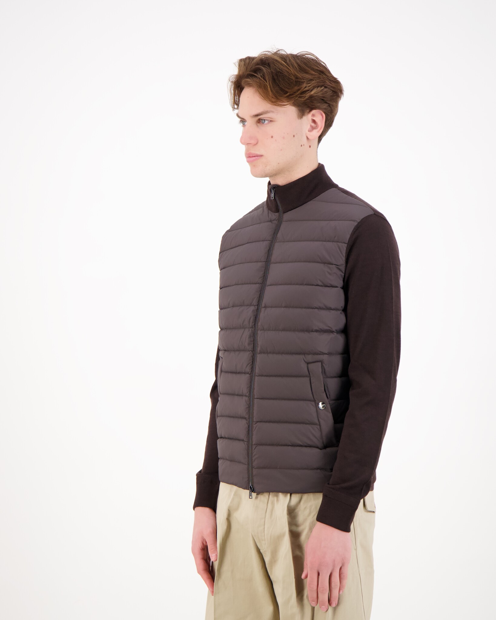 Bruine Mens Knitted Jacket van het merk Herno. Het jack is vervaardigd uit hoogwaardige materialen die zorgen voor een luxueuze uitstraling en een aangenaam draaggevoel. De gebreide delen geven het item een zachte, verfijnde textuur, terwijl het licht gewatteerde voorpand subtiele warmte biedt zonder zwaar aan te voelen. Hierdoor is dit model ideaal als tussenjas in het voor- en najaar, of als stijlvolle extra laag tijdens koelere dagen. De strakke ritssluiting, minimalistische afwerking en perfect uitgebalanceerde pasvorm geven dit jack een moderne, cleane uitstraling.