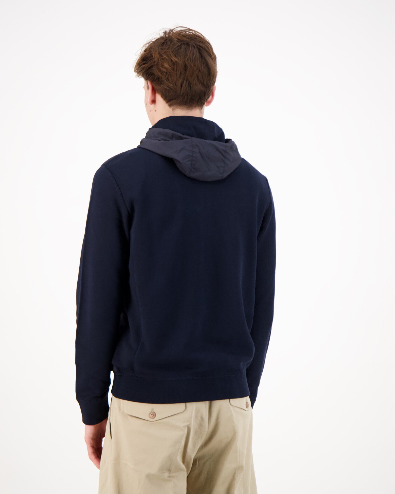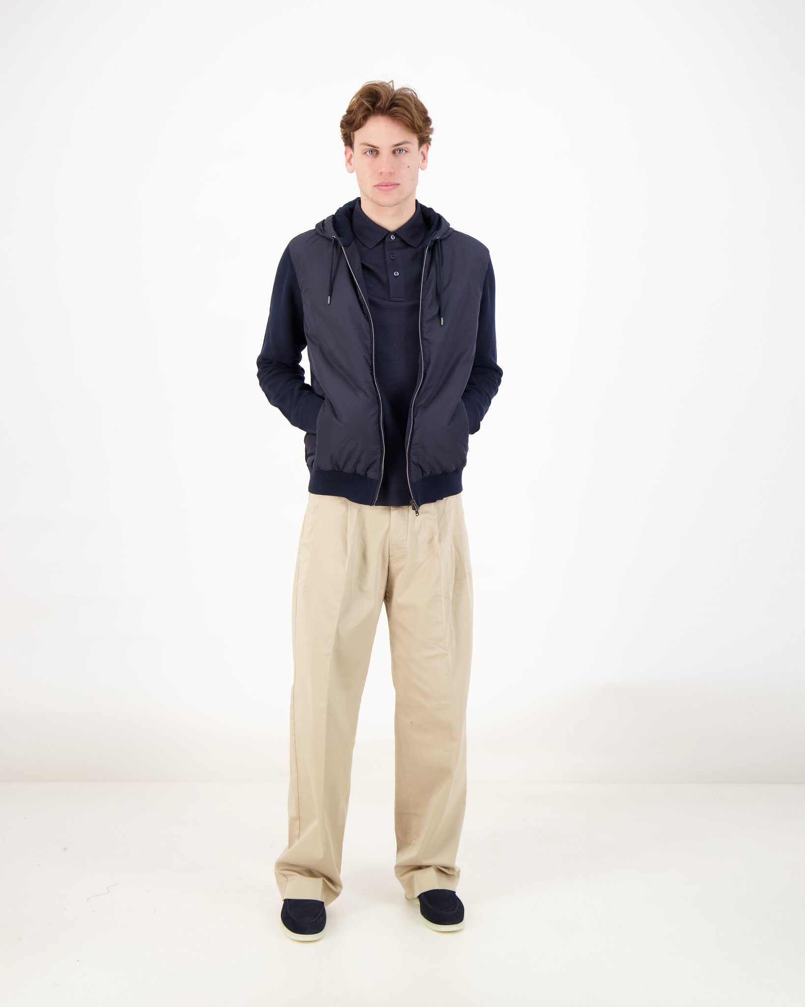 Wat deze jas bijzonder maakt, is de slimme combinatie van materialen. De piqué gebreide basis van katoen zorgt voor een zachte, ademende feel, terwijl wind-resistente panelen aan de voorkant je beschermen tegen kil weer. Een capuchon met trekkoord, rits met dubbele slider en ritszakken maken hem niet alleen stijlvol, maar ook praktisch in dagelijks gebruik.
