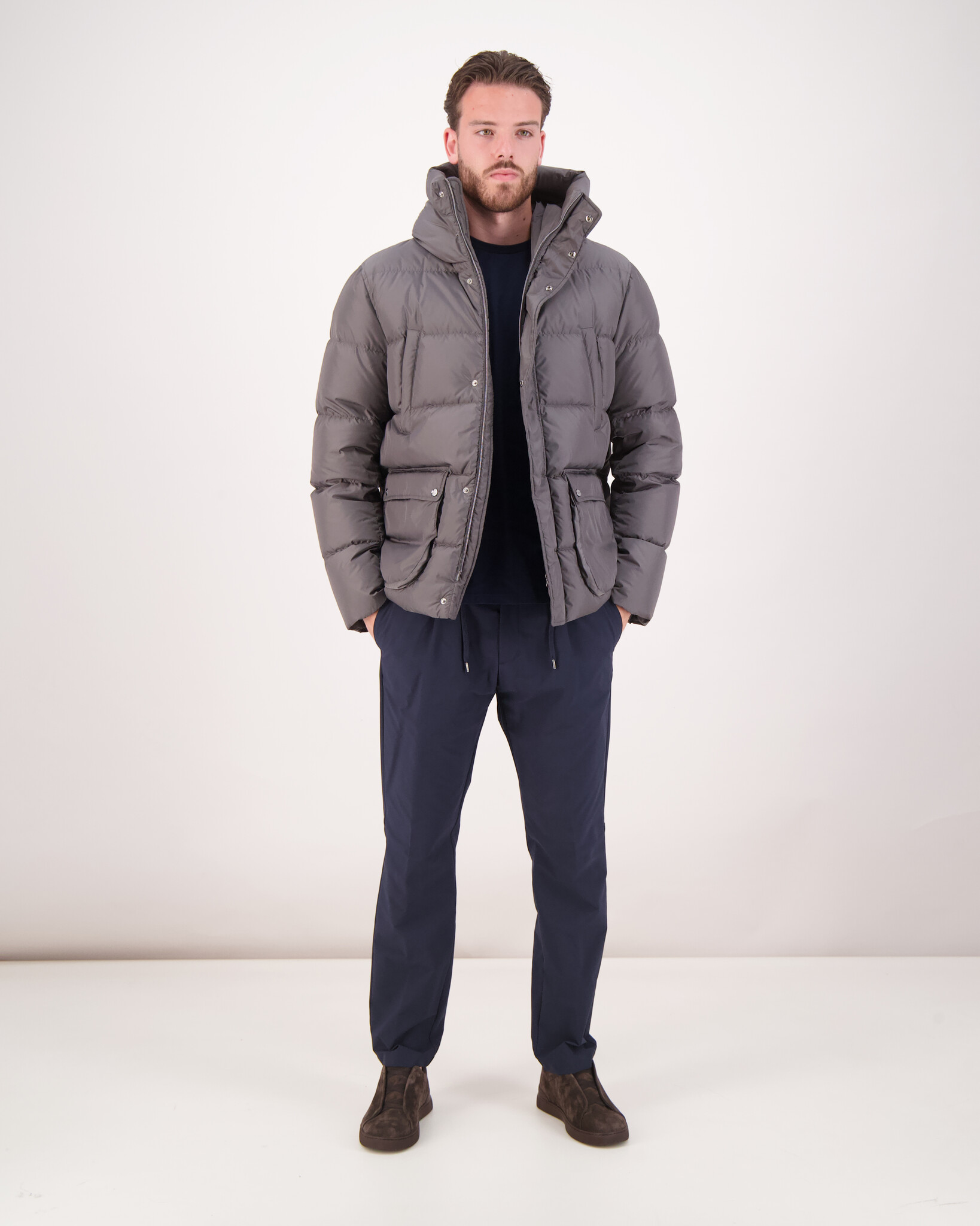 Grijze Piumino Bomber Multi Tasche Jacket van het merk Herno. De jacket met capuchon heeft twee bovenzakken en twee lagen zakken met knoopsluiting.