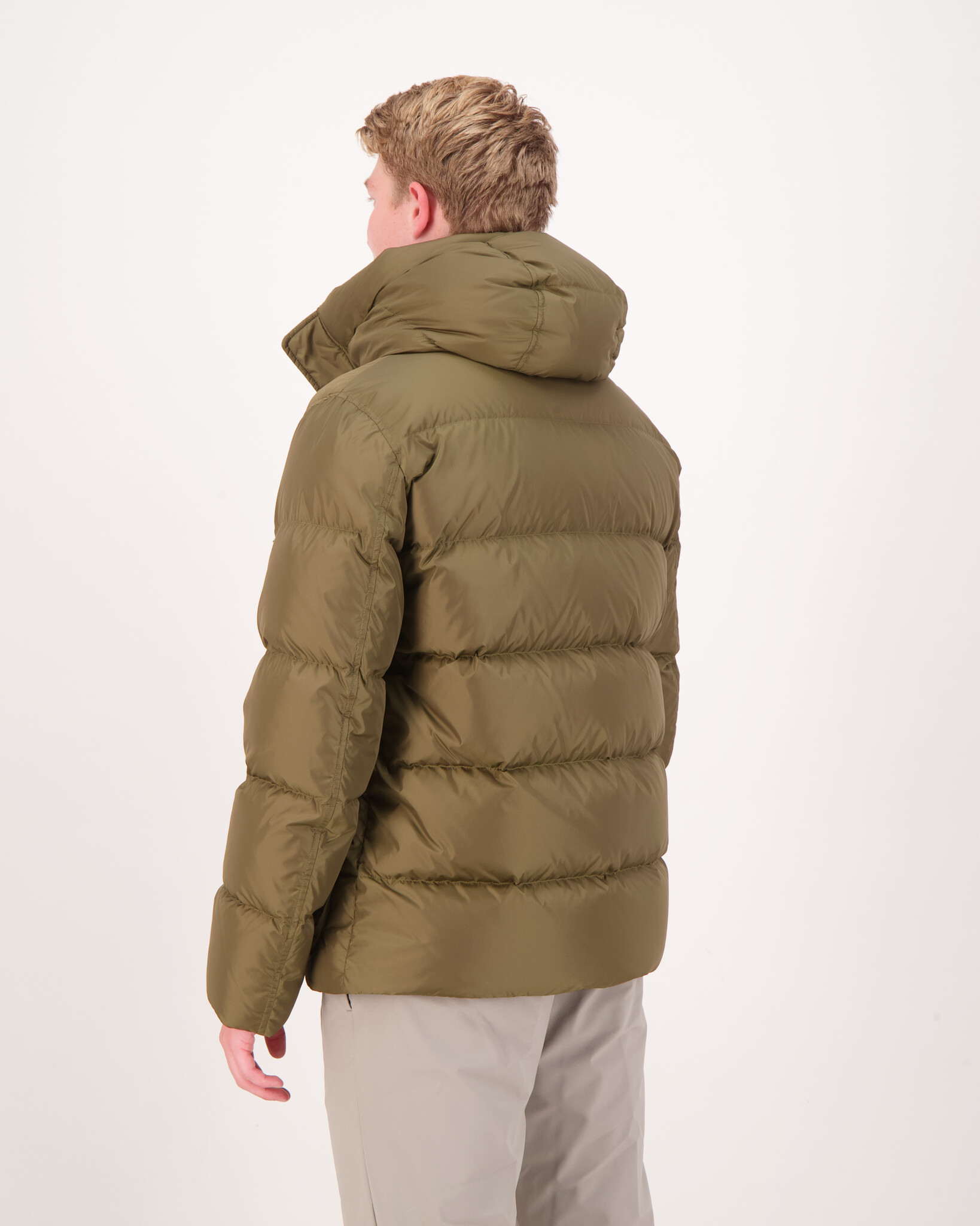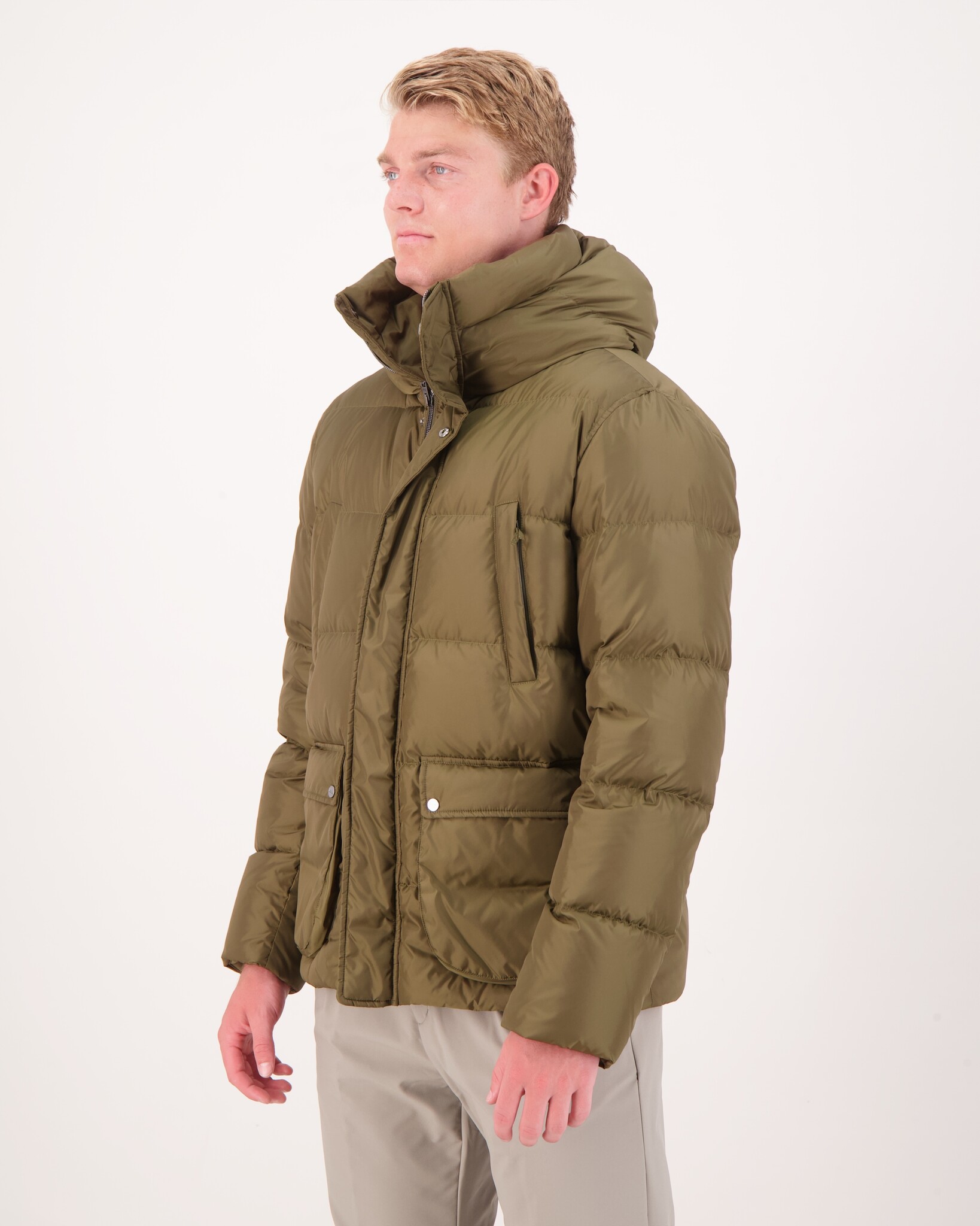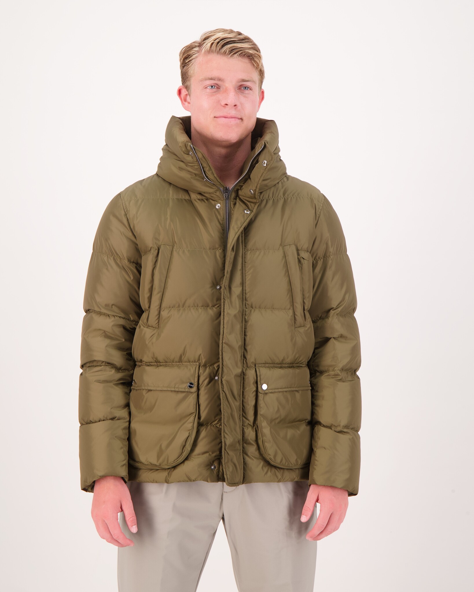 Military Piumino Bomber Multi Tasche Jas van het merk Herno. De jacket met capuchon heeft twee bovenzakken en twee lagen zakken met knoopsluiting.