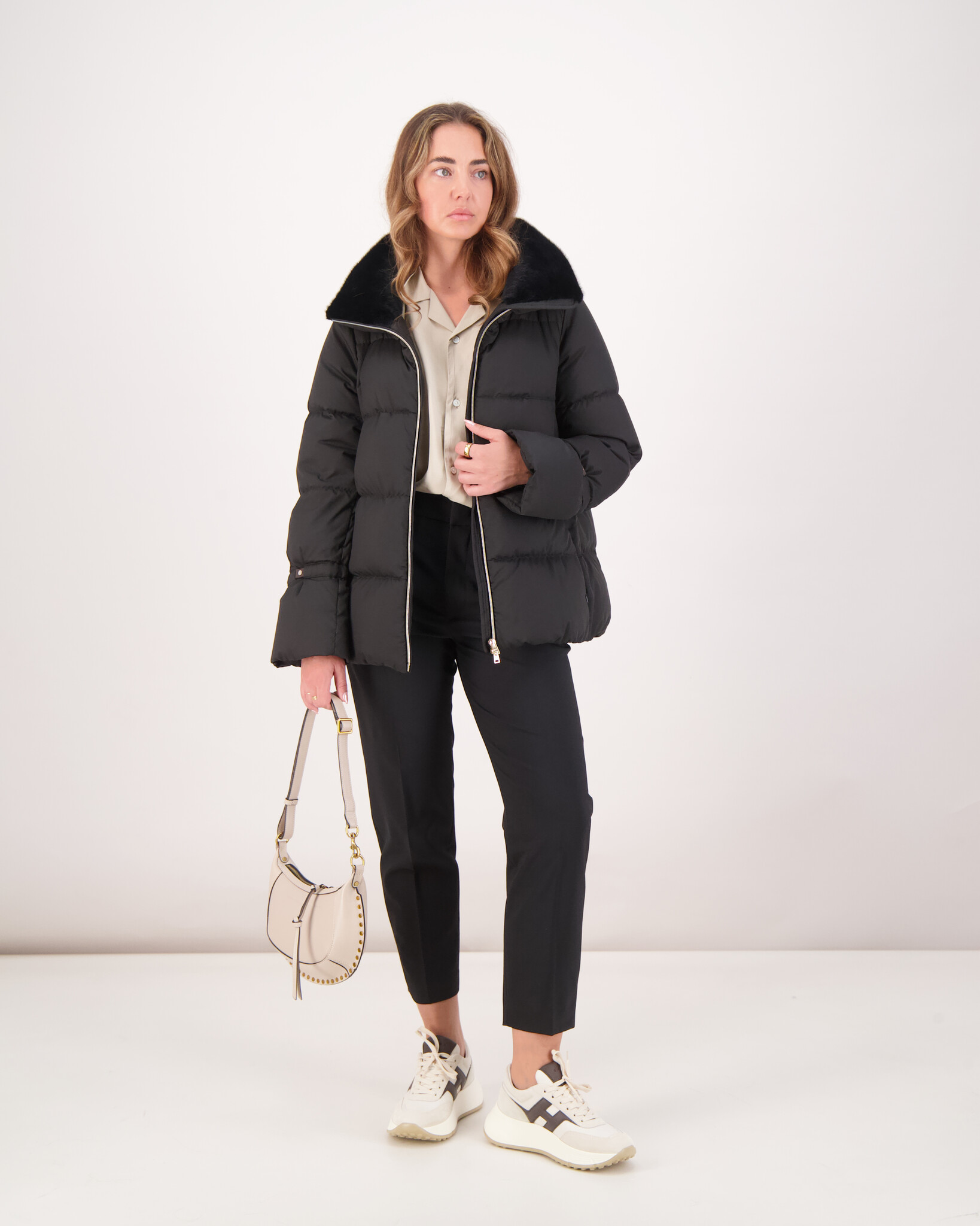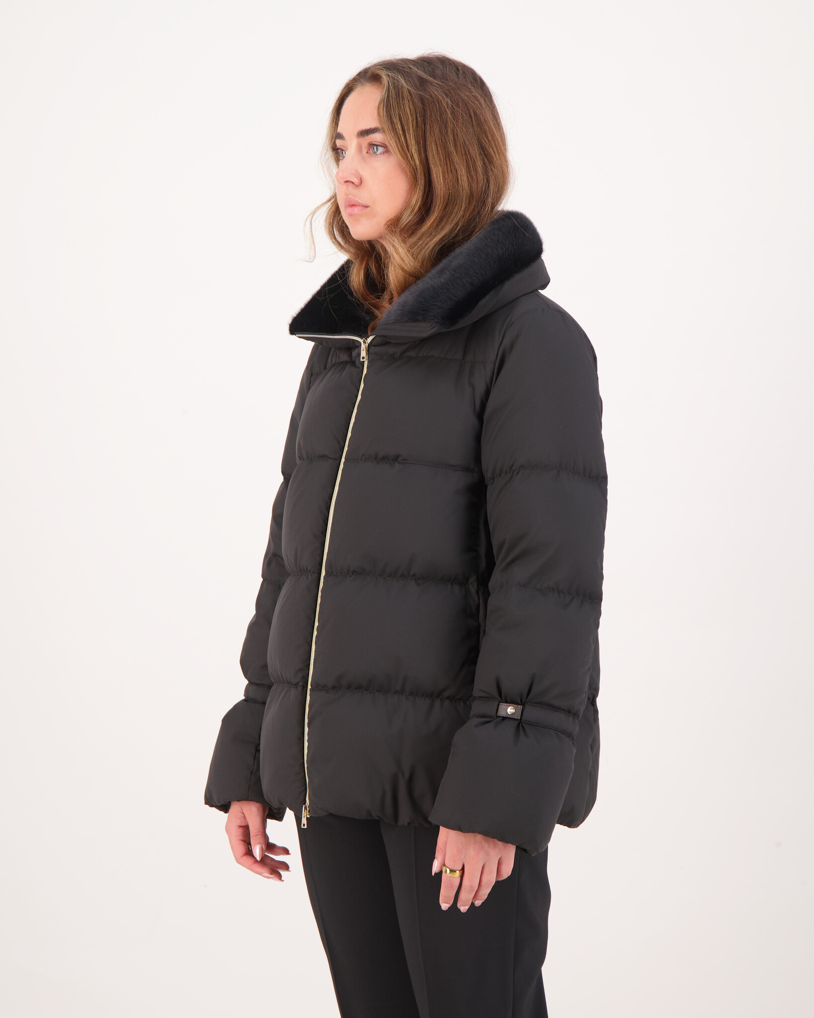 Zwarte Piumino Corto Con Jacket van het merk Herno. Is een kort damesjack met een elegante, stadsgerichte uitstraling en een luxueuze look dankzij de glanzende en technische afwerking. Voorzien van een hoge opstaande kraag die extra bescherming biedt.