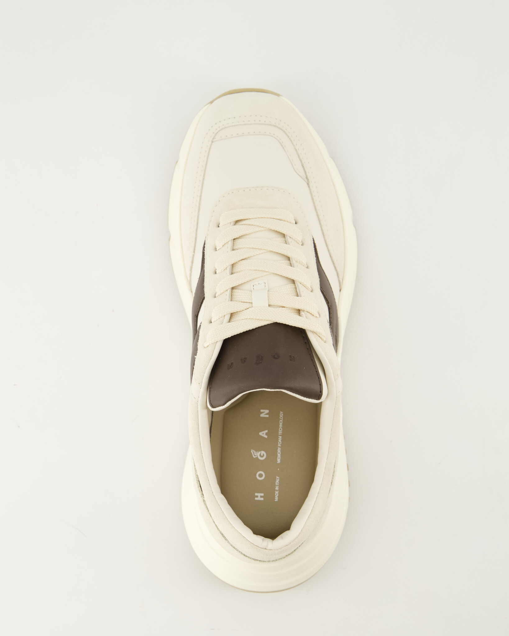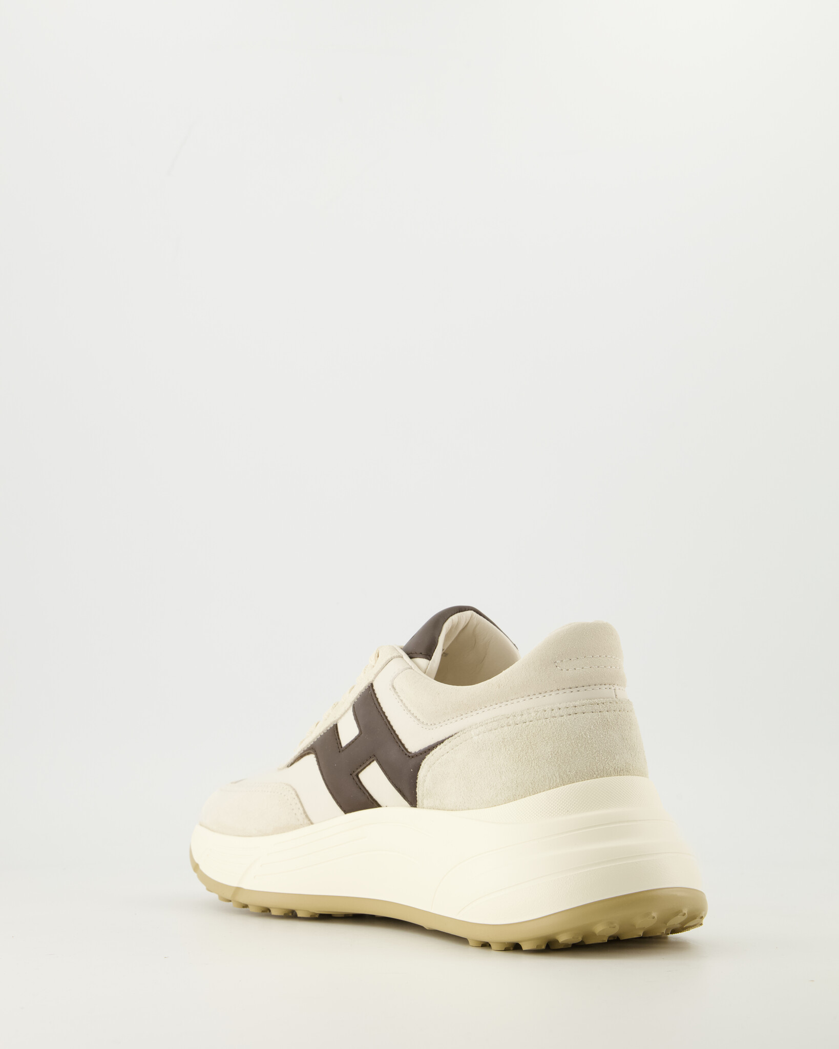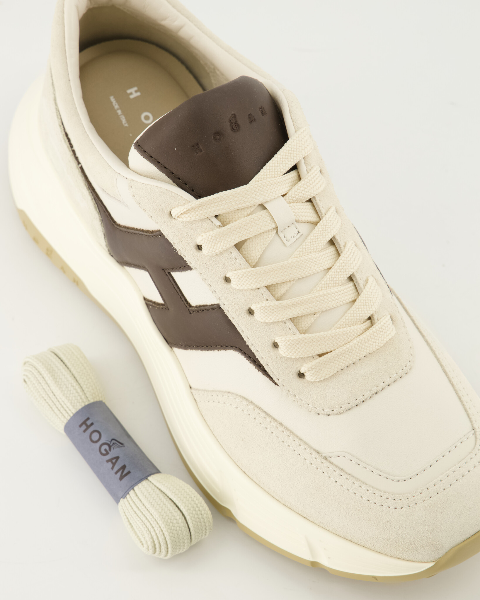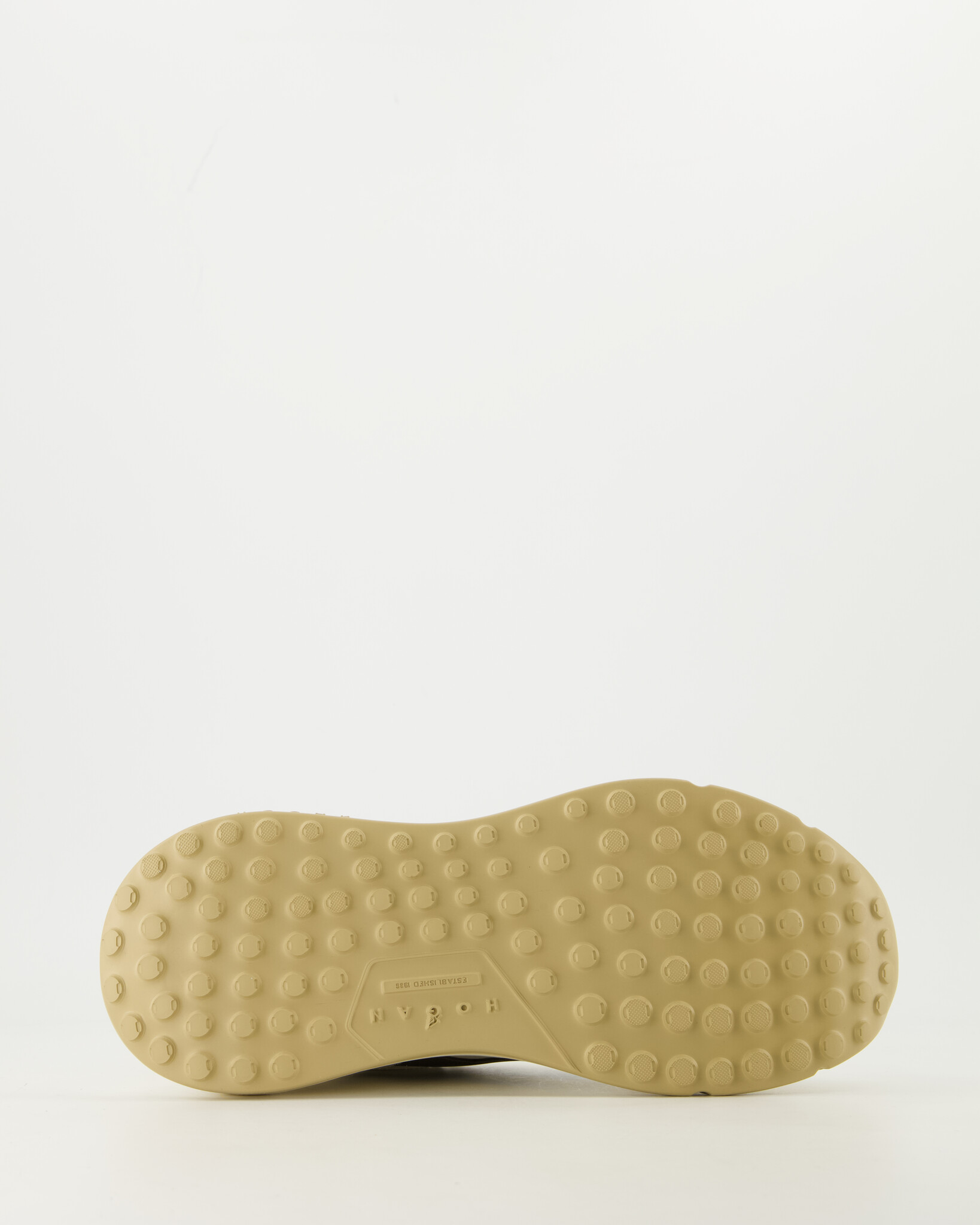 Beige H669 Allacciato H Sneaker van het merk Hogan. De Hogan Hi-Fi sneakers geven een vrouwelijke draai aan de Hyperlight buitenzool met studs, met een verhoogd platform voor hoogte en elegantie. Ze doen denken aan de sporticonen uit de jaren 80 met hun technische afwerking en stedelijke roeping en hebben een combinatie van zachte en strakke lijnen. Het bovenwerk is hier uitgevoerd in suède, met een maxi H op de zijband. Een energieke athleisure stijl, met een memory foam binnenzool voor extra comfort en een dempende pasvorm.