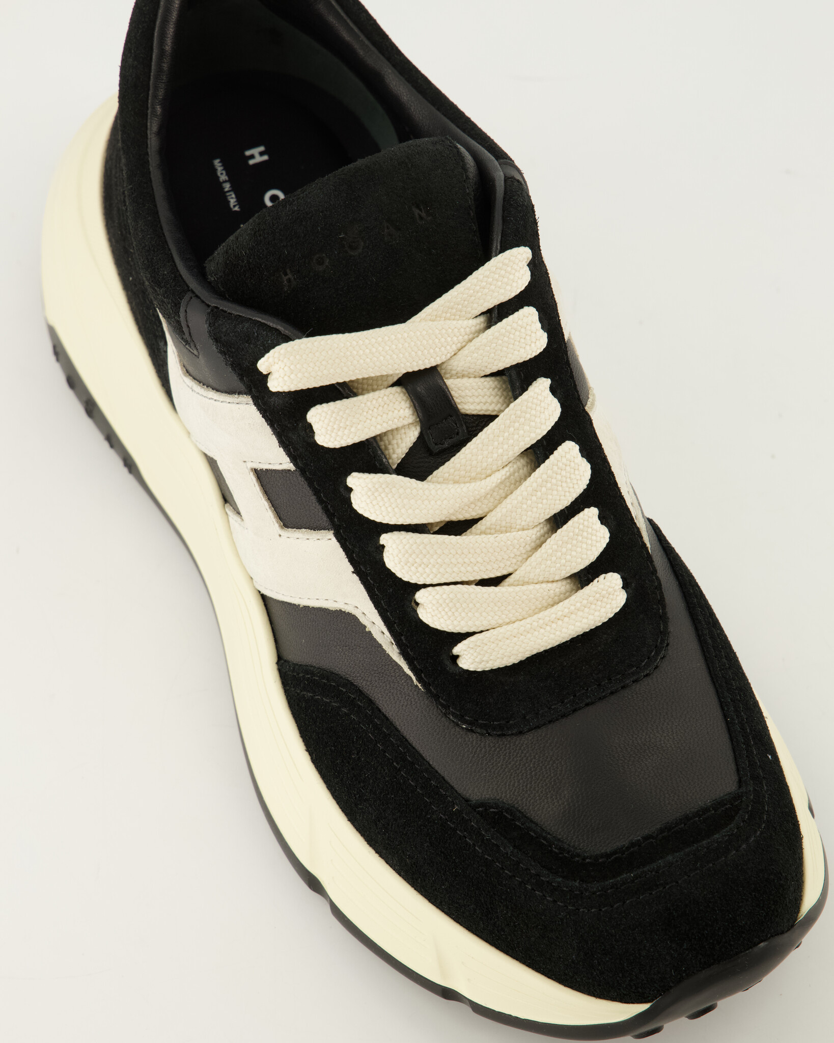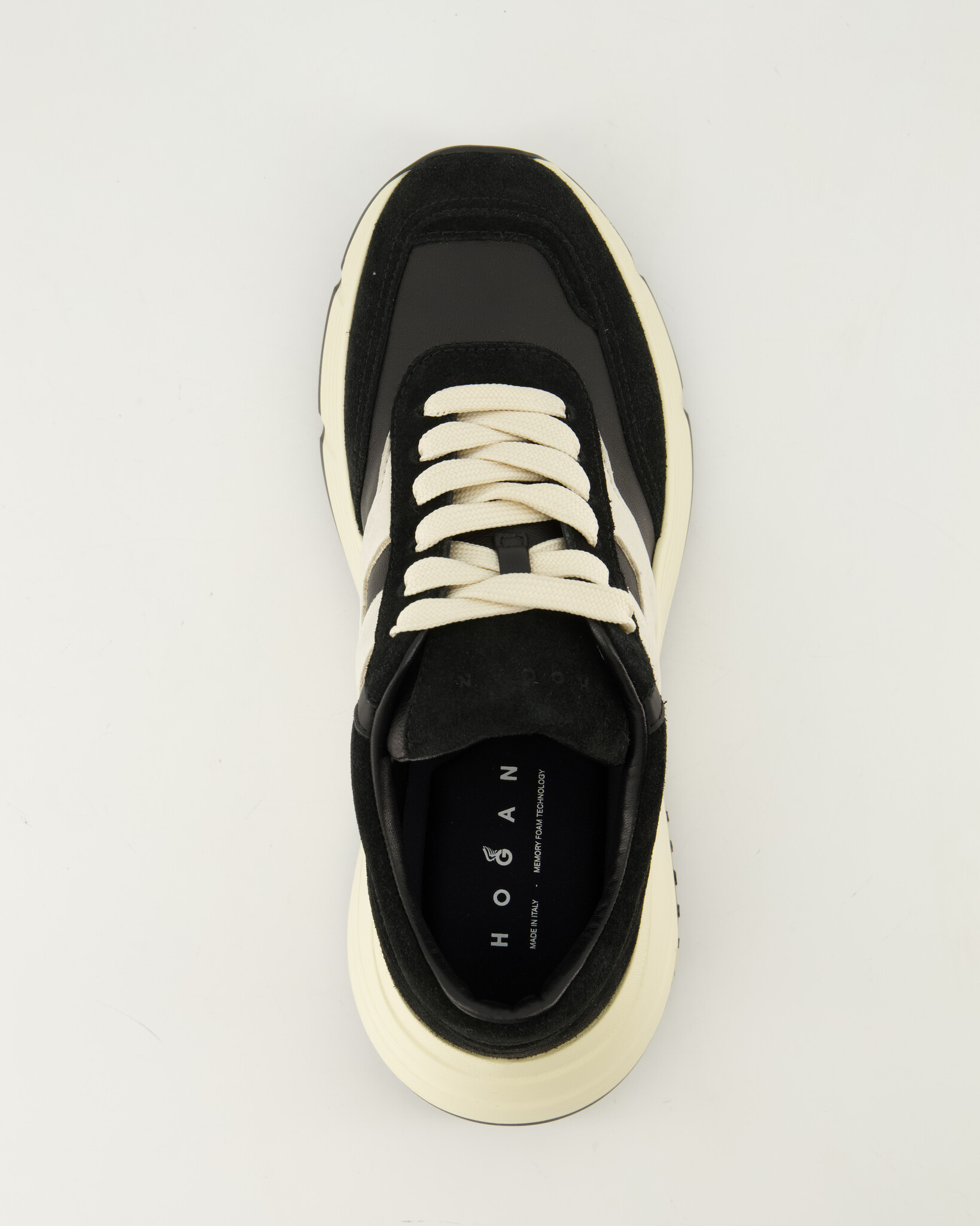 Zwarte H669 Allacciato H Sneaker van het merk Hogan. De Hogan Hi-Fi sneakers geven een vrouwelijke draai aan de Hyperlight buitenzool met studs, met een verhoogd platform voor hoogte en elegantie. Ze doen denken aan de sporticonen uit de jaren 80 met hun technische afwerking en stedelijke roeping en hebben een combinatie van zachte en strakke lijnen. Het bovenwerk is hier uitgevoerd in suède, met een maxi H op de zijband. Een energieke athleisure stijl, met een memory foam binnenzool voor extra comfort en een dempende pasvorm.