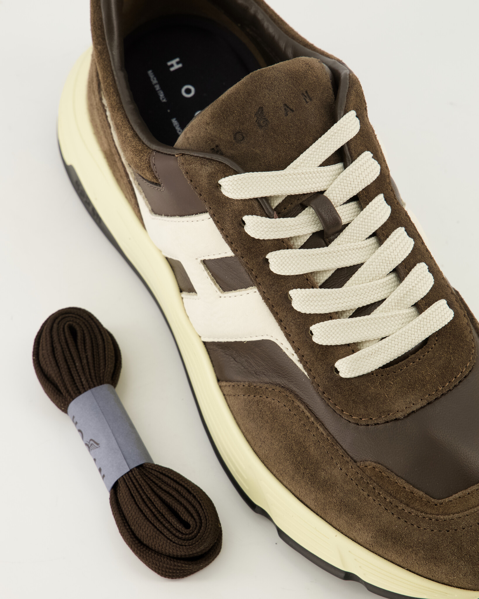 Bruine Cool Allacciato H Sneakers van het merk Hogan. De Hogan Hyperlight sneakers worden gekenmerkt door vloeiende en dynamische vormen en combineren de lijnen van joggingschoenen met urban kenmerken. Het bovenwerk van suède en nappaleer met schuine H herinnert aan iconische details van het merk. Een dynamische stijl, met een memory foam binnenzool en een lichtgewicht buitenzool met spikes.