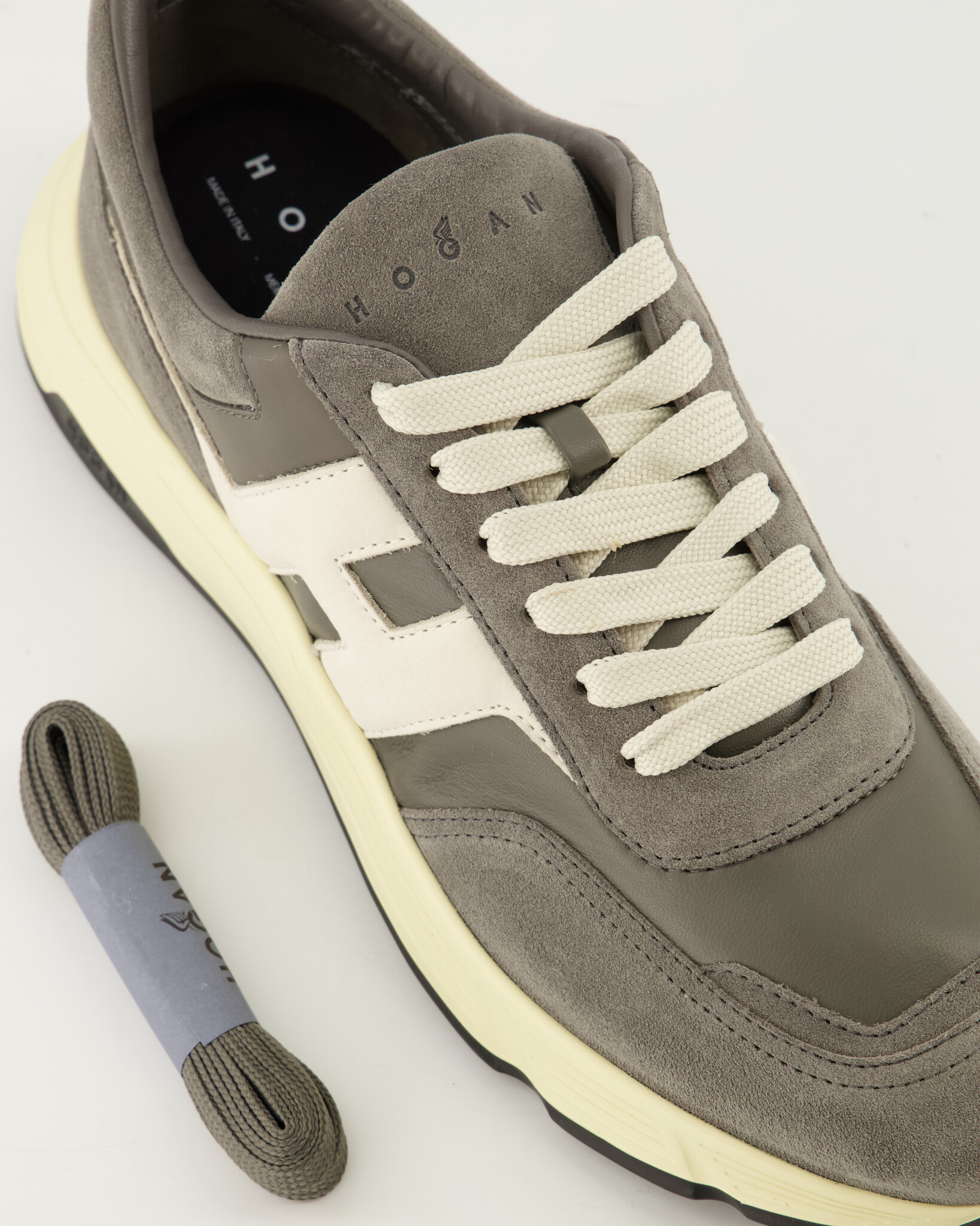 Grijze Cool Allacciato H Sneakers van het merk Hogan. De Hogan Hyperlight sneakers worden gekenmerkt door vloeiende en dynamische vormen en combineren de lijnen van joggingschoenen met urban kenmerken. Het bovenwerk van suède en nappaleer met schuine H herinnert aan iconische details van het merk. Een dynamische stijl, met een memory foam binnenzool en een lichtgewicht buitenzool met spikes.