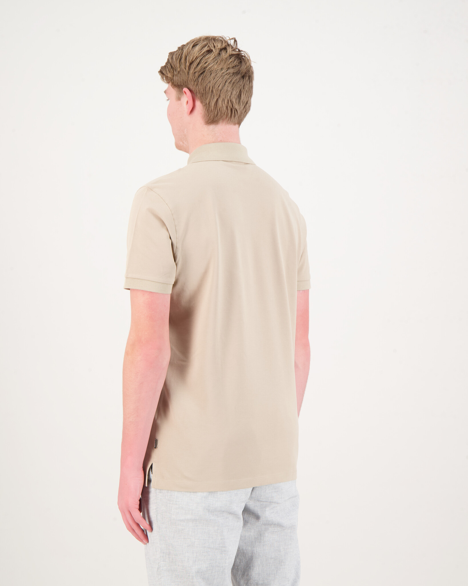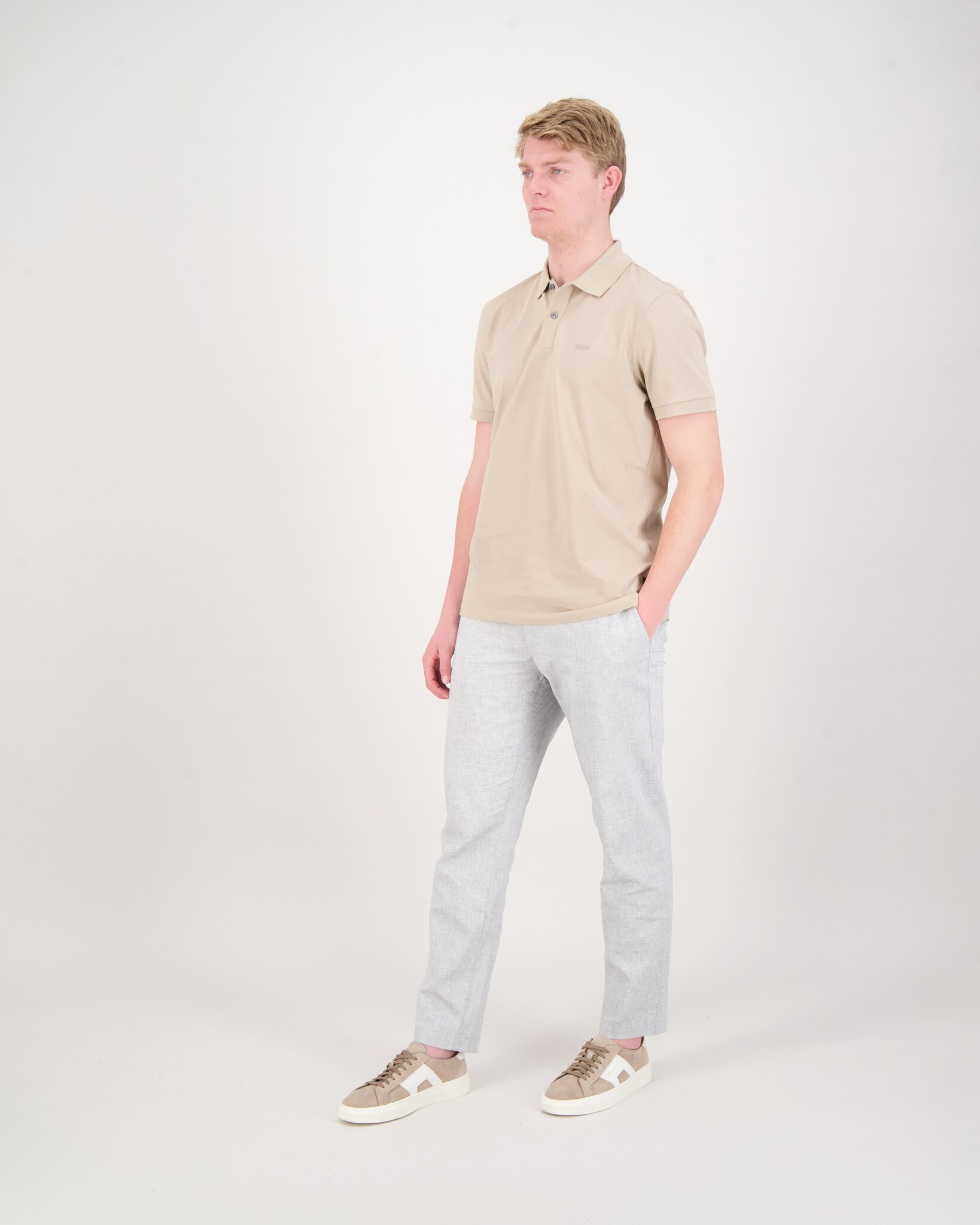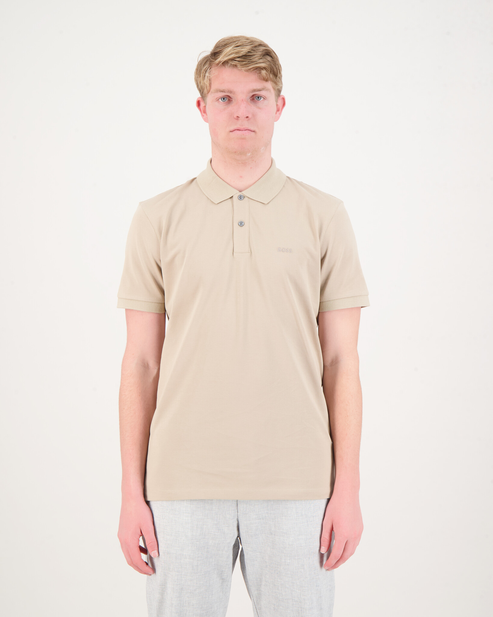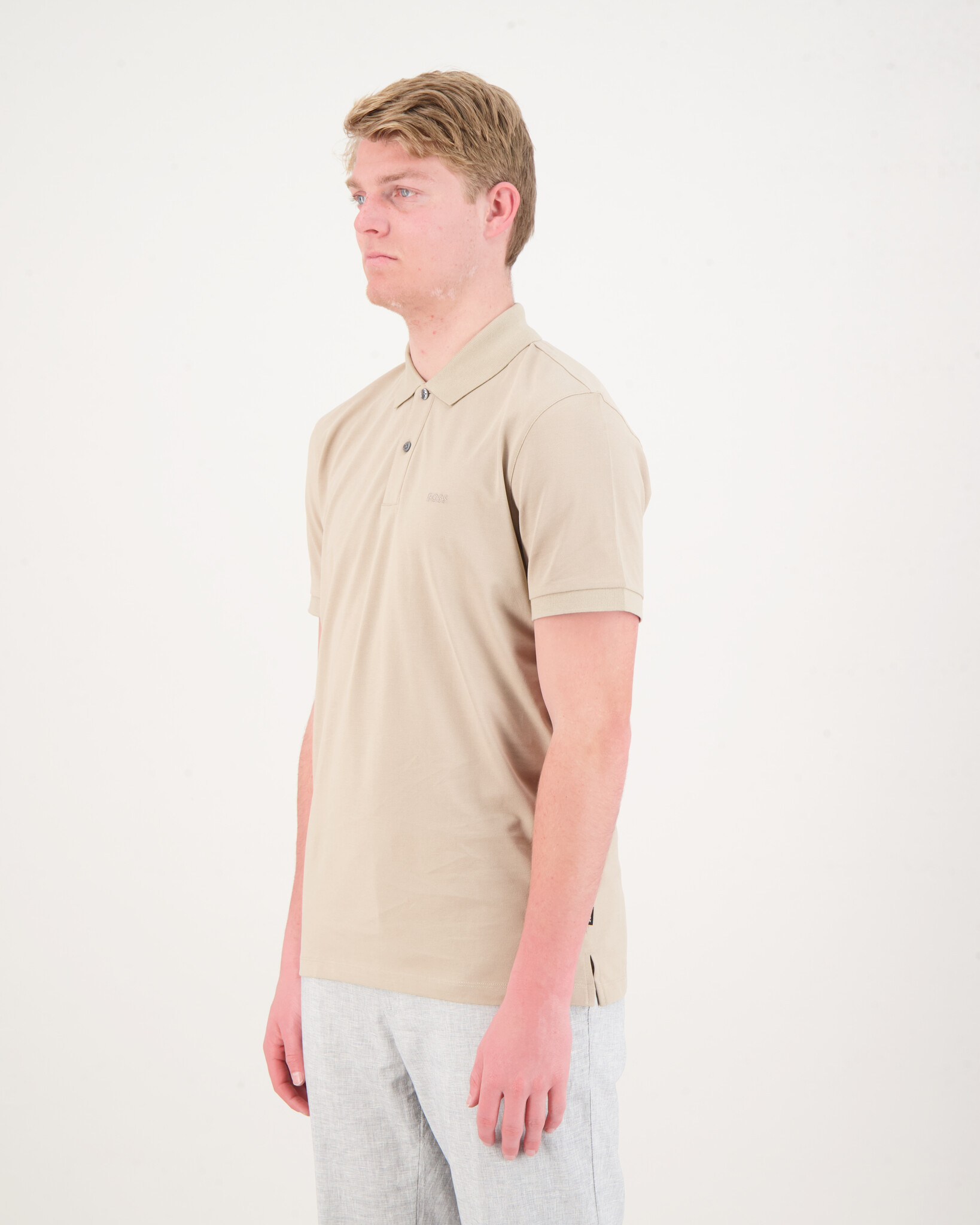 D.Beige Pallas Polo van het merk Hugo Boss. Deze Regular fit polo heeft een klassieke kraag, gaat dicht met 2 knoopjes en heeft het Boss logo gestikt op de linkerborst in de zelfde kleur.