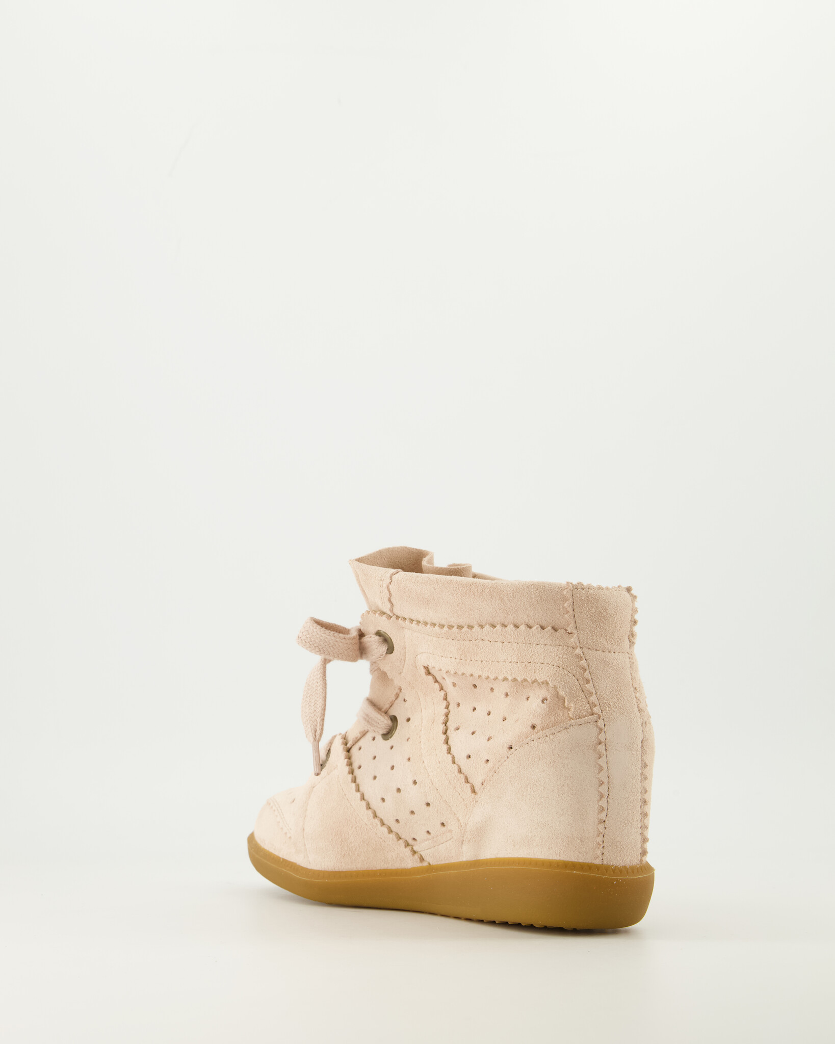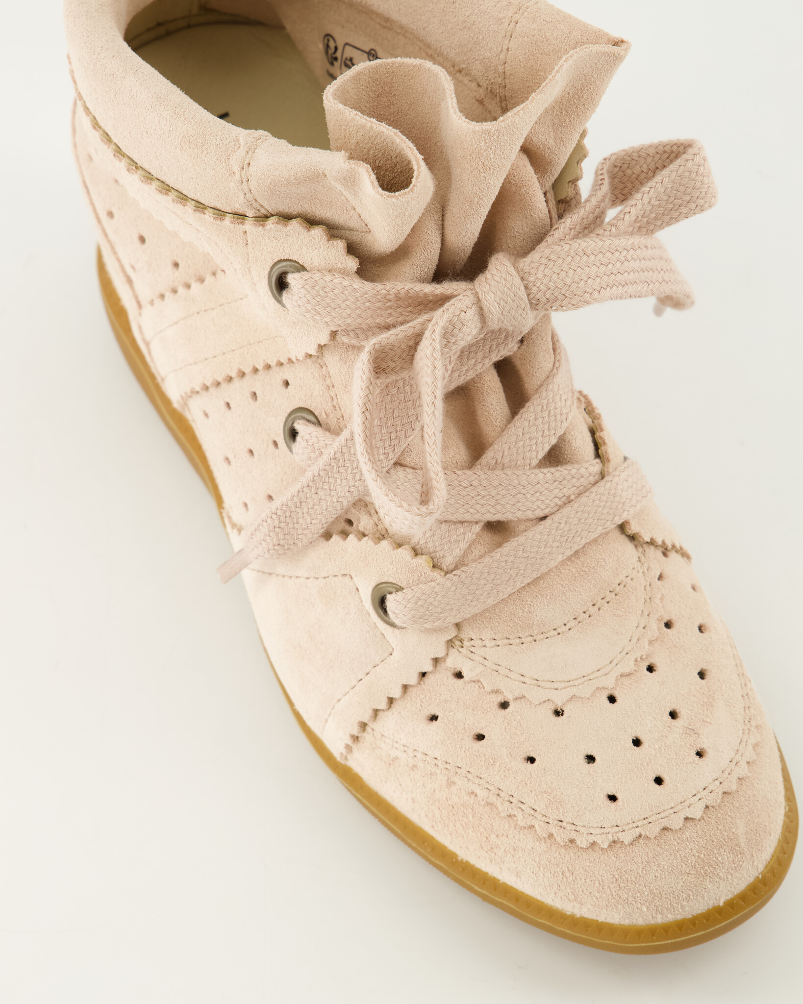 Roze Bobby Sneakers van het merk Isabel Marant Dames. De Bobby sneakers zijn wedge high-tops gemaakt van zacht suede kalfsleder, geperforeerd voor ademend comfort. Ze hebben een klassieke, ronde neus, vetersluiting en afgewerkte, serrated randen. De binnenvoering en inlegzool zijn van soepel leer, wat bijdraagt aan luxe draagcomfort. De rubberen buitenzool zorgt voor grip.