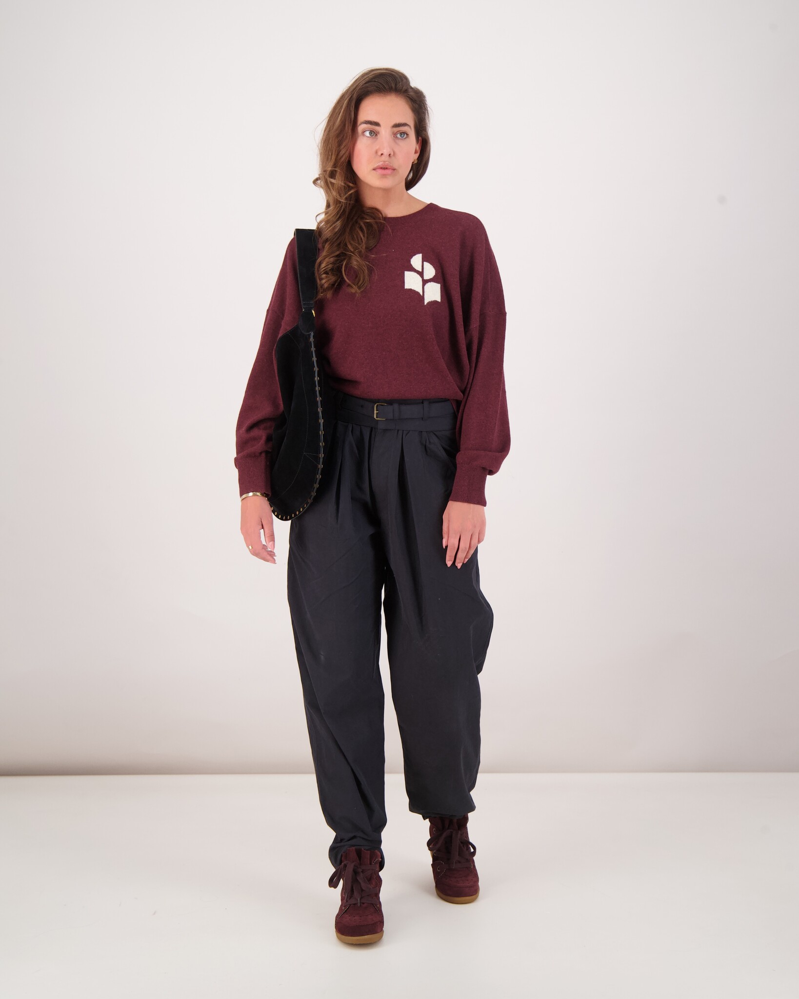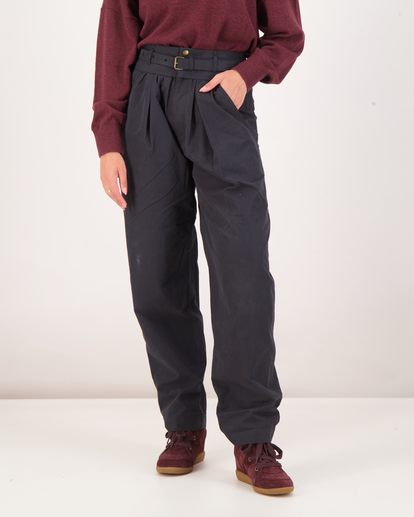 Zwarte Celia Pants van het merk Isabel Marant Dames. De Pants is een hoge taillebroeken met een losse, rechte pasvorm die elegantie en comfort moeiteloos combineren. Hebben ze plooidetails aan de voorkant en een bijpassende riem met metalen gesp voor een vrouwelijke, gestructureerde look. De zwarte kleur zorgt voor veelzijdigheid, terwijl zilverkleurige accenten en functionele zakken het ontwerp afmaken. Perfect te combineren met een blouse of T-shirt voor een nonchalante, maar stijlvolle uitstraling.