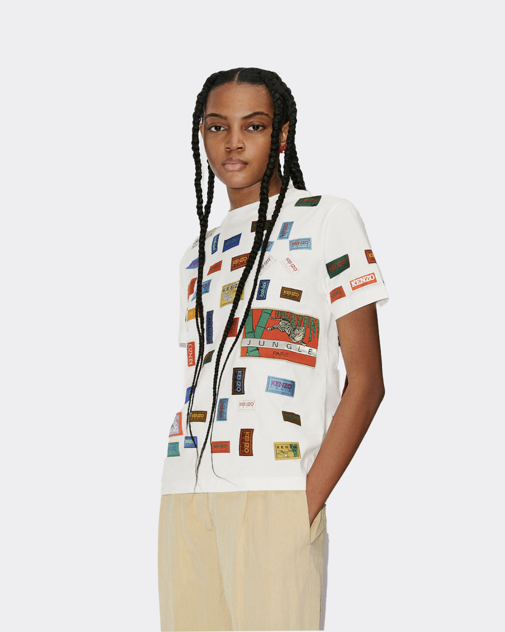 Witte T-shirt voor dames van het merk Kenzo. De Hoodie heeft Verschillende Kenzo Patches gestikt op het T-shirt.