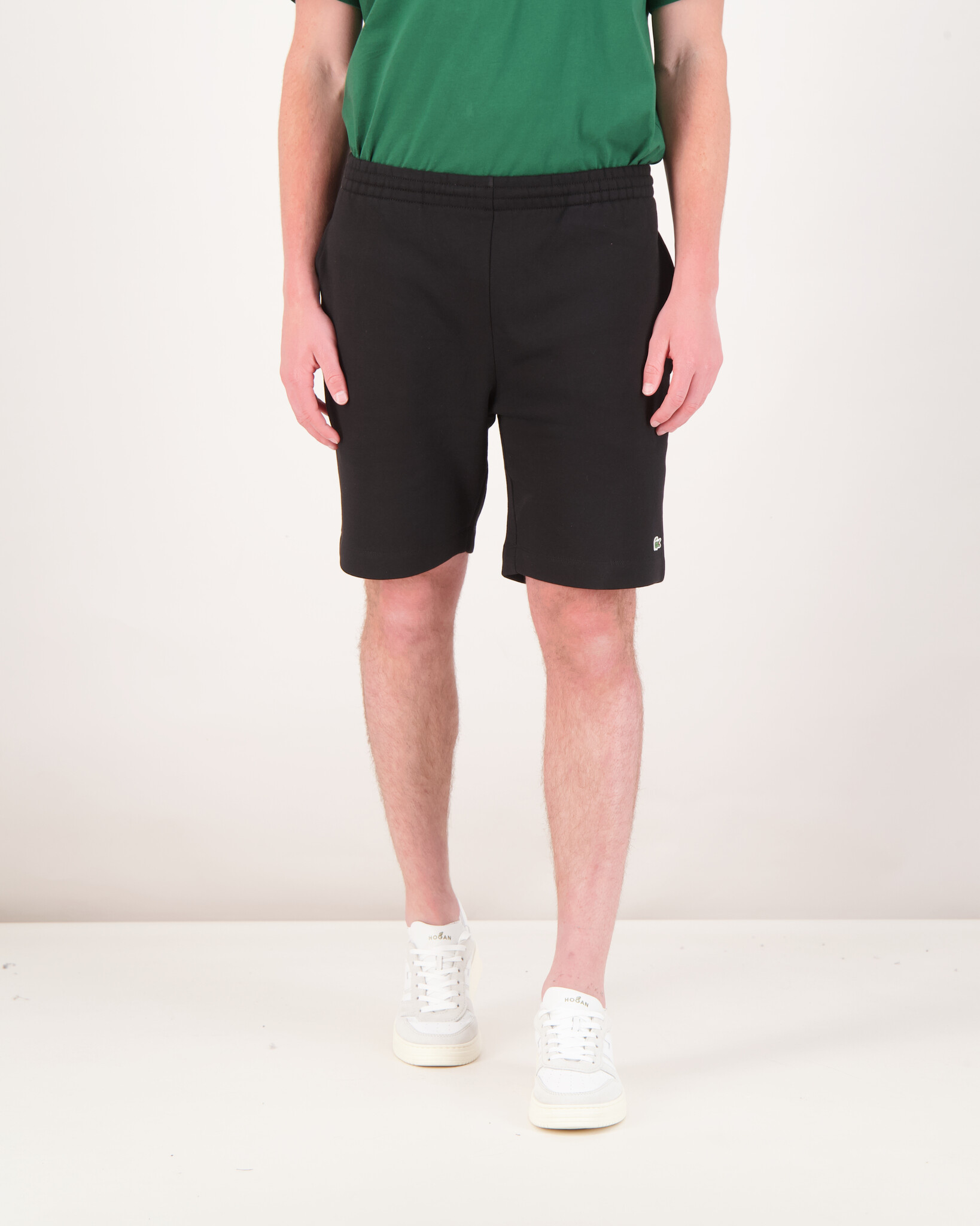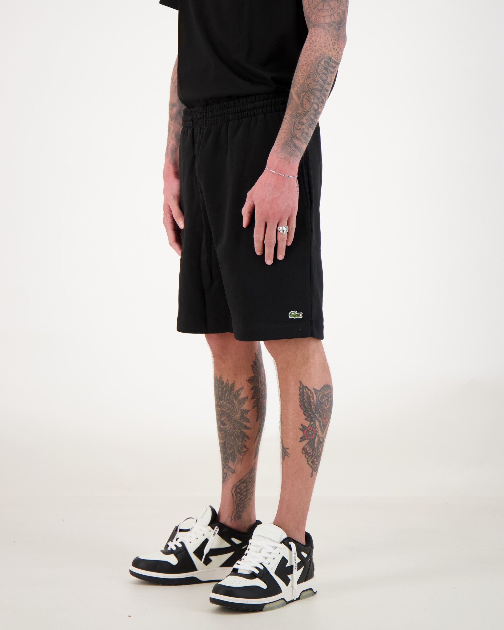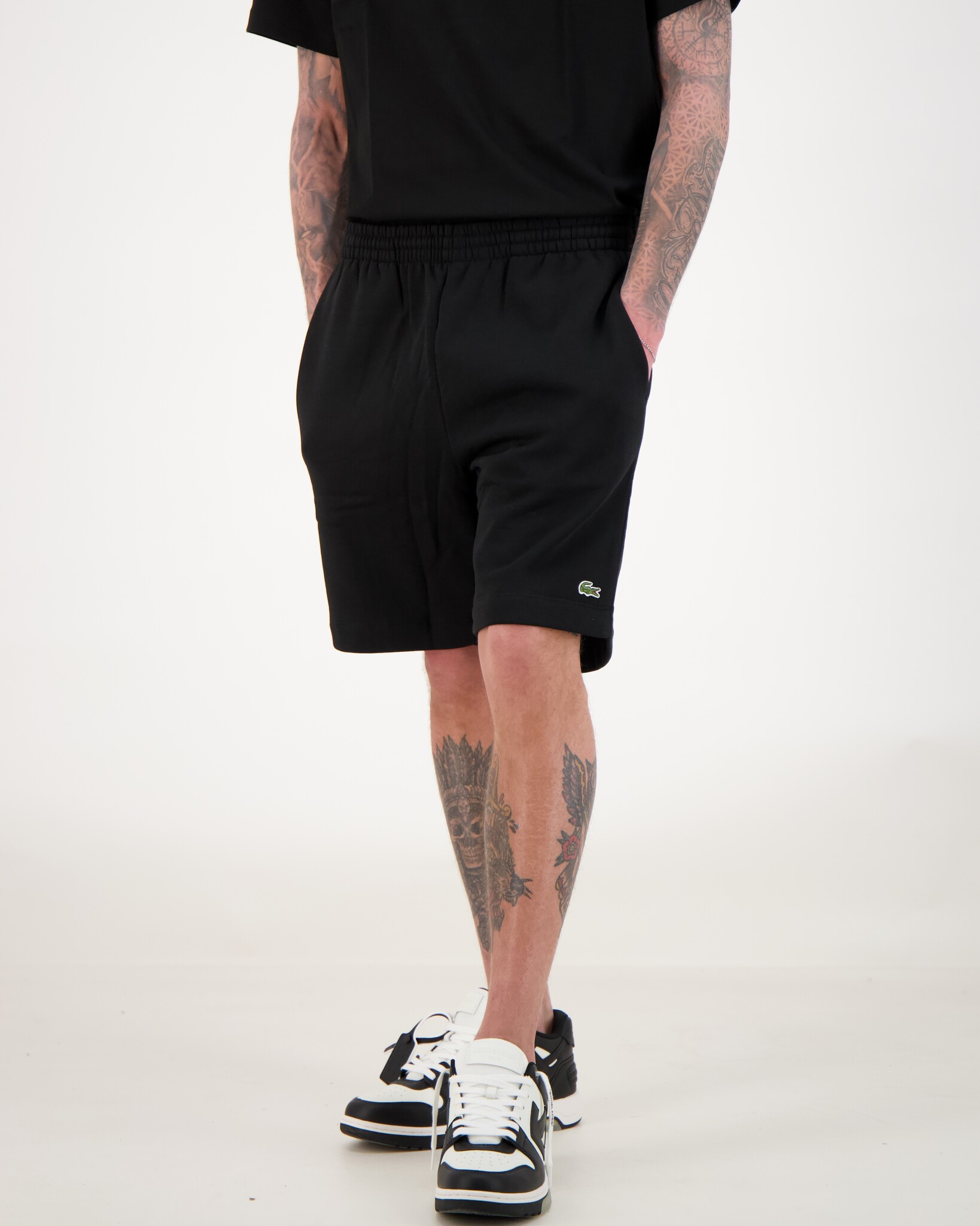 Zwarte 1HG1 Men's Shorts van het merk Lacoste. Deze korte joggingbroek heeft een aantrek koord en is voorzien van 2 steekzakken. Op het linkerbovenbeen staat het bekende krokodillen logo.