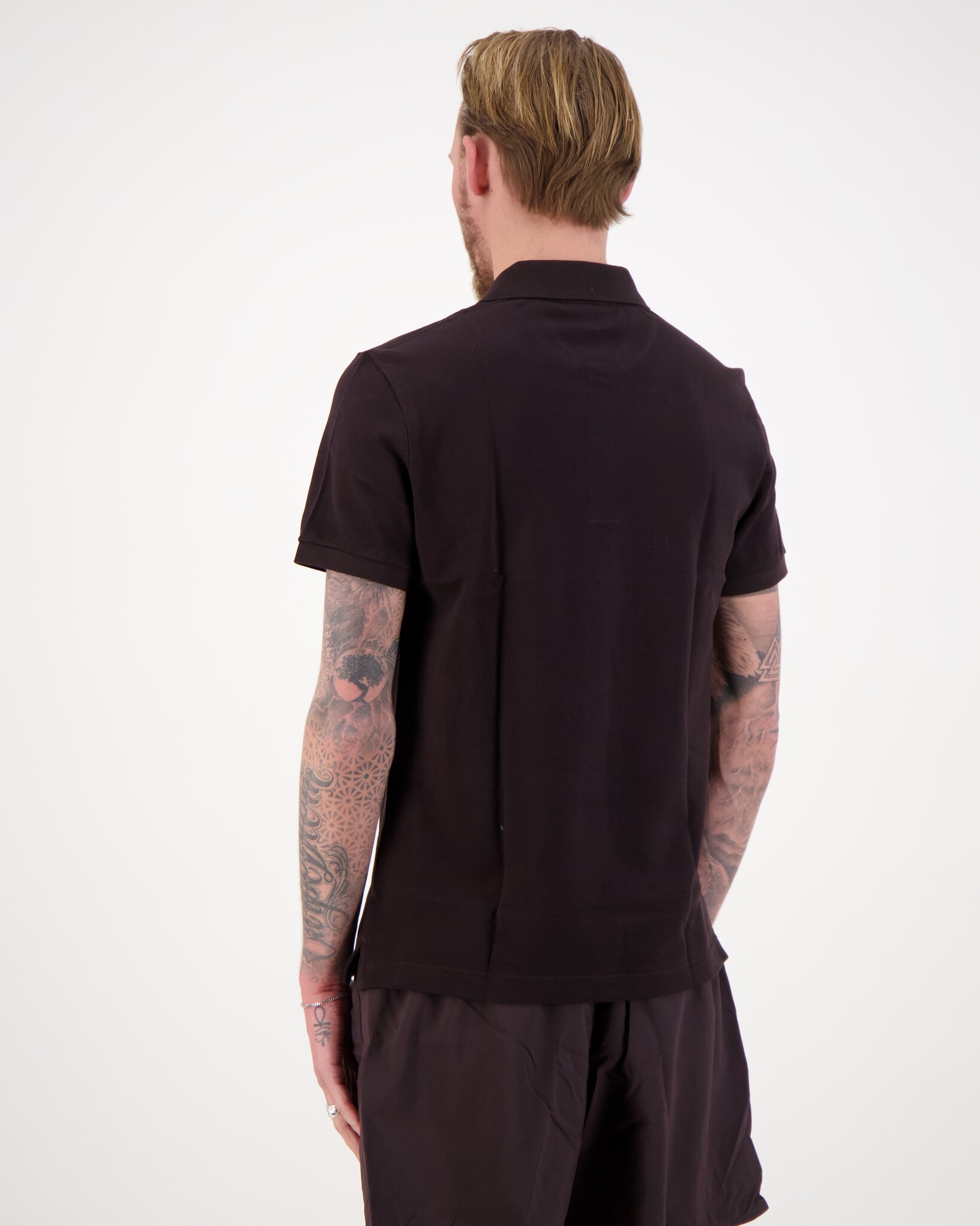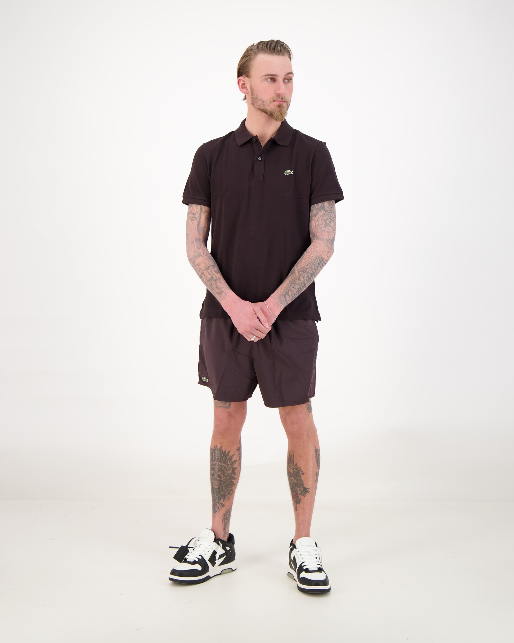 Bruin 1HP3 Men's S/S Polo van het merk Lacoste. De polo heeft een klassieke kraag met knoopsluiting, korte mouwen en op de borst een groen geborduurde krokodil.