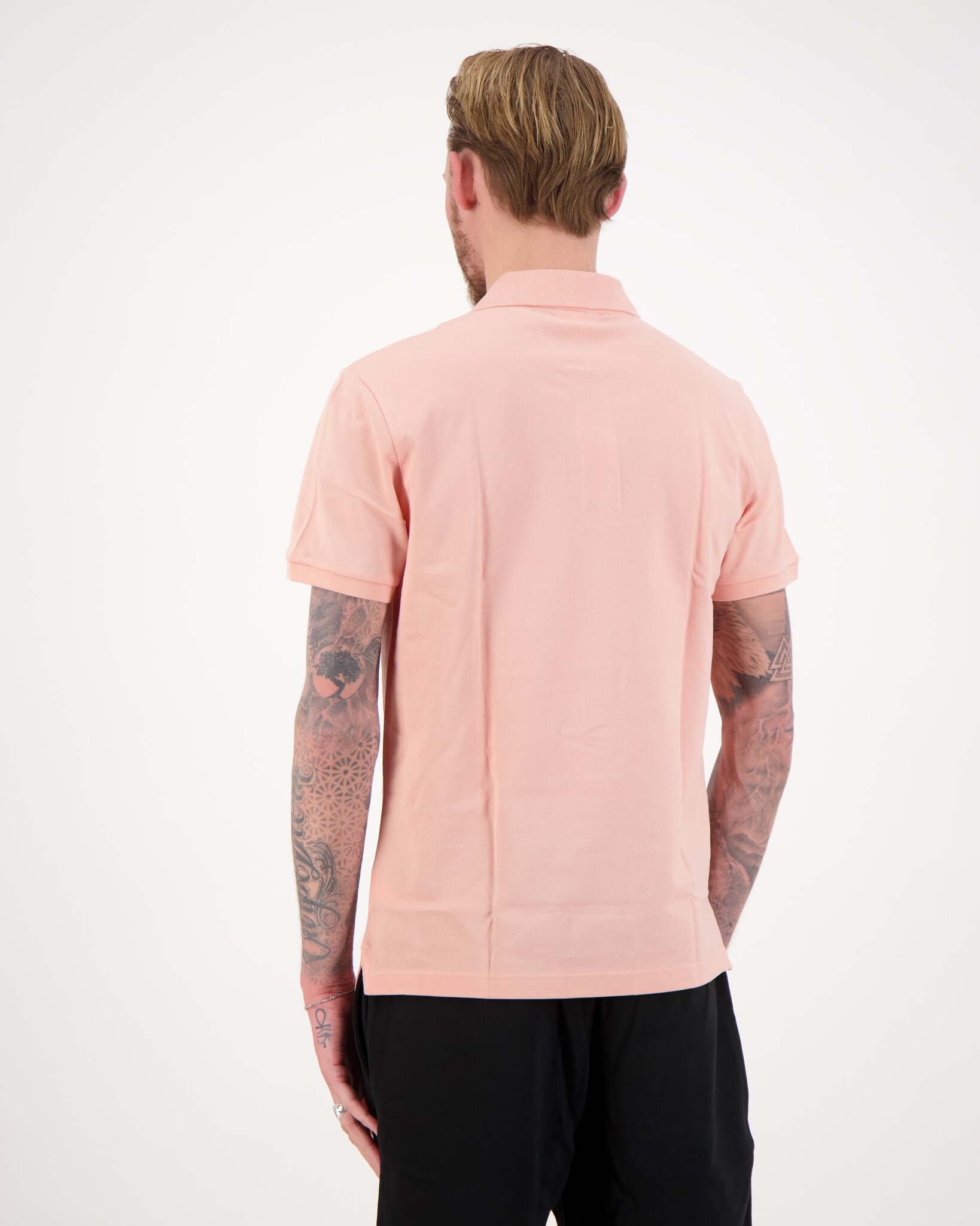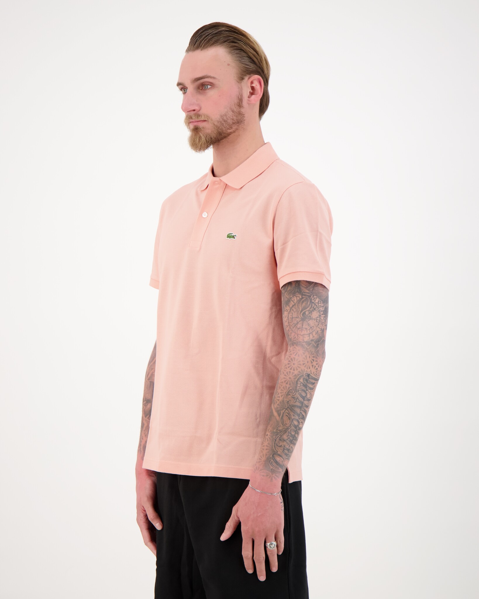 Roze 1HP3 Men's S/S Polo van het merk Lacoste. De polo heeft een klassieke kraag met knoopsluiting, korte mouwen en op de borst een groen geborduurde krokodil.