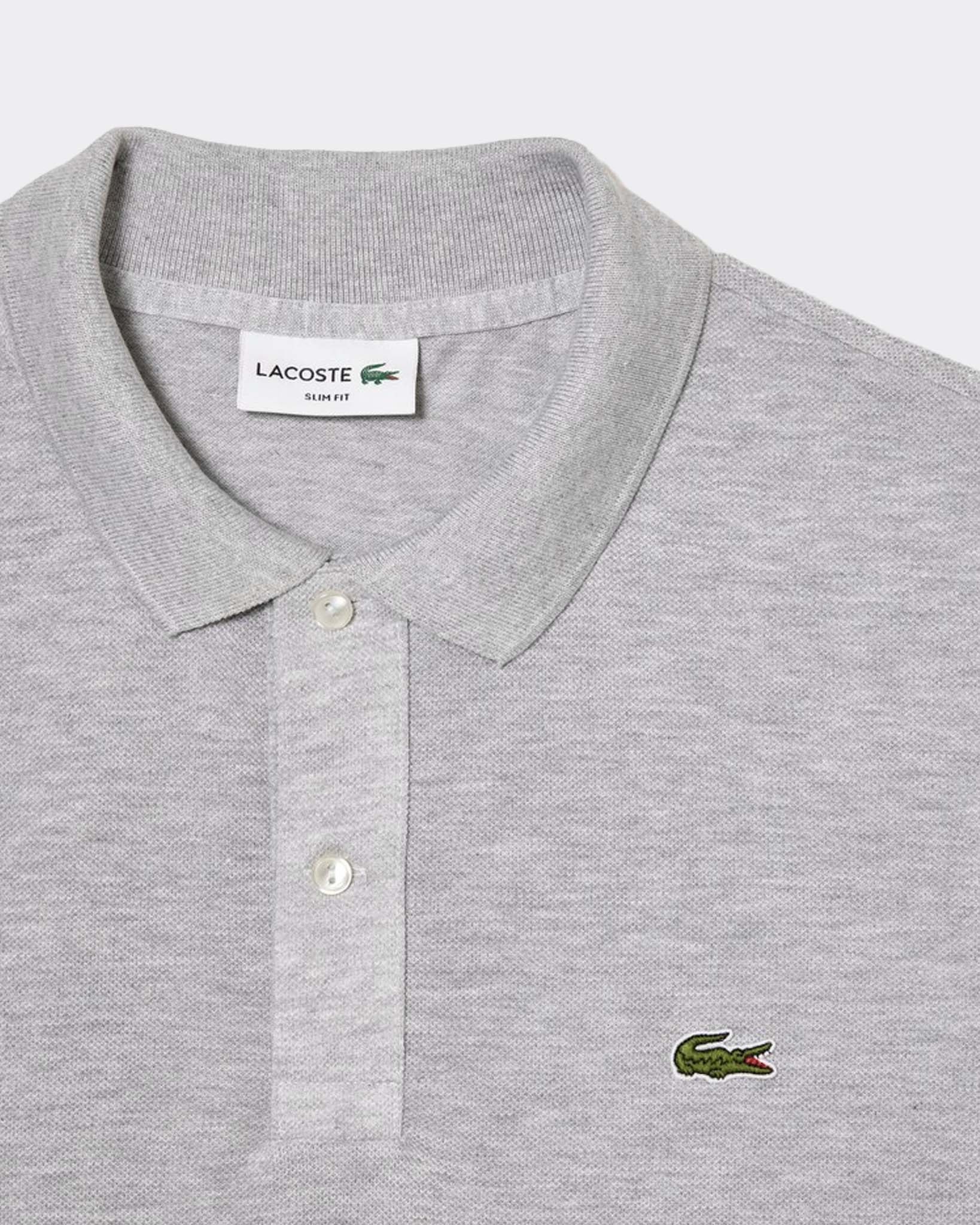 Grijze polo van het merk Lacoste. De polo heeft een klassieke kraag met 2 knopen, korte mouwen en op de borst een geborduurde krokodil.