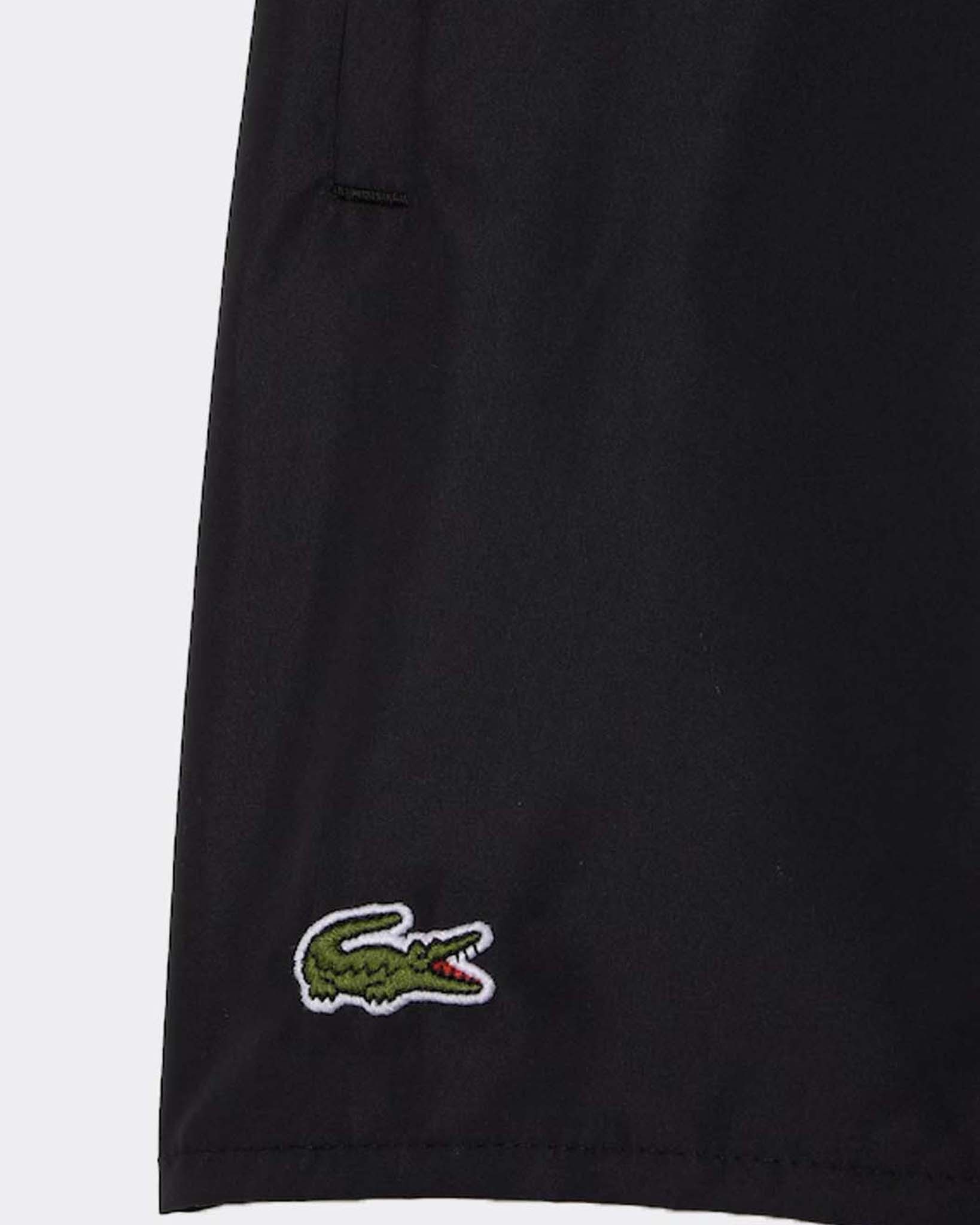 Zwarte Swim Shorts van het merk Lacoste. De zwembroek heeft een elastische taille band die aan de binnenkant Zwart is met aantrek koord, 2 steekzakken, een binnenbroekje van mesh en onderaan de broekspijp het bekende krokodil logo. De zwembroek is gemaakt van snel drogend materiaal.