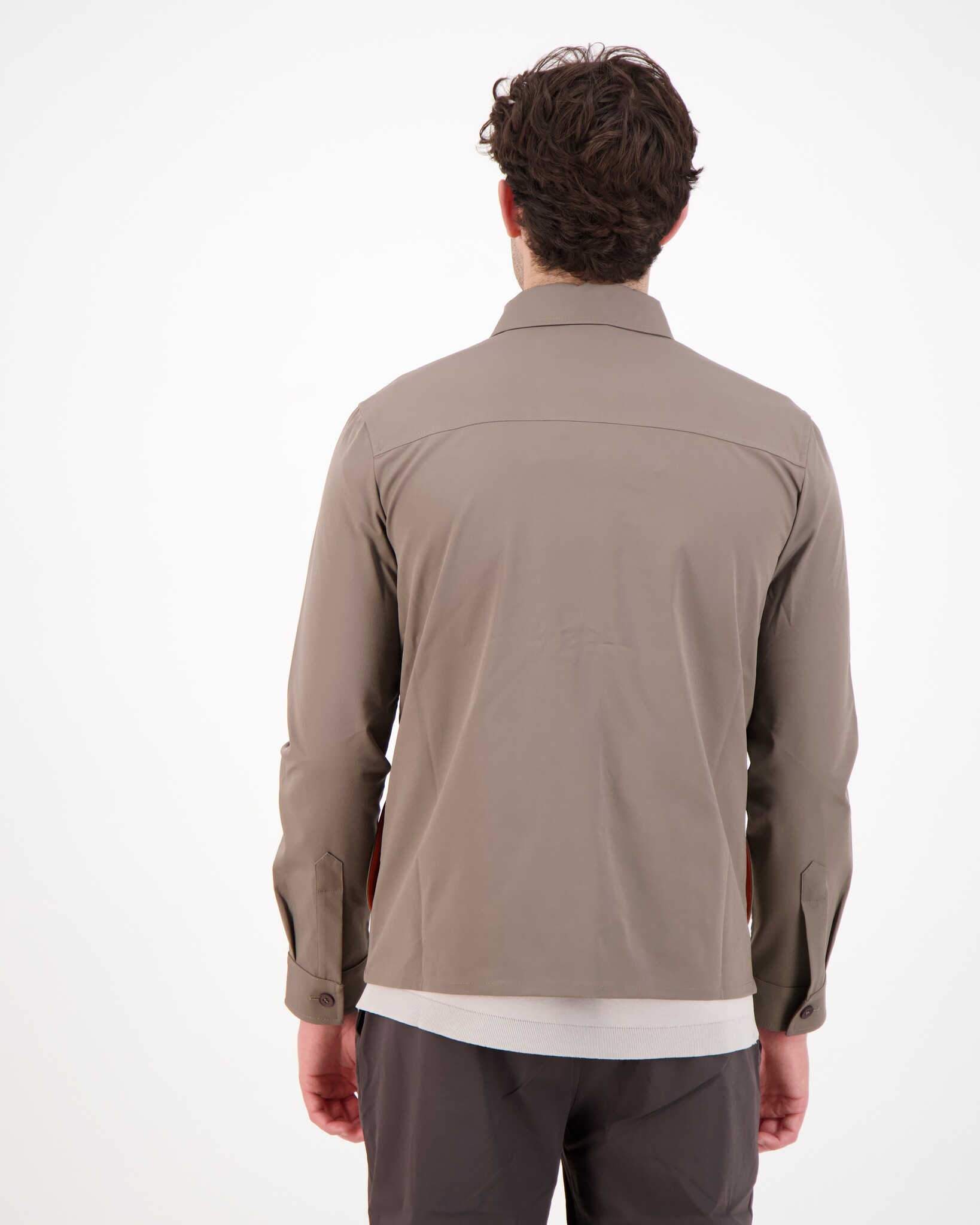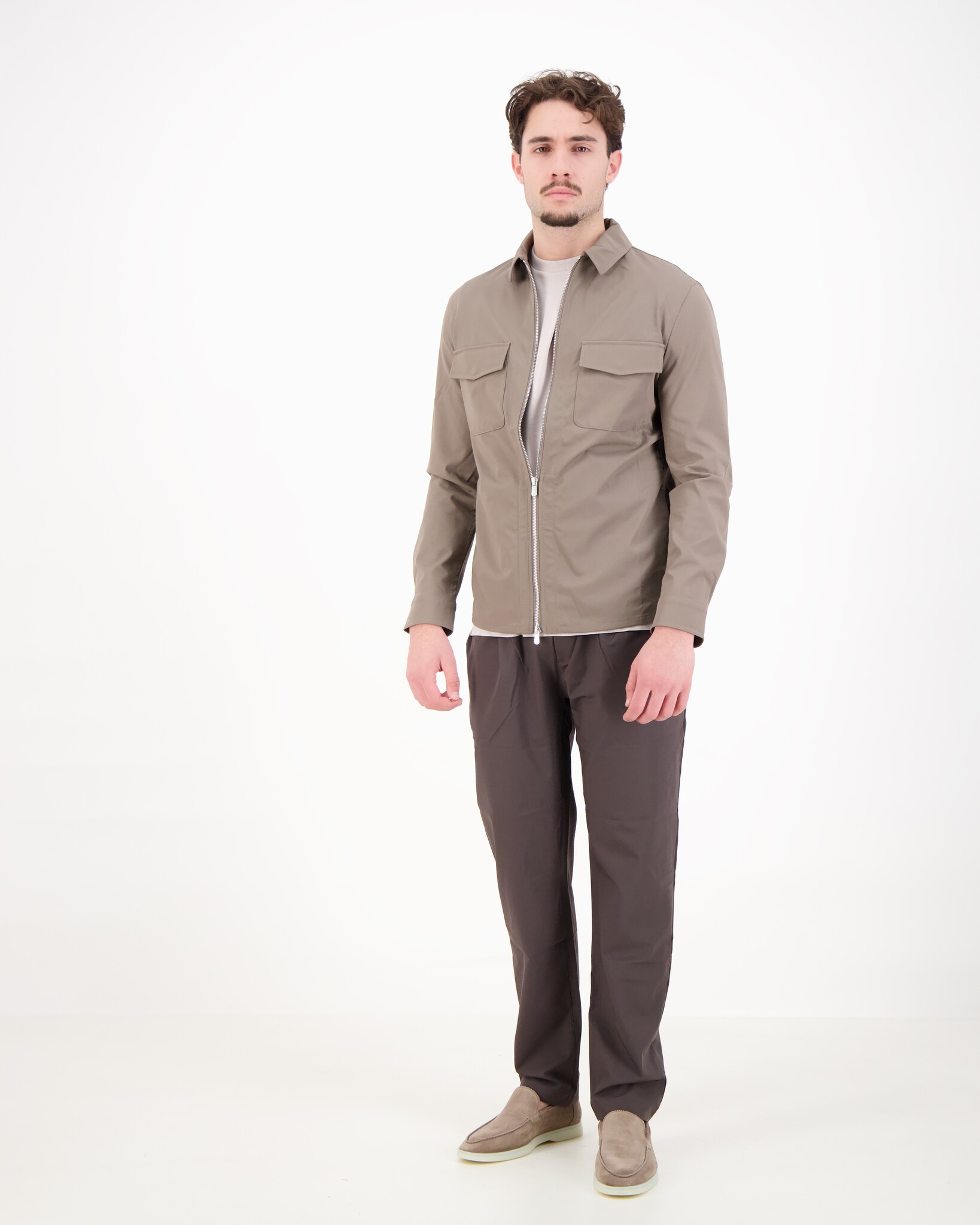 Taupe Urus Zip-Up Jacket van het merk Marco Pescarolo. Hele technische overshirt/jas met een mooie mix van polyester & elastaan. Heeft een klassieke kraag, 2 borstzakken en een hele cleane afwerking.