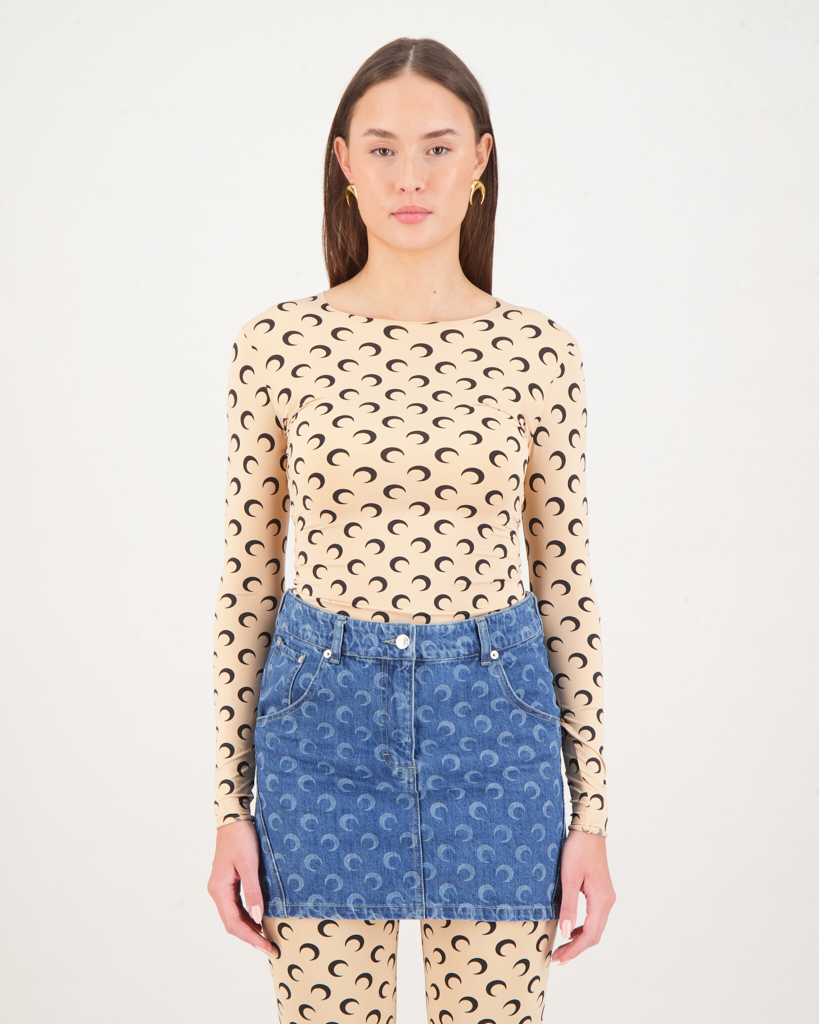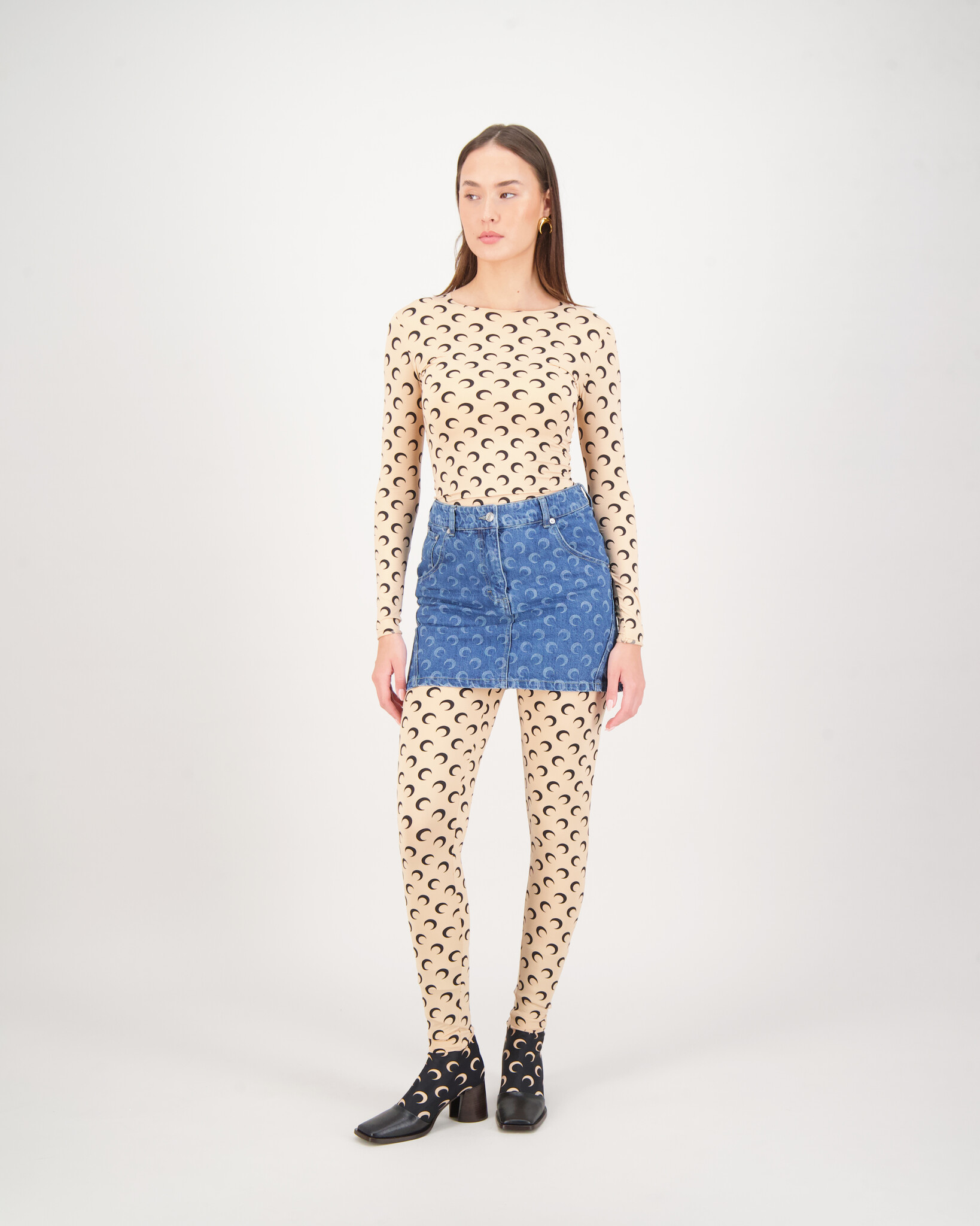 Blauwe Deadstock Denim Mini Skirt van het merk Marine Serre. Deze Rok heeft een allover print met Beige maantjes.