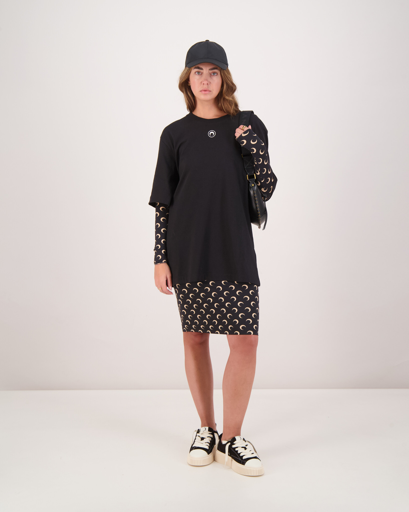 De “moon”-print is een herkenbaar design van Marine Serre: halvemaanvormen (of volledige) verspreid over het kledingstuk. Dit geeft een futuristische / grafische uitstraling. De rok zit strak/slank door het jersey-materiaal, en valt midi-lang (tot ongeveer midden van het onderbeen) wat elegant en stijlvol maakt.Het materiaal met elastaan zorgt voor stretch: comfortabel dragen, aansluitende pasvorm. Door de combinatie van Zwarte basis en Beige accenten krijg je een stijl die zowel opvallend als chic is.