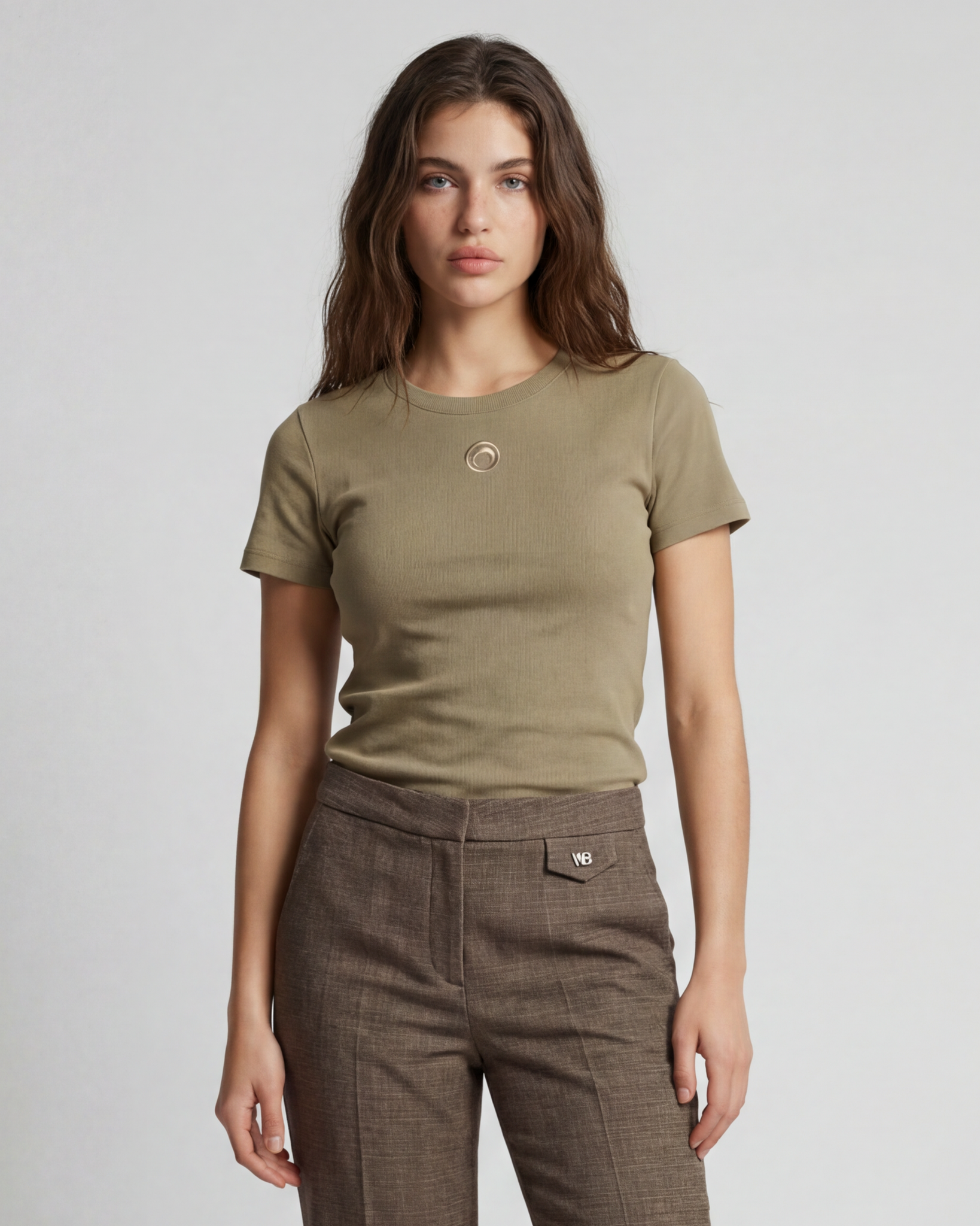 Taupe Moon Logo Baby Fit T-Shirt van het merk Marine Serre. De Moon Logo Baby Fit T-Shirt is een minimalistisch en stijlvol item met een moderne, aangesloten pasvorm. Het T-shirt heeft een baby fit silhouet met een ronde hals en korte mouwen, waardoor het mooi aansluit op het lichaam.