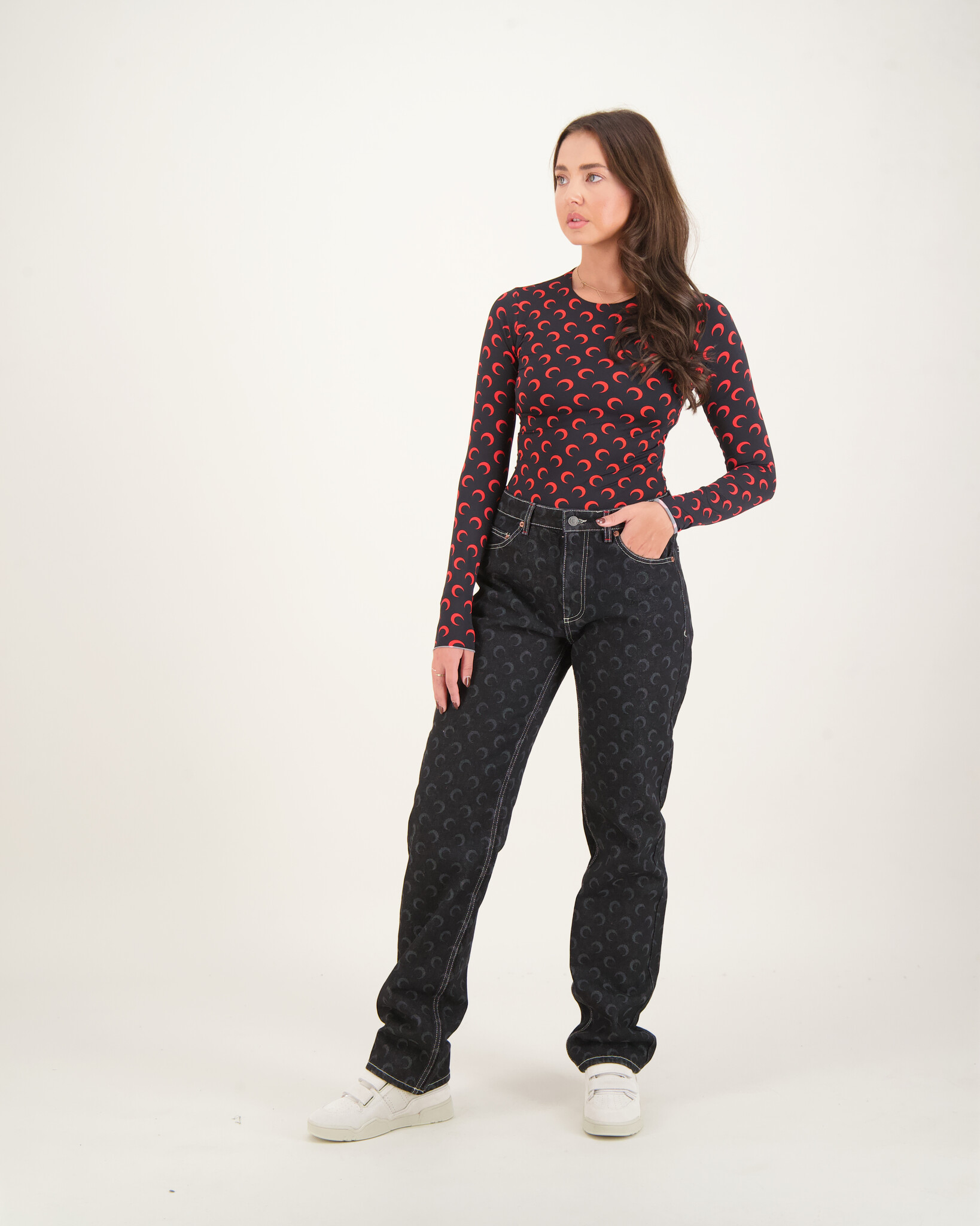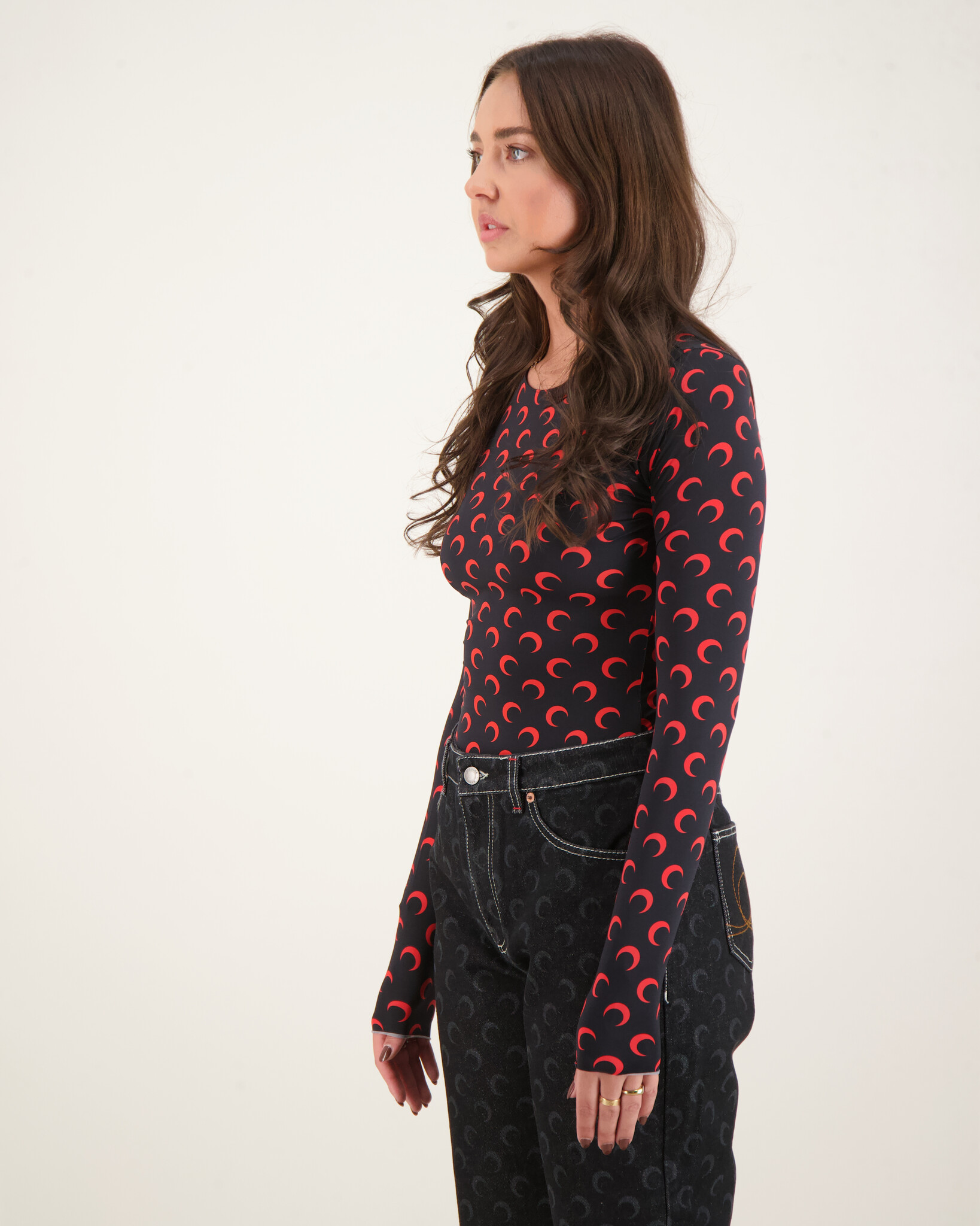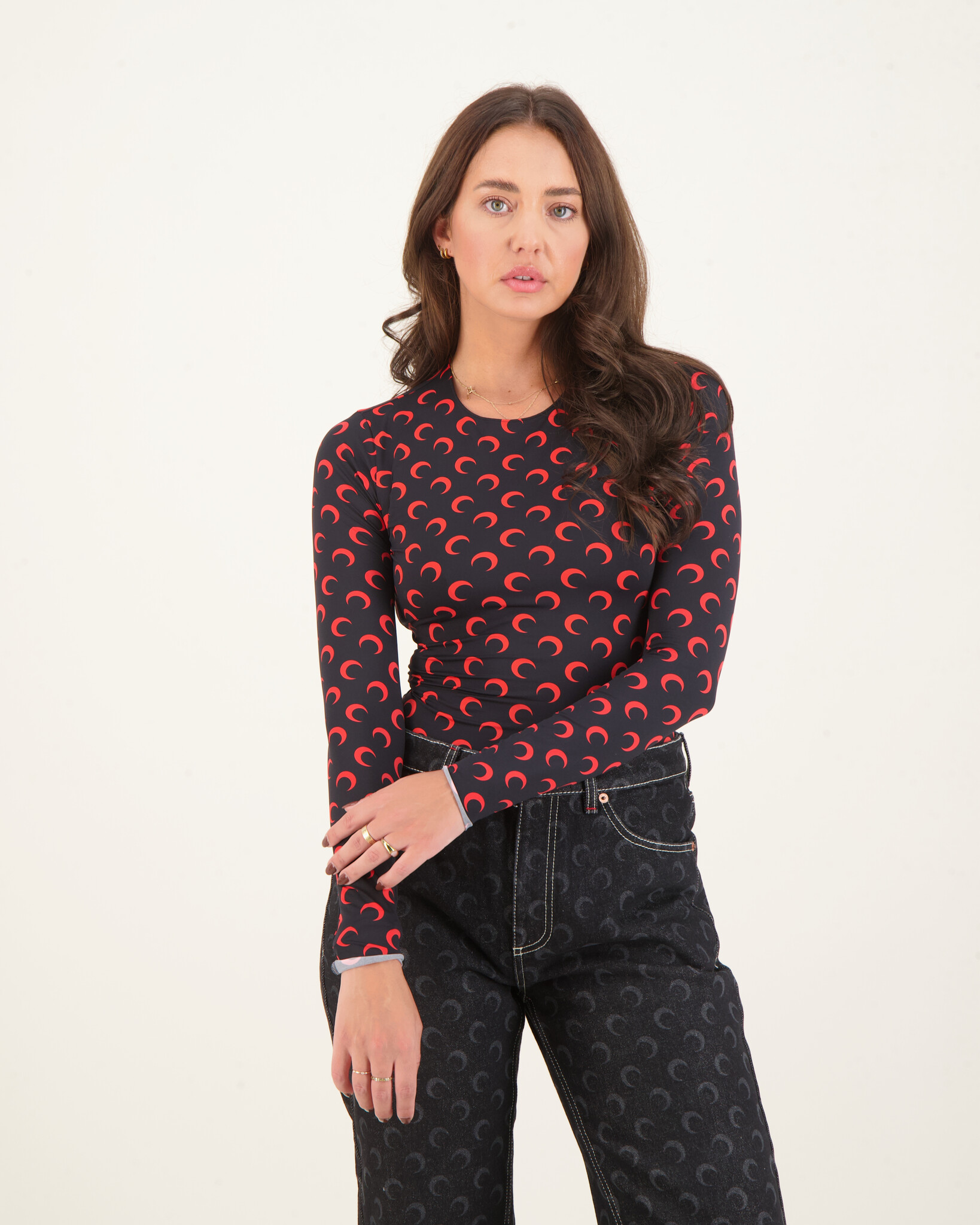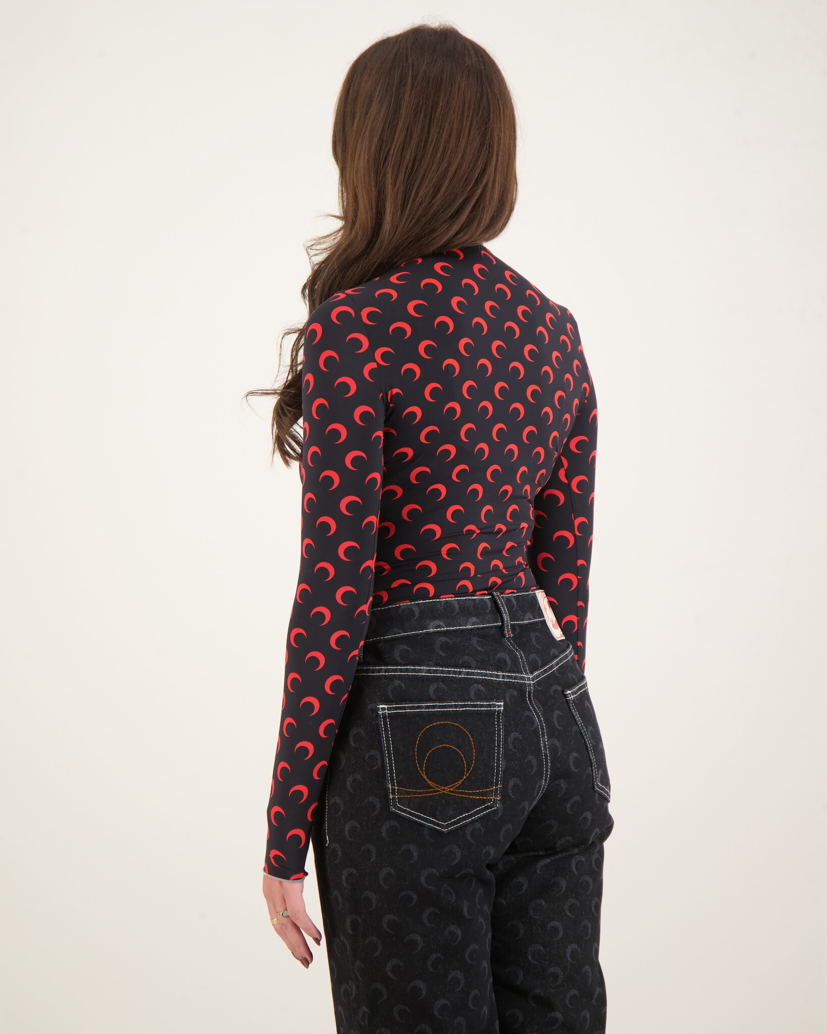 Zwart Moon Printed Jersey Second Skin Crewneck Top van het merk Marine Serre. Deze top heeft een allover print met Zwarte maantjes en een aangesloten hals.