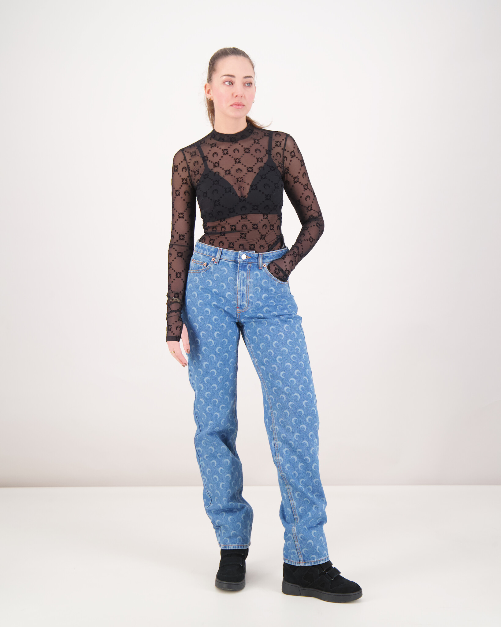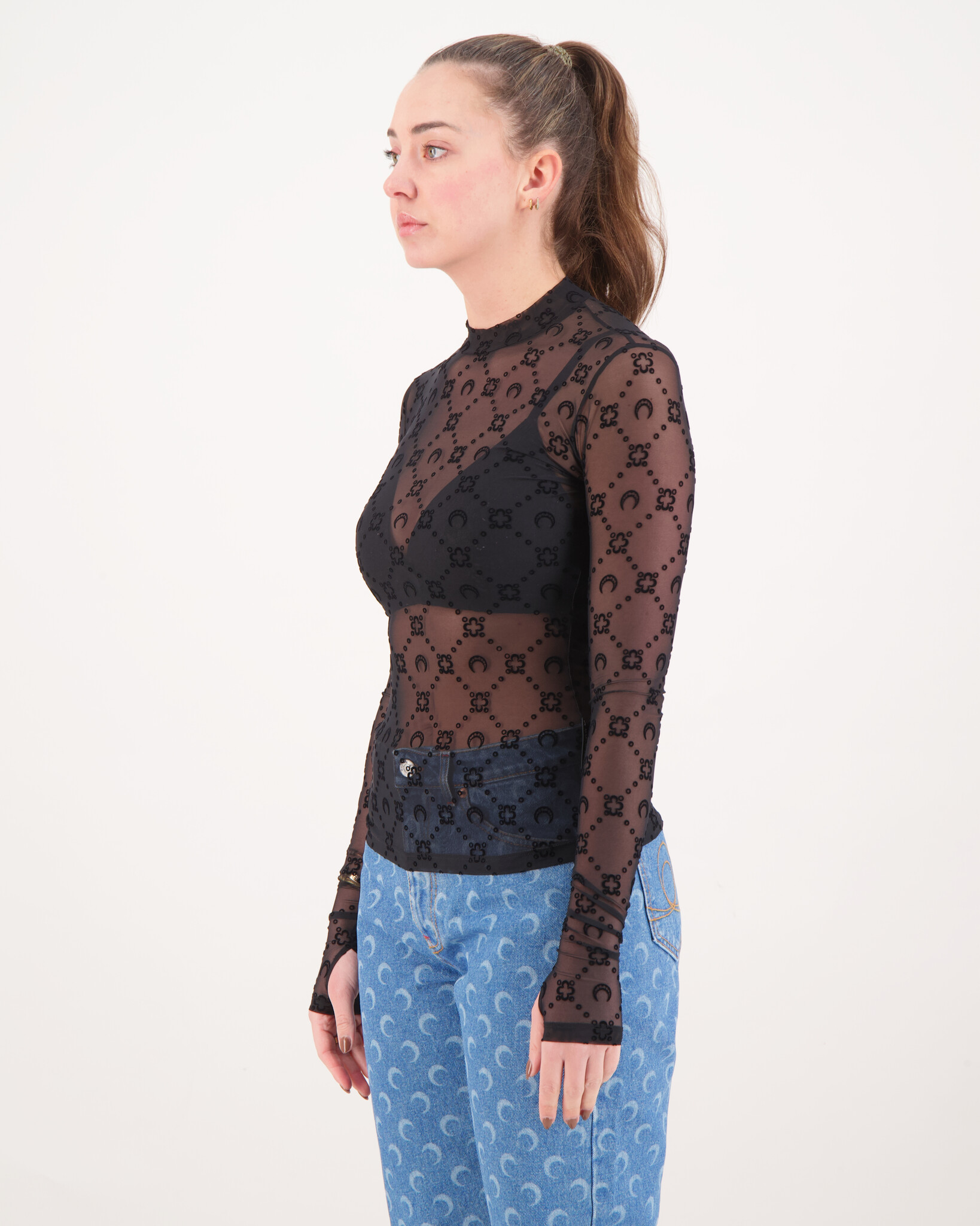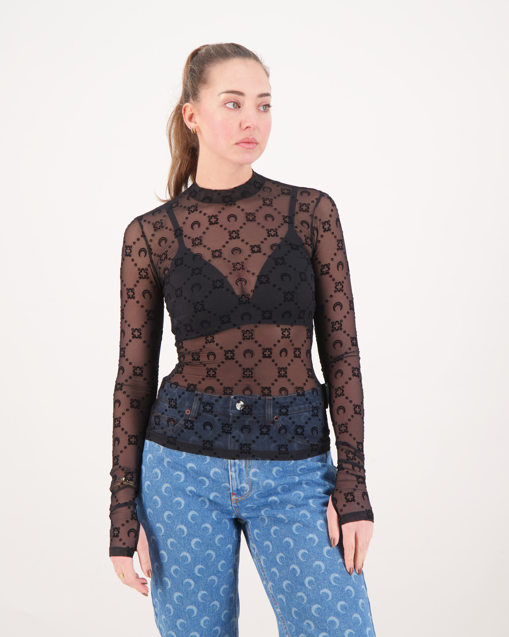 Zwarte Regenerated Moonogram Flock mesh Top van het merk Marine Serre. Deze top heeft een allover print met Flock maantjes.
