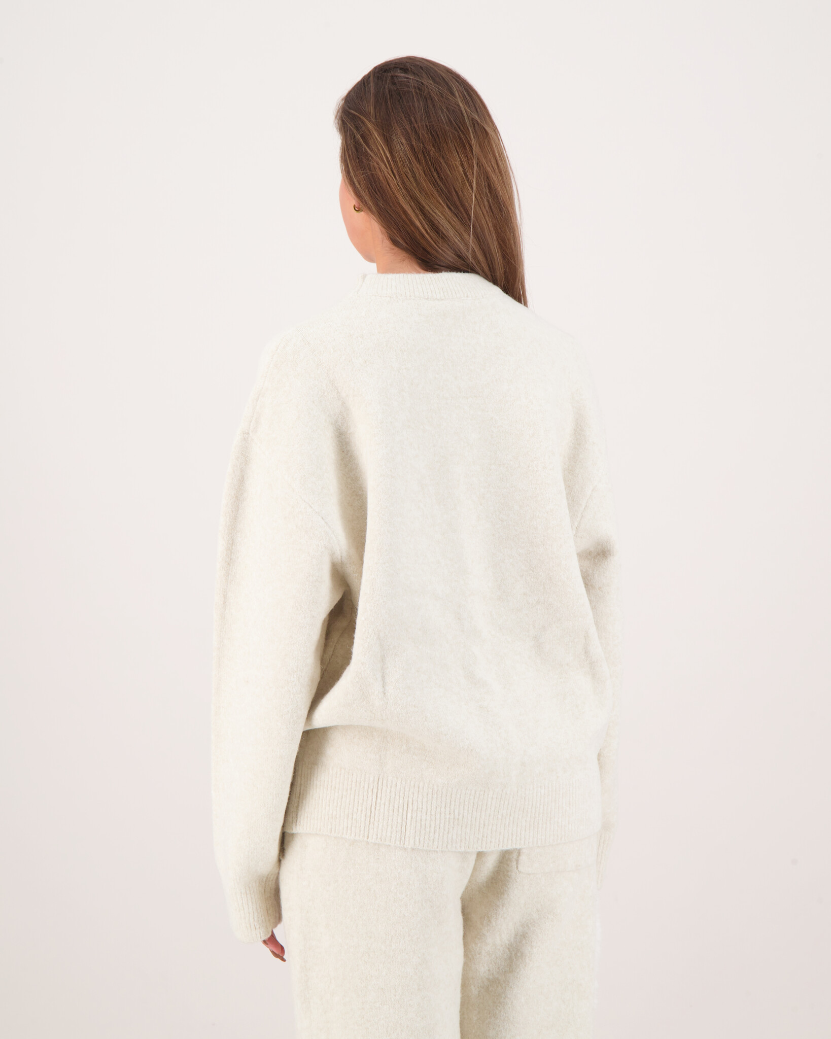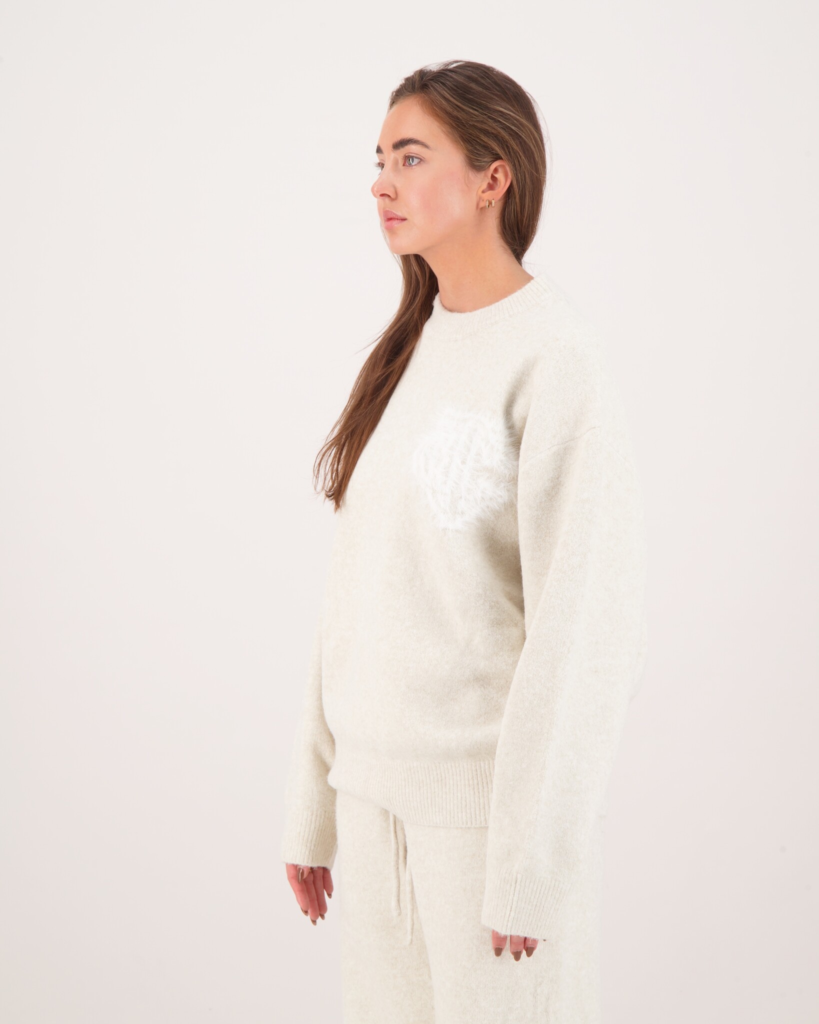 Beige Monogram Emblem Fluffy Knit Crewneck van het merk The Couture Club. De “fluffy knit” textuur geeft de trui een zachtere, cosy uitstraling — ideaal voor casual of “elevated casual” looks. Op de borst zit een “jacquard fluffy knit monogram emblem graphic” (oftewel een ingebreid monogram-embleem in dezelfde fluffy stijl). Geribde boorden aan mouwuiteinden en onderkant. De pasvorm is “relaxed” — dus niet strak/slim fit, maar met wat meer ruimte. Dit betekent dat hij comfortabeler zit.