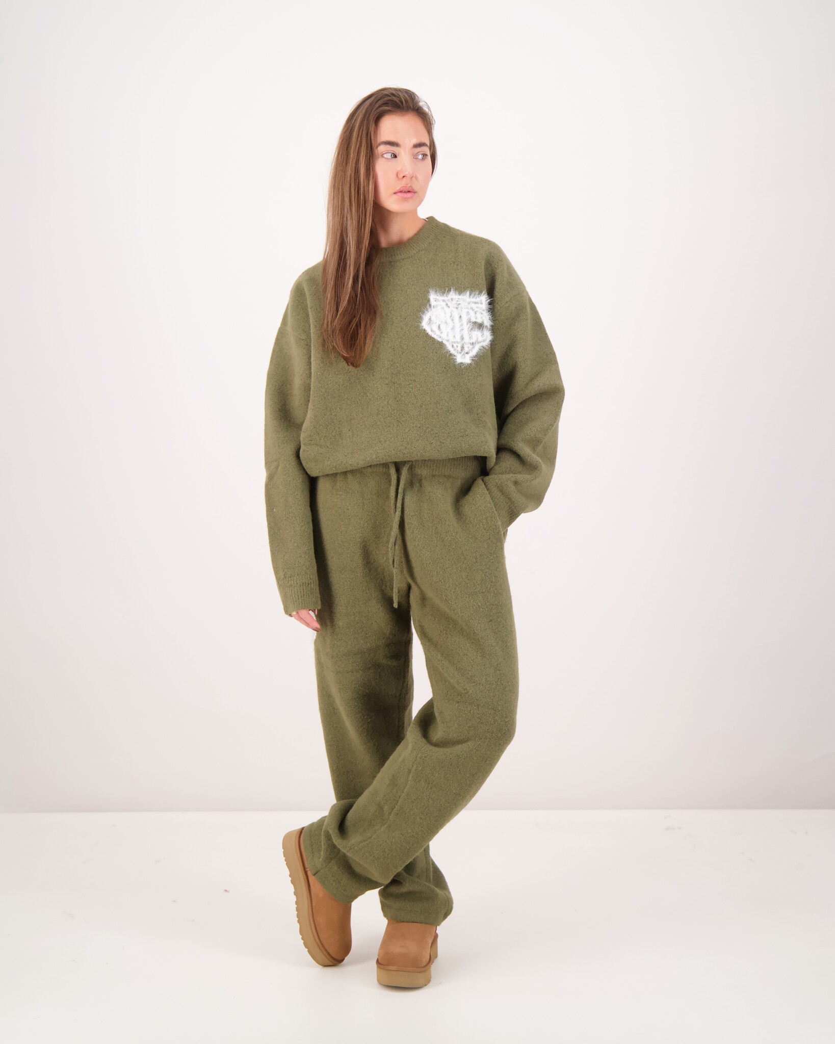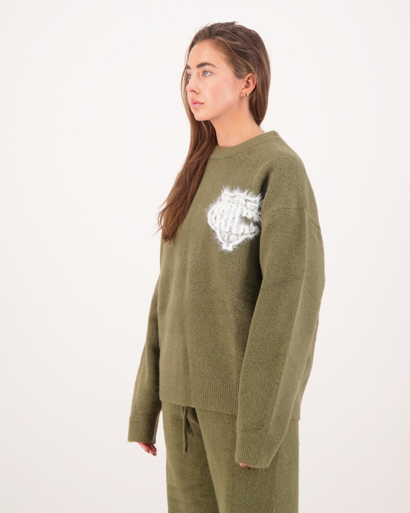 Khaki Monogram Emblem Fluffy Knit Crewneck van het merk The Couture Club. De “fluffy knit” textuur geeft de trui een zachtere, cosy uitstraling — ideaal voor casual of “elevated casual” looks. Op de borst zit een “jacquard fluffy knit monogram emblem graphic” (oftewel een ingebreid monogram-embleem in dezelfde fluffy stijl). Geribde boorden aan mouwuiteinden en onderkant. De pasvorm is “relaxed” — dus niet strak/slim fit, maar met wat meer ruimte. Dit betekent dat hij comfortabeler zit.