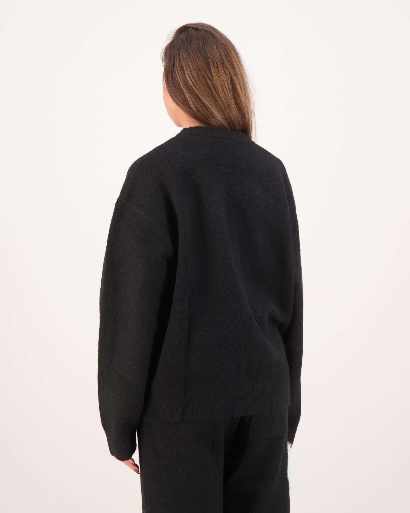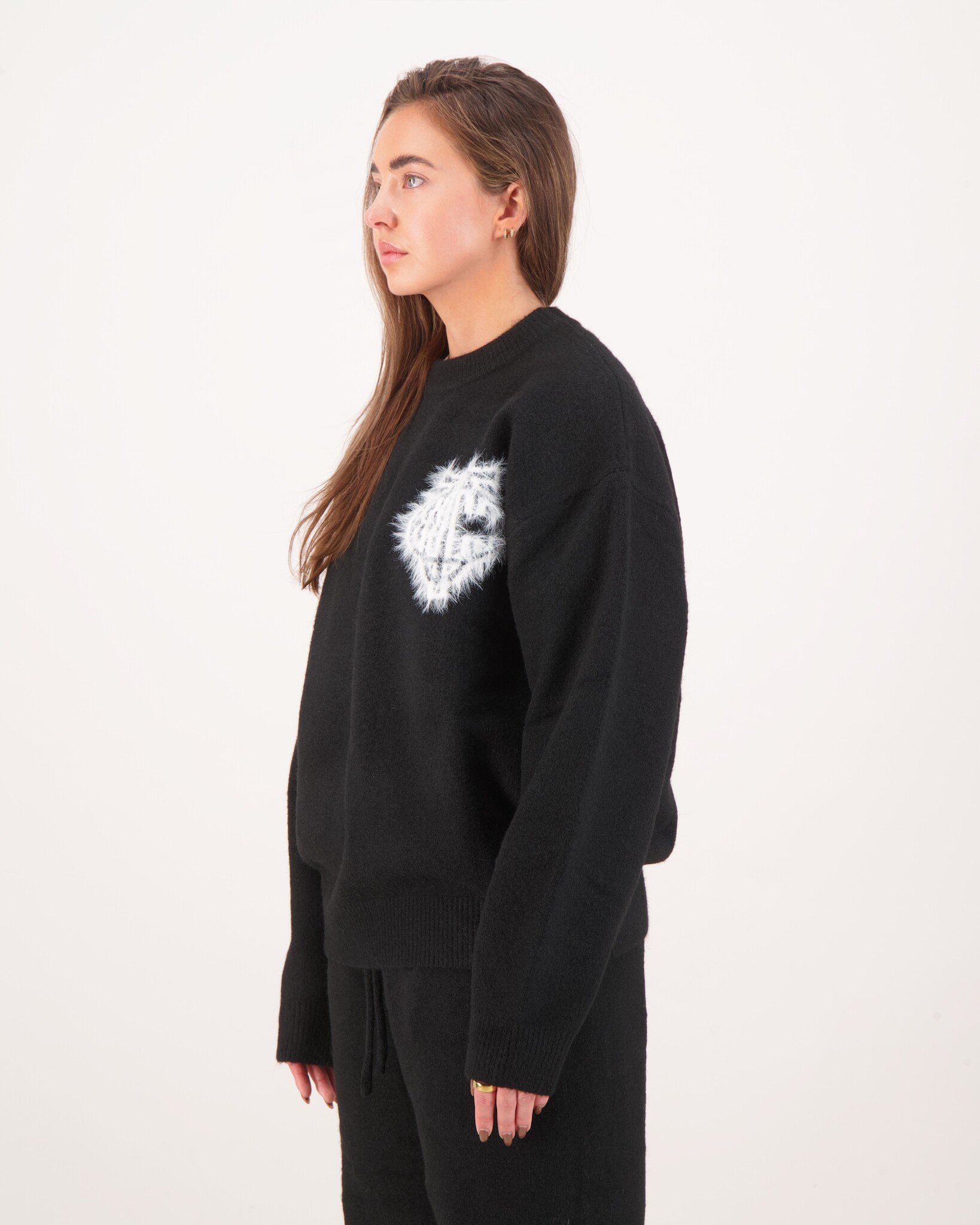 Zwart Monogram Emblem Fluffy Knit Crewneck van het merk The Couture Club. De “fluffy knit” textuur geeft de trui een zachtere, cosy uitstraling — ideaal voor casual of “elevated casual” looks. Op de borst zit een “jacquard fluffy knit monogram emblem graphic” (oftewel een ingebreid monogram-embleem in dezelfde fluffy stijl). Geribde boorden aan mouwuiteinden en onderkant. De pasvorm is “relaxed” — dus niet strak/slim fit, maar met wat meer ruimte. Dit betekent dat hij comfortabeler zit.