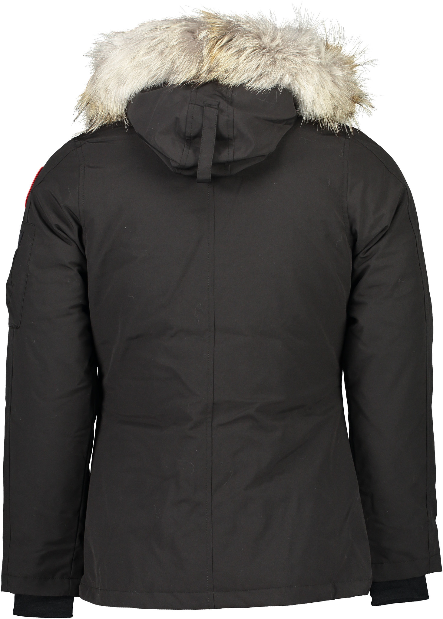 •Een met donsgevoerde capuchon met afneembare bontkraag