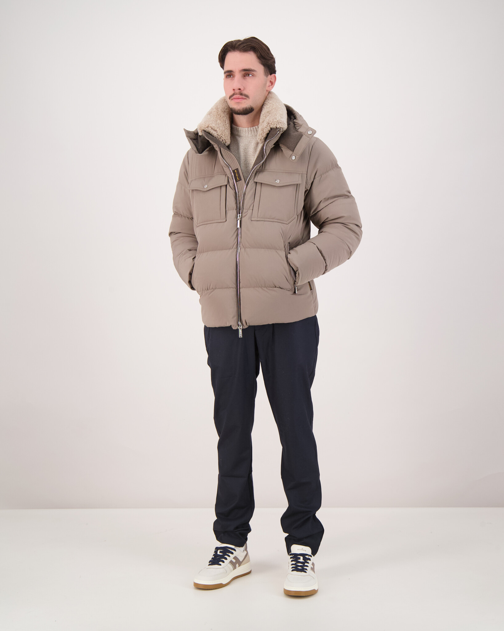 Een stijlvolle en functionele lichtgewatteerde jas van Moorer, uitgevoerd in zachte materialen met een matte look. Het ademende materiaal is licht waterafstotend, waardoor je beschermd blijft bij wisselvallig weer. Het ontwerp bevat een capuchon met verstelbare trekkoord, dubbele ritssluiting, en zowel binnen- als buitenzakken voor praktische draaggemak. De pasvorm is modern en slank, met verstelbare manchetten en zoom voor een gepersonaliseerd silhouet.