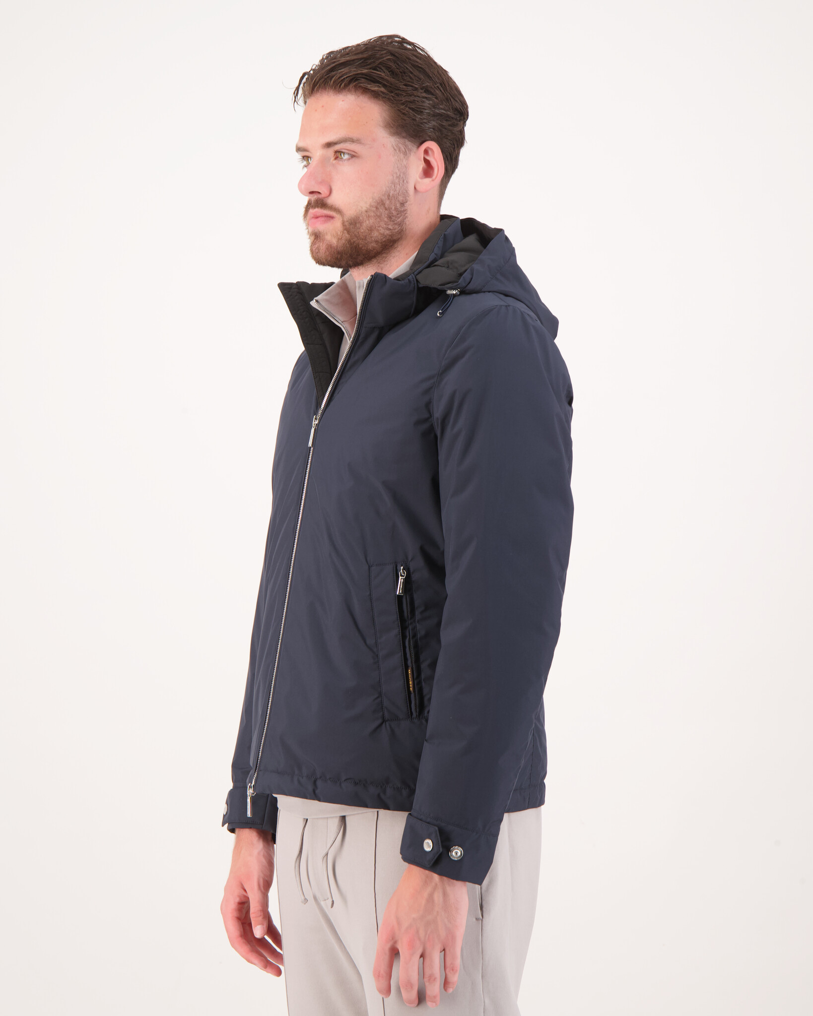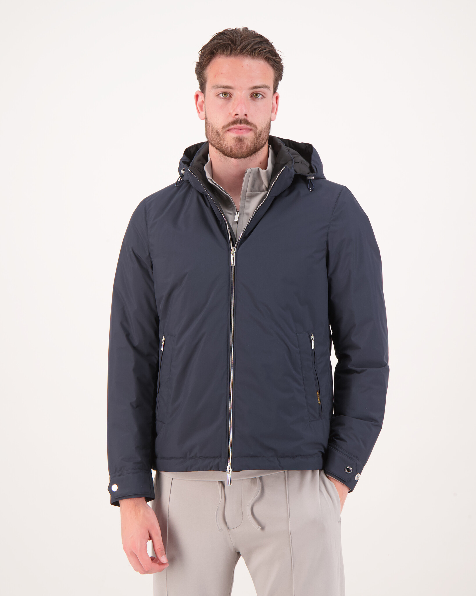 Een stijlvolle en functionele lichtgewatteerde jas van Moorer, uitgevoerd in zachte materialen met een matte look. Het ademende materiaal is licht waterafstotend, waardoor je beschermd blijft bij wisselvallig weer. Het ontwerp bevat een capuchon met verstelbare trekkoord, dubbele ritssluiting, en zowel binnen- als buitenzakken voor praktische draaggemak. De pasvorm is modern en slank, met verstelbare manchetten en zoom voor een gepersonaliseerd silhouet.