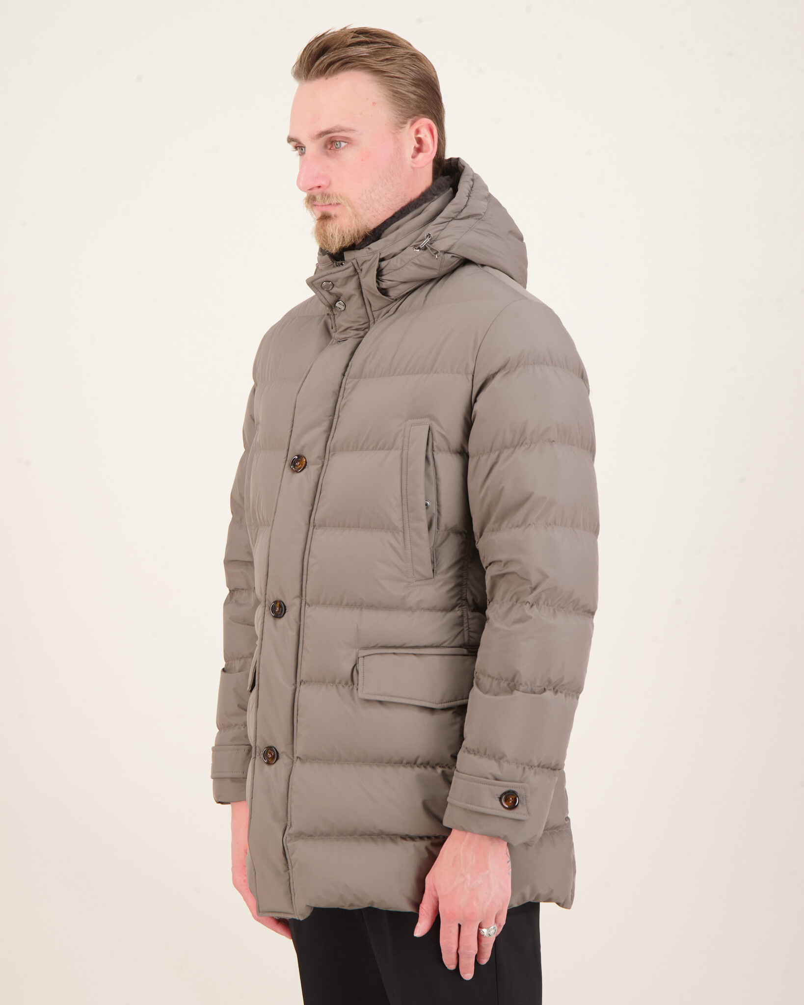 Bruine 'Saturno-STP Jacket' van het merk MooRER. De Jacket heeft Verticale handwarmerzakken op de borst met metalen ritsen, paspelzakken met klep aan de zijkanten. Dubbele voorsluiting bestaande uit geborsteld metalen dubbele glijderrits en hoornen knopen. Binnenkraag versierd met afneembare bontrand, afneembare, verstelbare capuchon aan de kraag bevestigd met zichtbare drukknopen. Voering gewatteerd aan de achterkant. Handige binnenzakken voor waardevolle spullen.