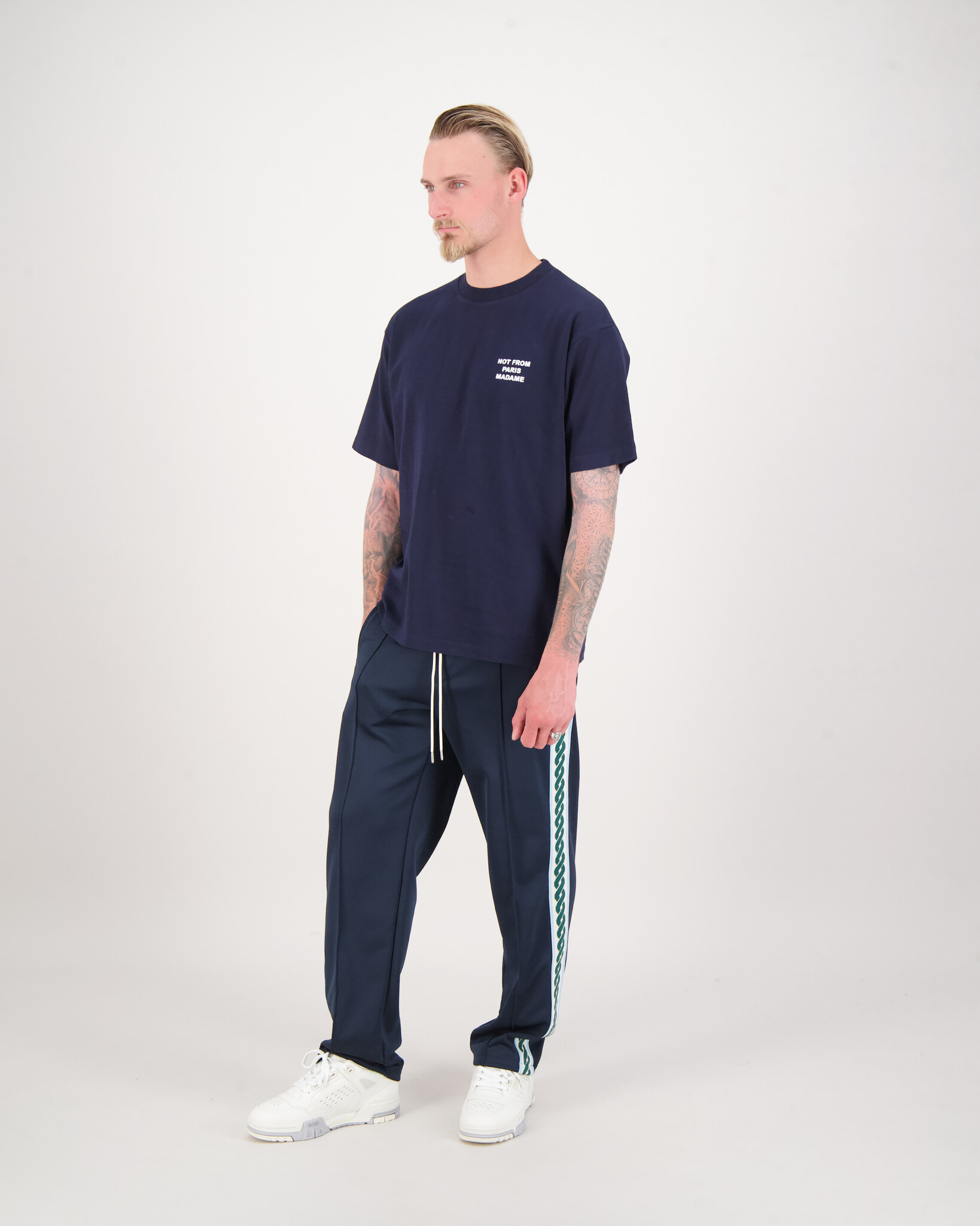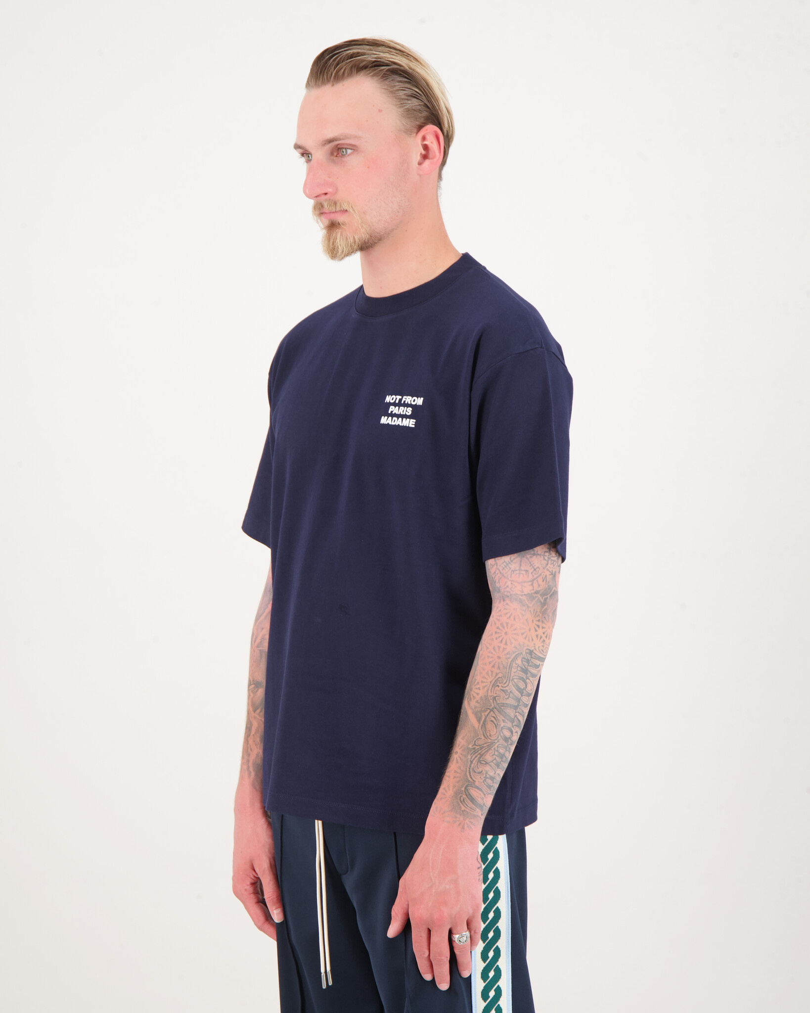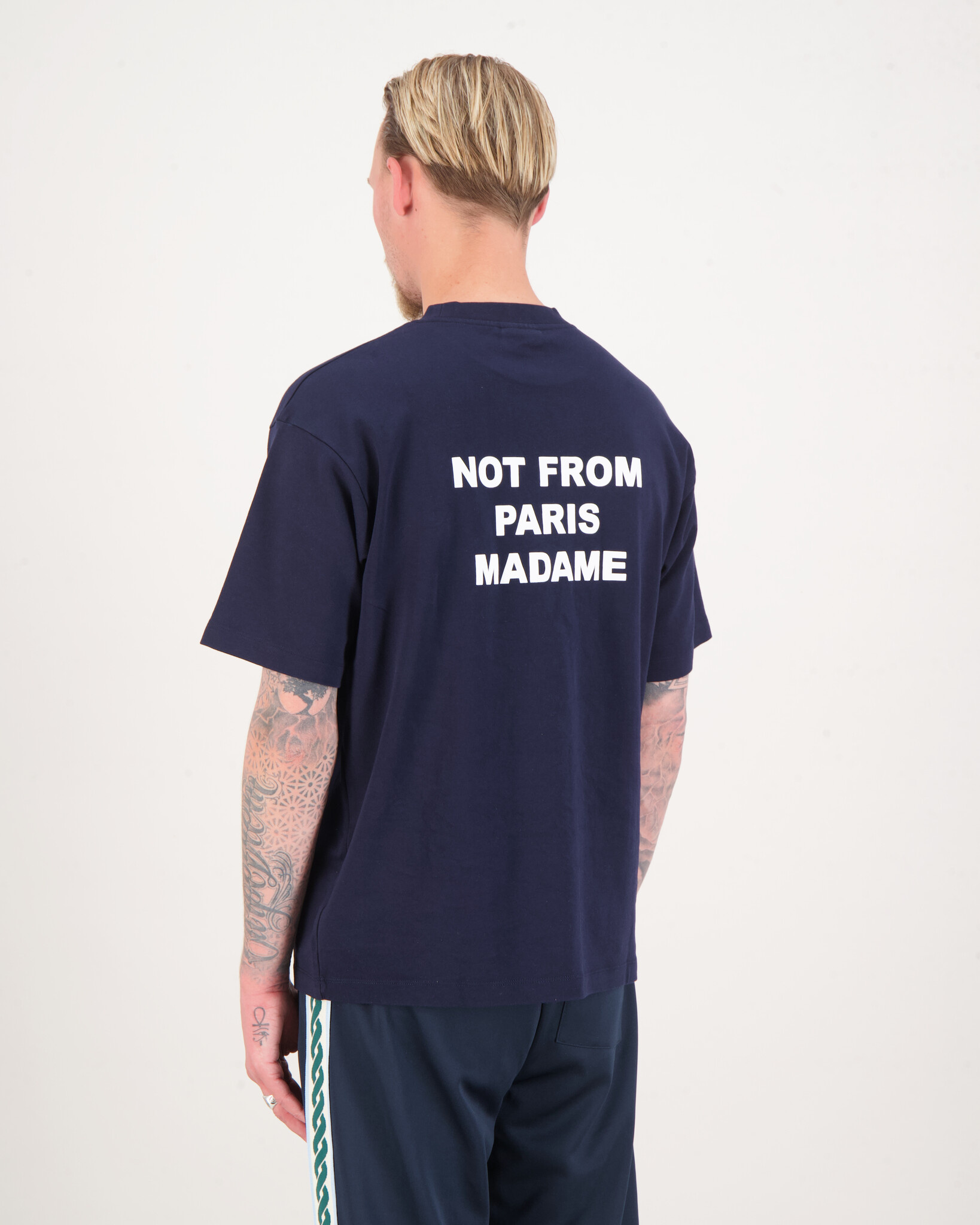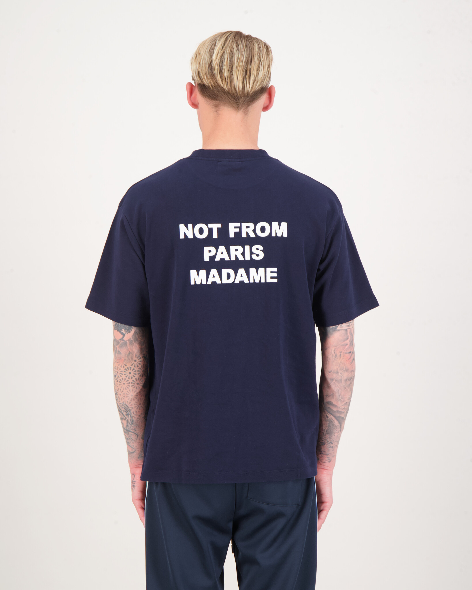 Marine 'Le T-Shirt Slogan' van het merk Drôle de Monsieur. Het t-shirt met een geribde halslijn is bedrukt met de 'Not From Paris Madame' slogan.